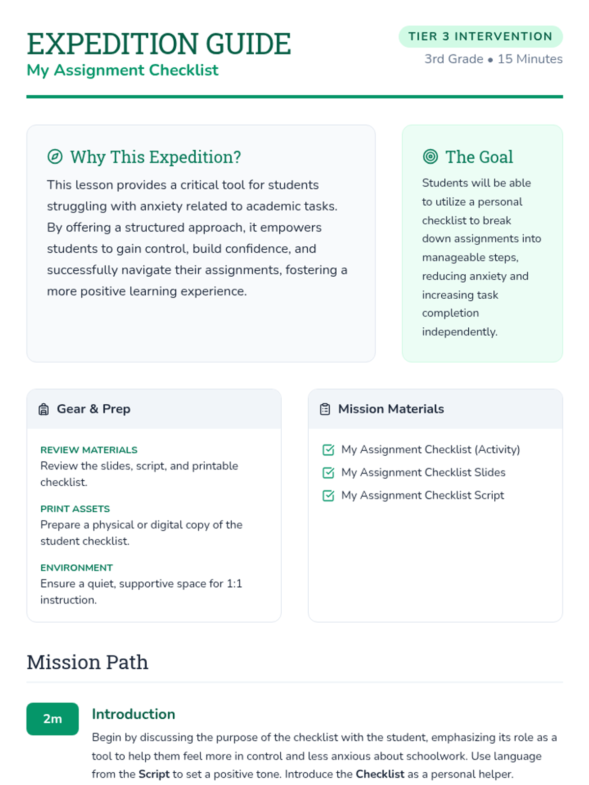 A Tier 3 intervention lesson designed to help a 3rd-grade student manage anxiety and break down school assignments into manageable, stress-free steps using a personalized checklist.