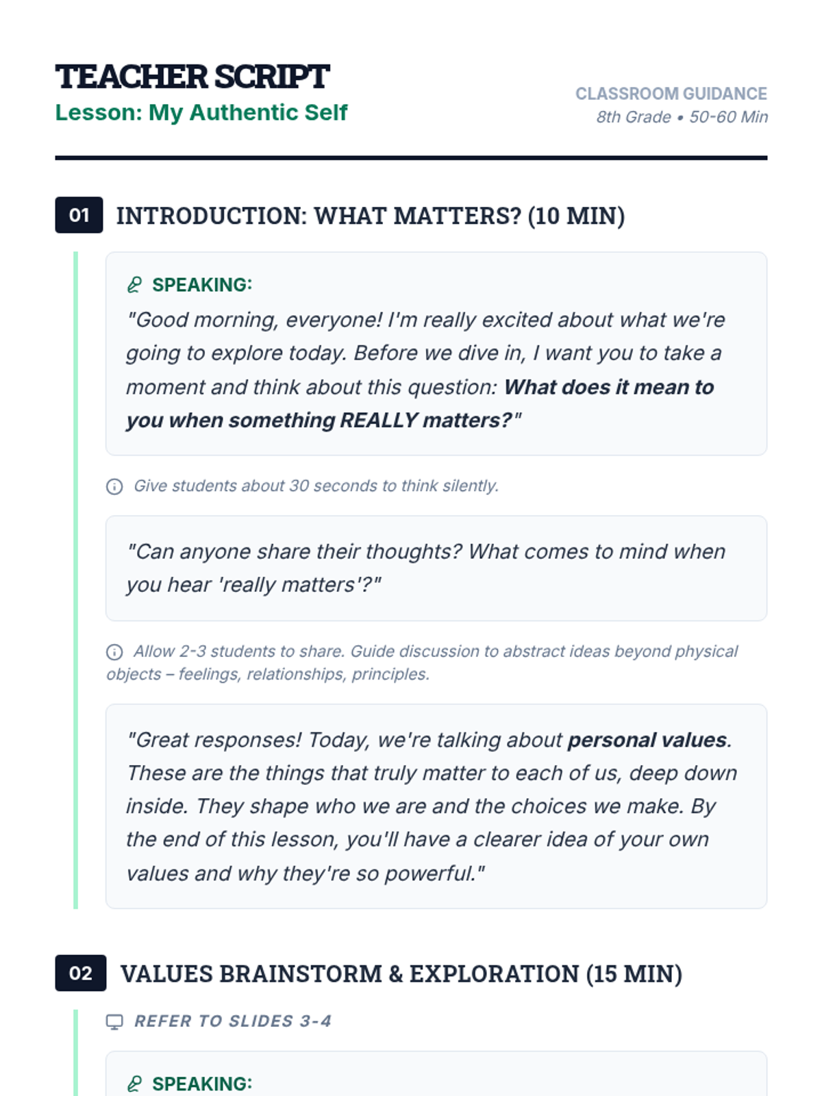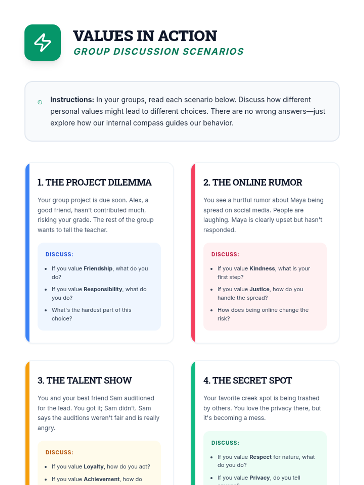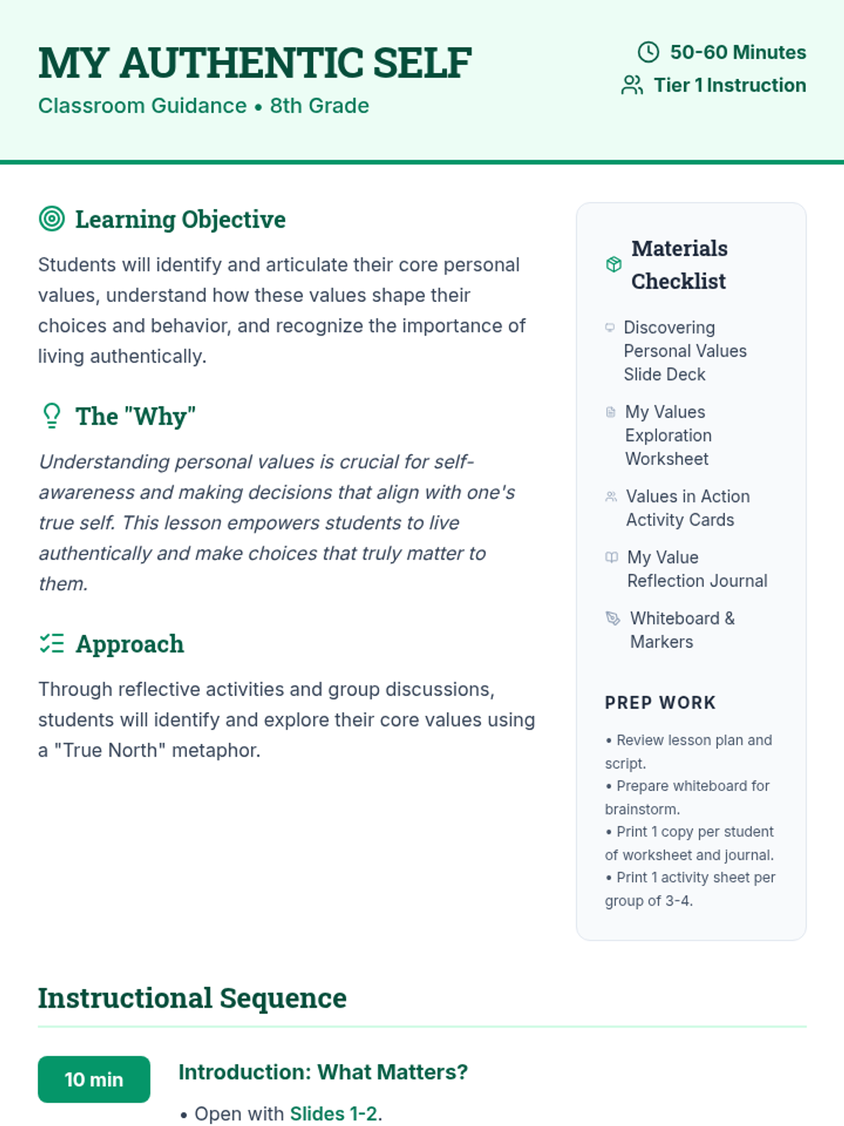 A 60-minute introspective lesson for 8th graders to identify their core personal values, explore how they guide decisions, and commit to living authentically through reflective activities and group scenarios.