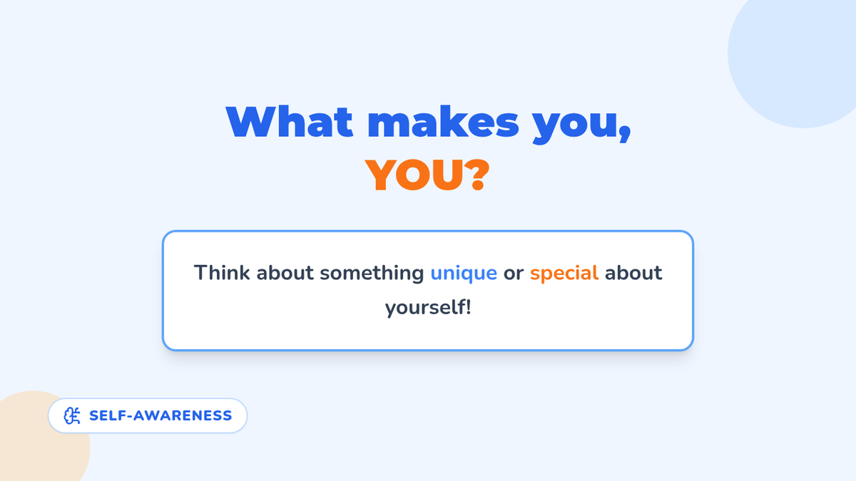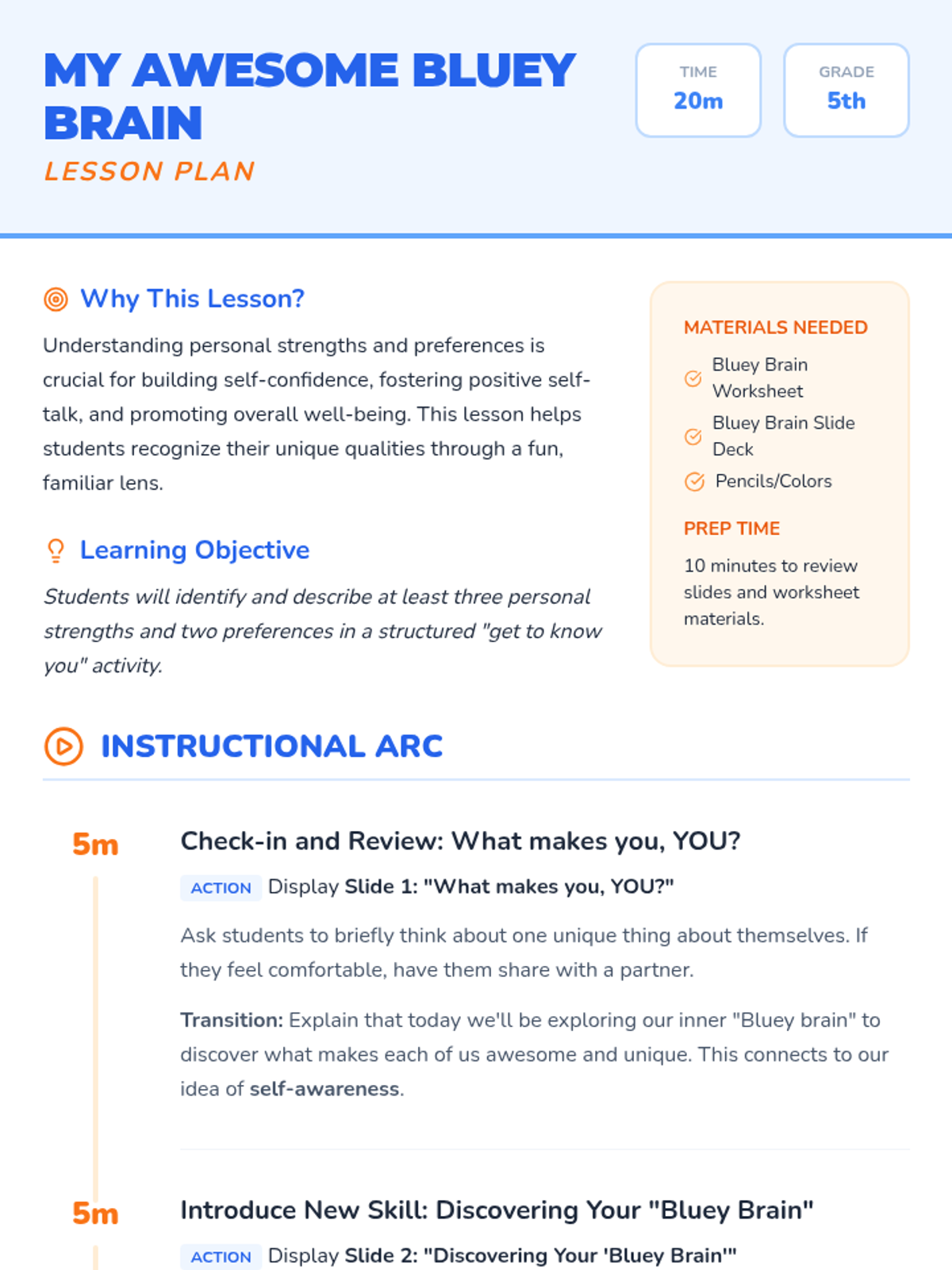 This 20-minute lesson for 5th-grade students focuses on developing self-awareness by helping them identify their personal strengths and preferences. It's important because understanding oneself is crucial for building confidence and positive self-talk.