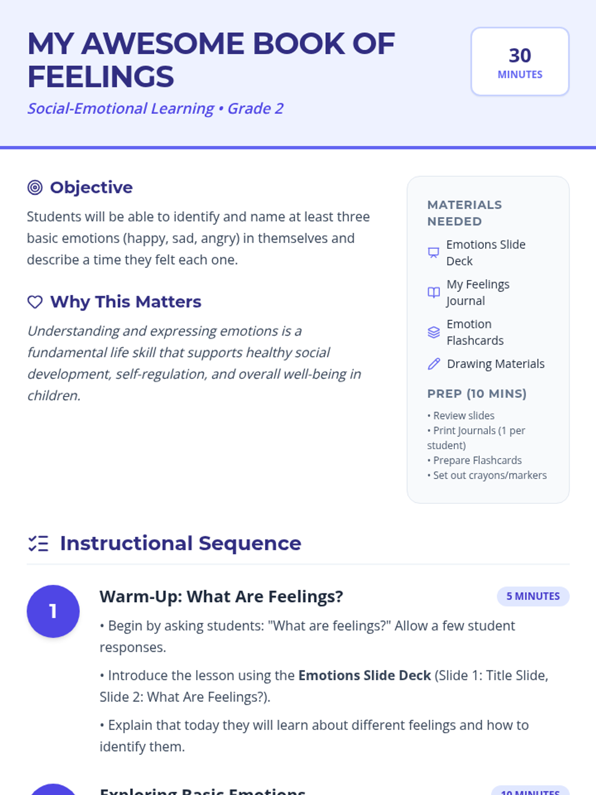 A 30-minute introductory lesson for 2nd graders to identify and express basic emotions (happy, sad, angry) through discussion, visual aids, and creative journaling.
