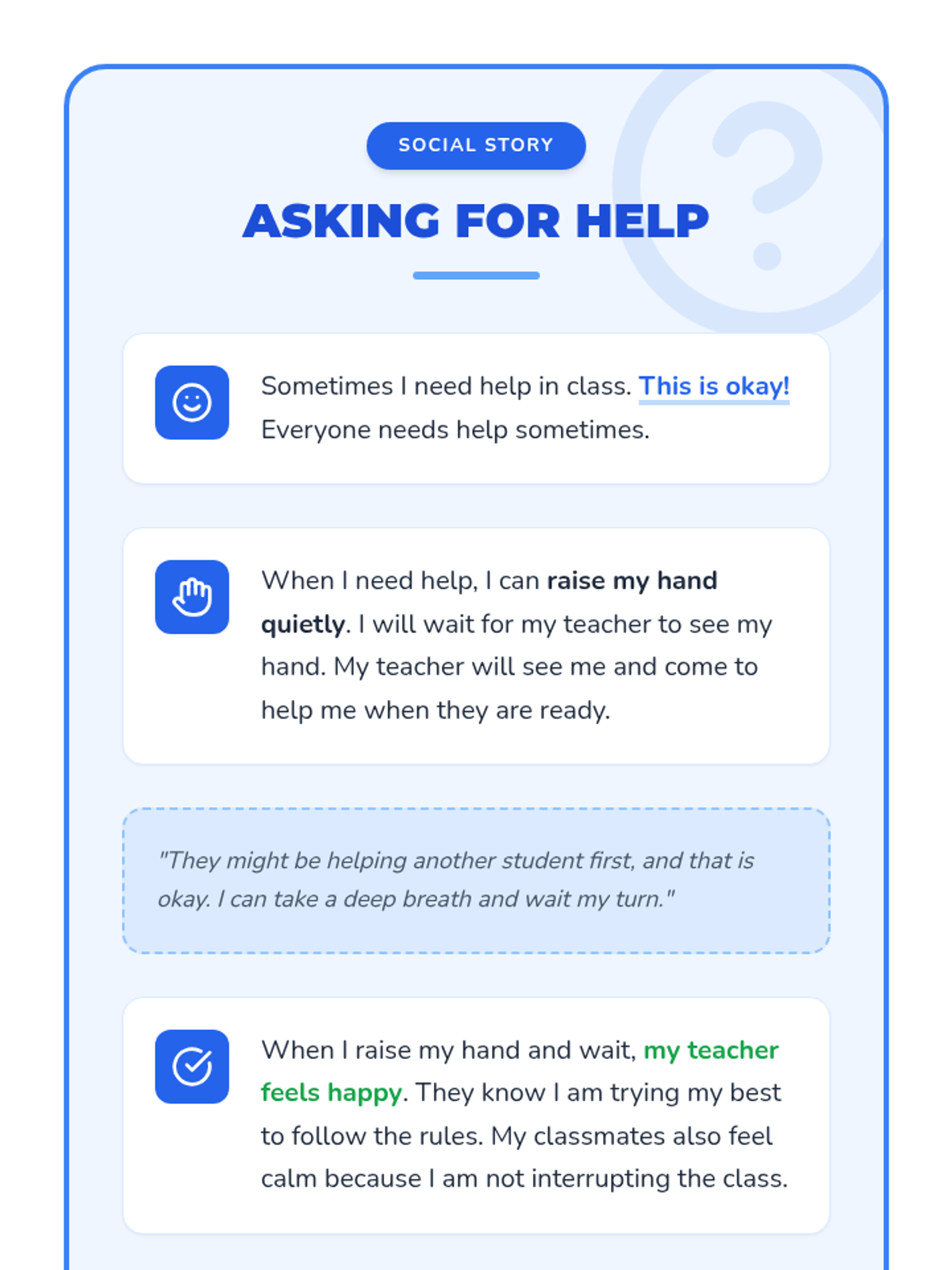 A comprehensive lesson on navigating classroom and school-wide transitions using visual supports. Students learn to recognize and follow visual cues to move smoothly between activities and locations.