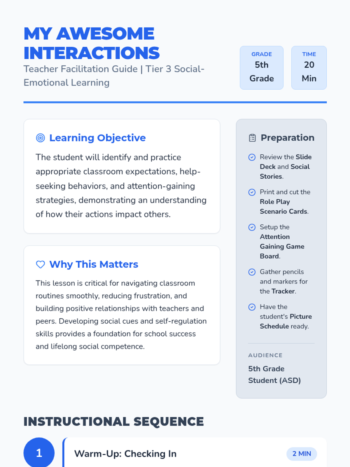 A 20-minute Tier 3 lesson for a fifth-grade student with autism focused on classroom expectations, appropriate help-seeking, frustration management, and developing empathy through social stories and role-play.