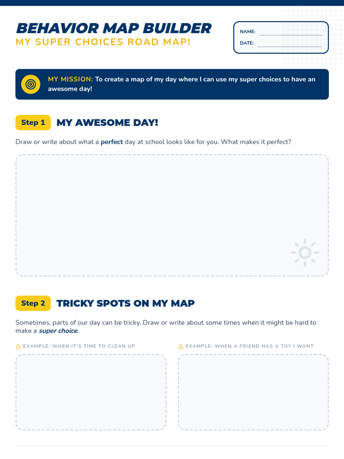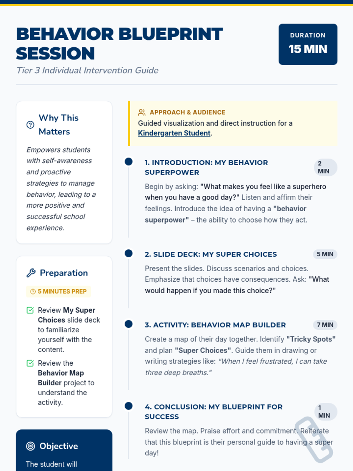 A 15-minute Tier 3 intervention for kindergarteners to visualize and plan for challenging moments using positive 'super choices'.