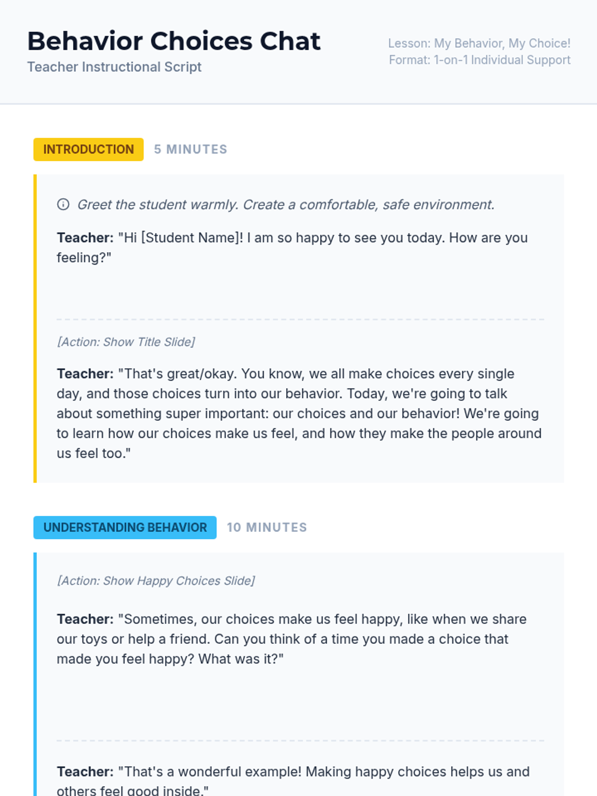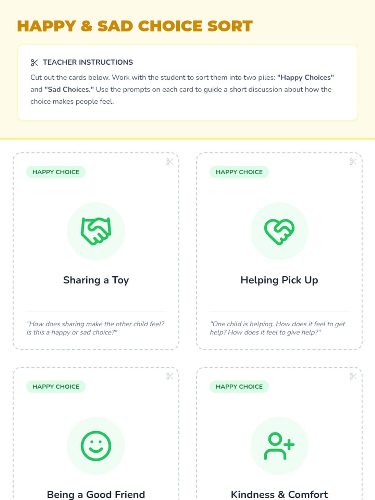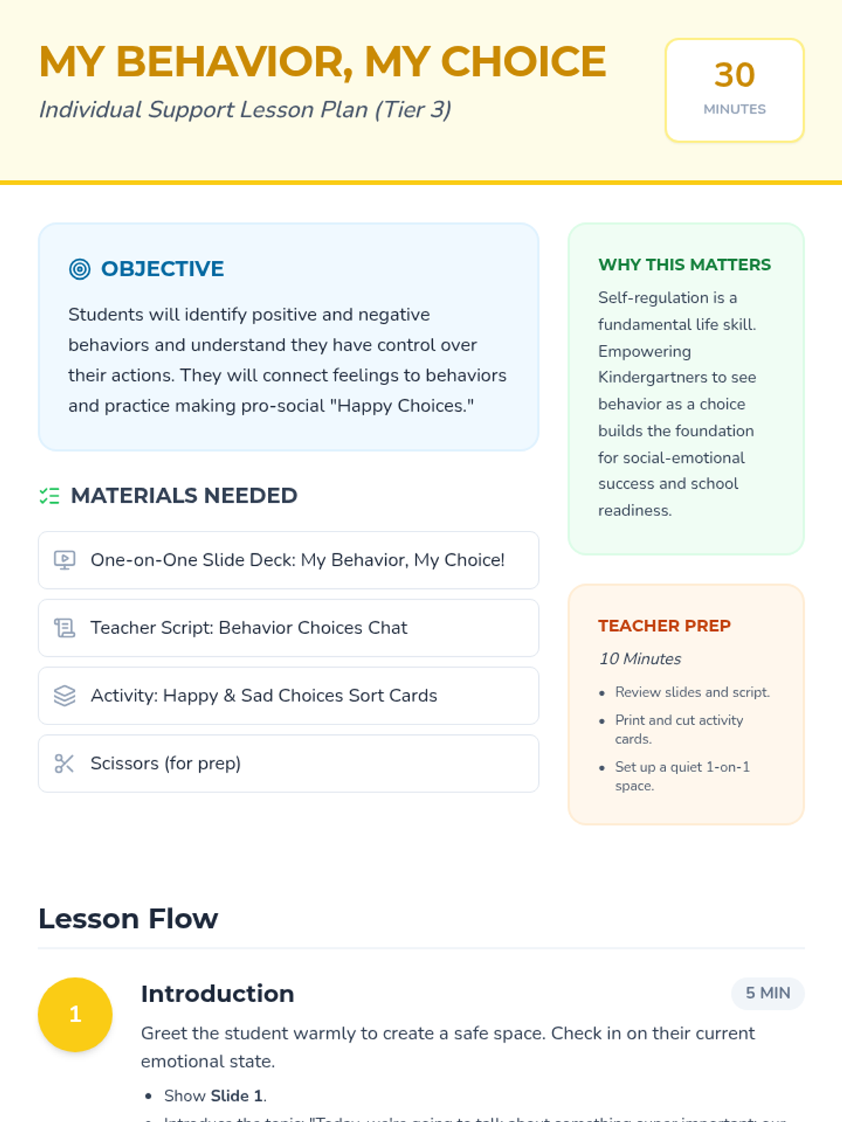 A 30-minute Tier 3 intervention for Kindergarten students focusing on self-regulation and identifying positive vs. negative behavior choices. Students learn that their actions are choices and practice sorting behaviors by their emotional impact.