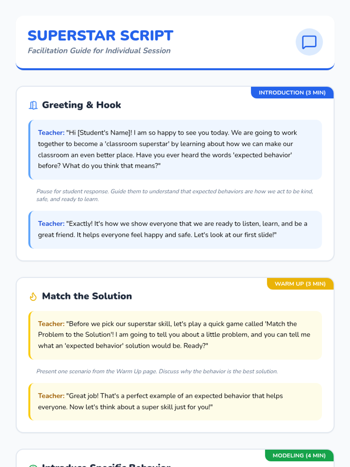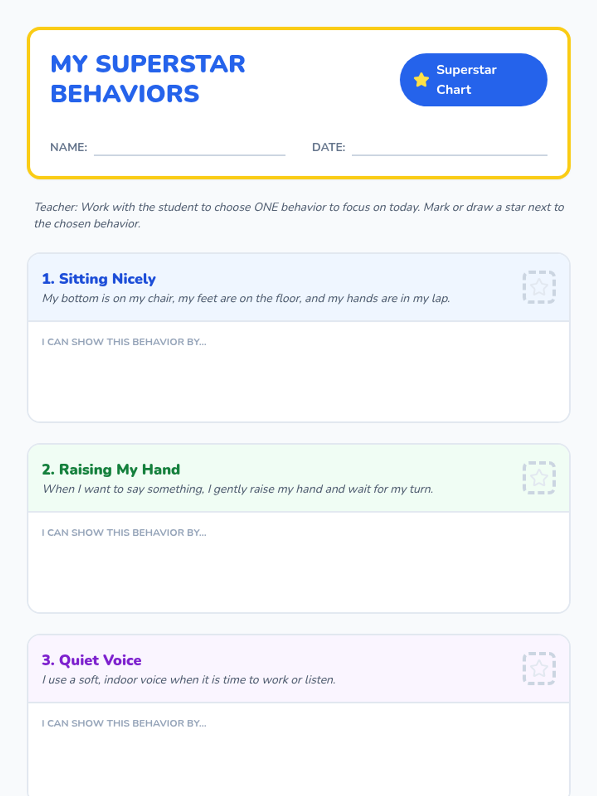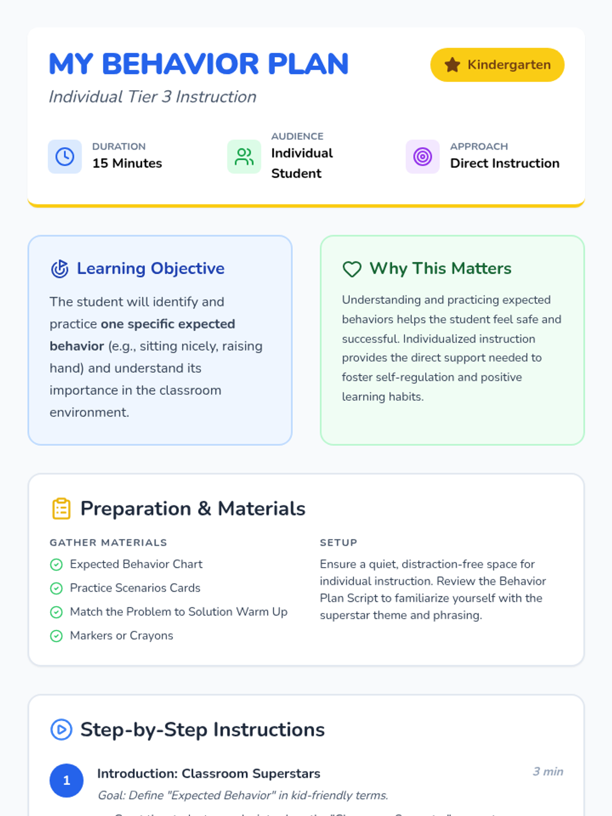 A personalized Tier 3 individual session for kindergarten students to identify, practice, and integrate specific expected behaviors into their daily routines through a 'Classroom Superstar' theme.