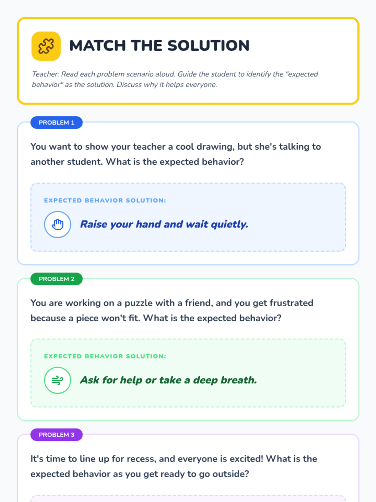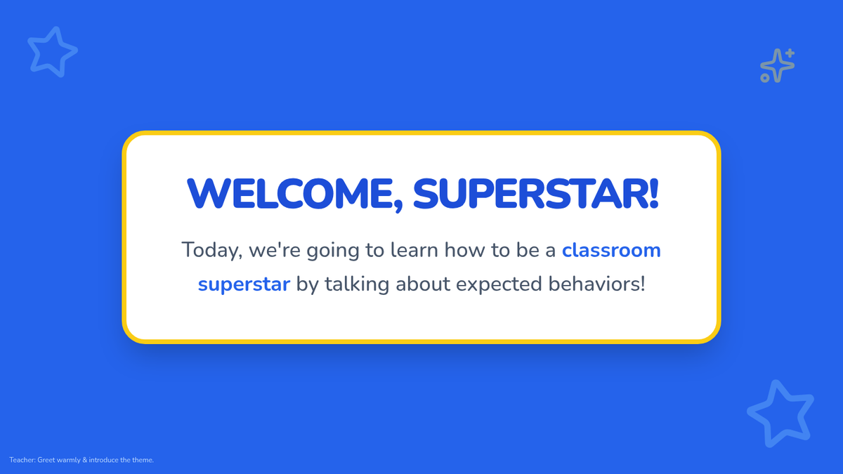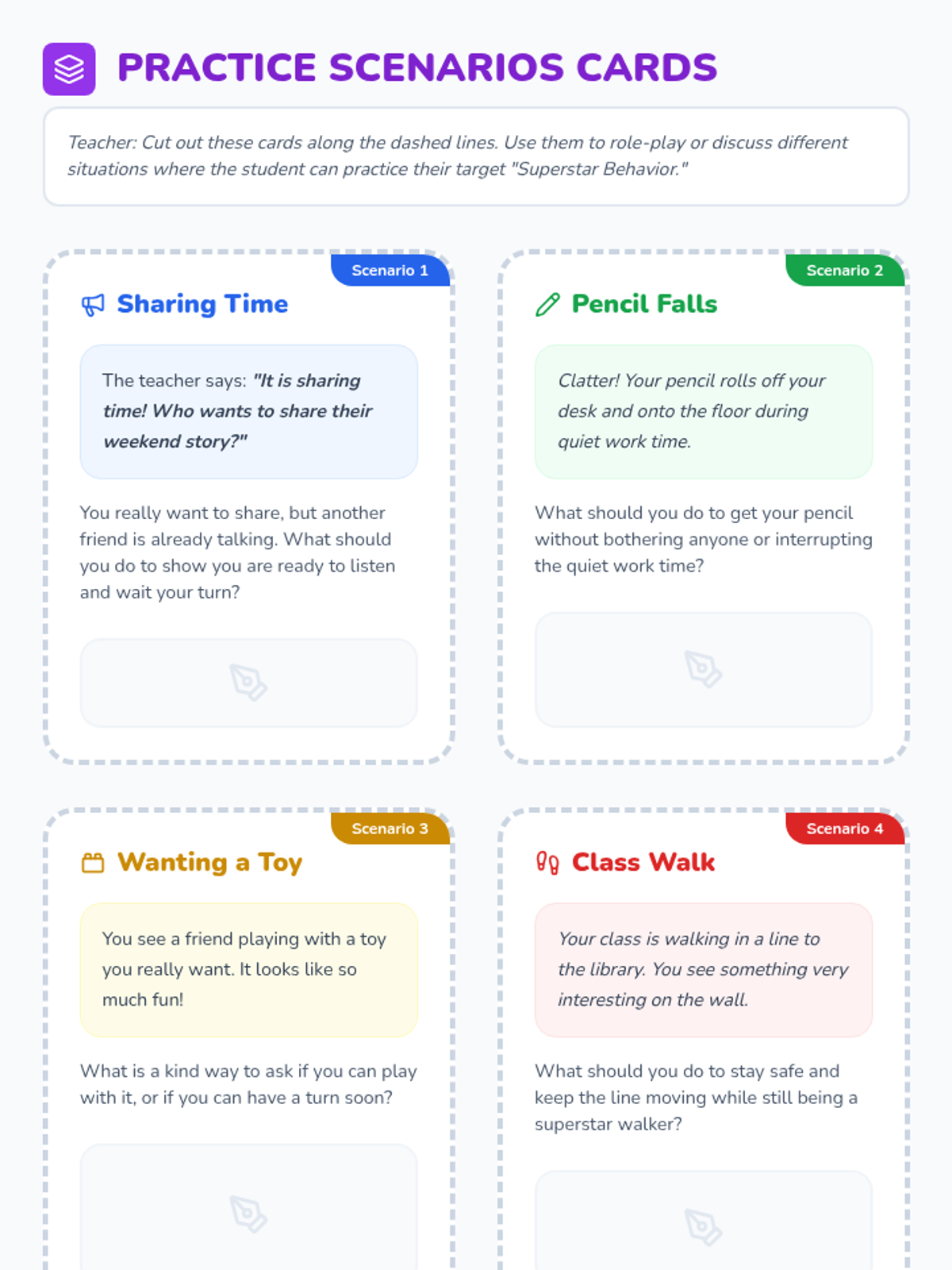 A personalized Tier 3 individual session for kindergarten students to identify, practice, and integrate specific expected behaviors into their daily routines through a 'Classroom Superstar' theme.