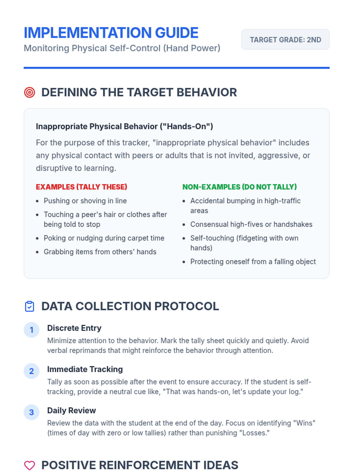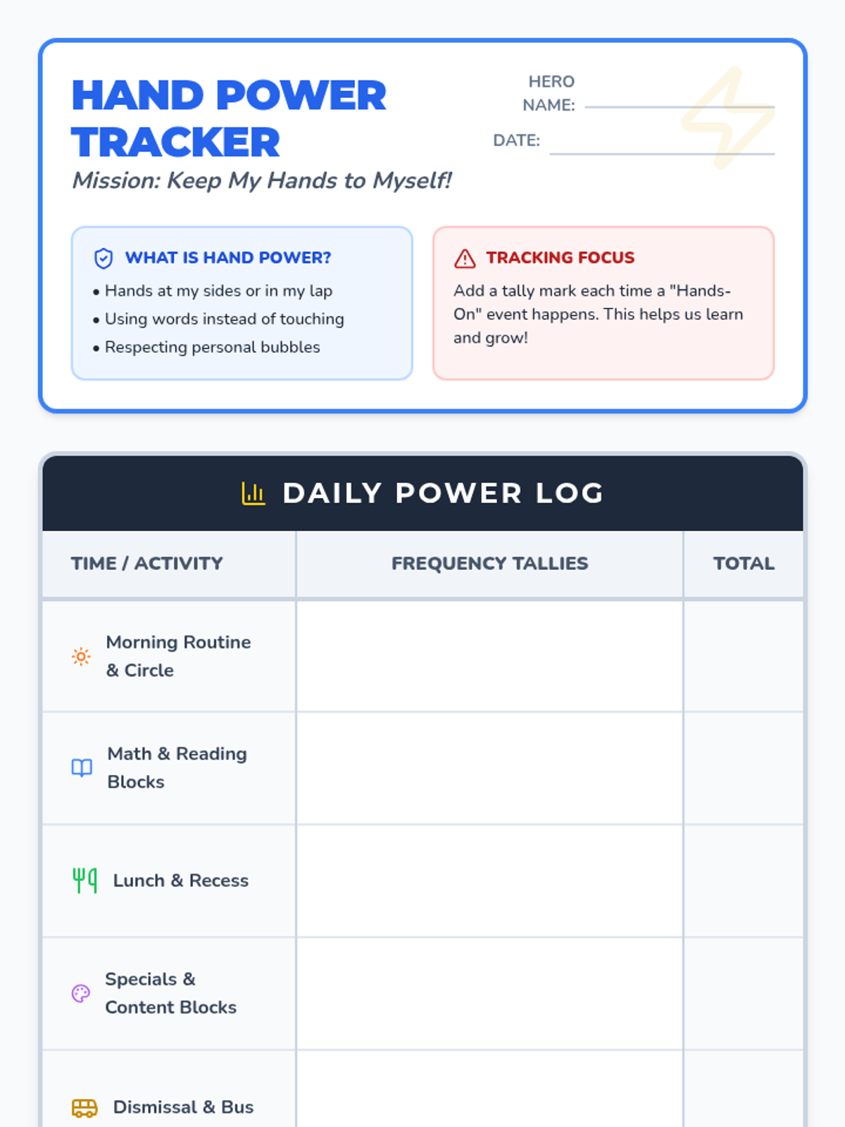 This lesson focuses on developing self-control and "Hand Power" in young students. It provides a structured way to track physical behaviors through a superhero-themed tally system, helping students and teachers identify patterns and celebrate growth.