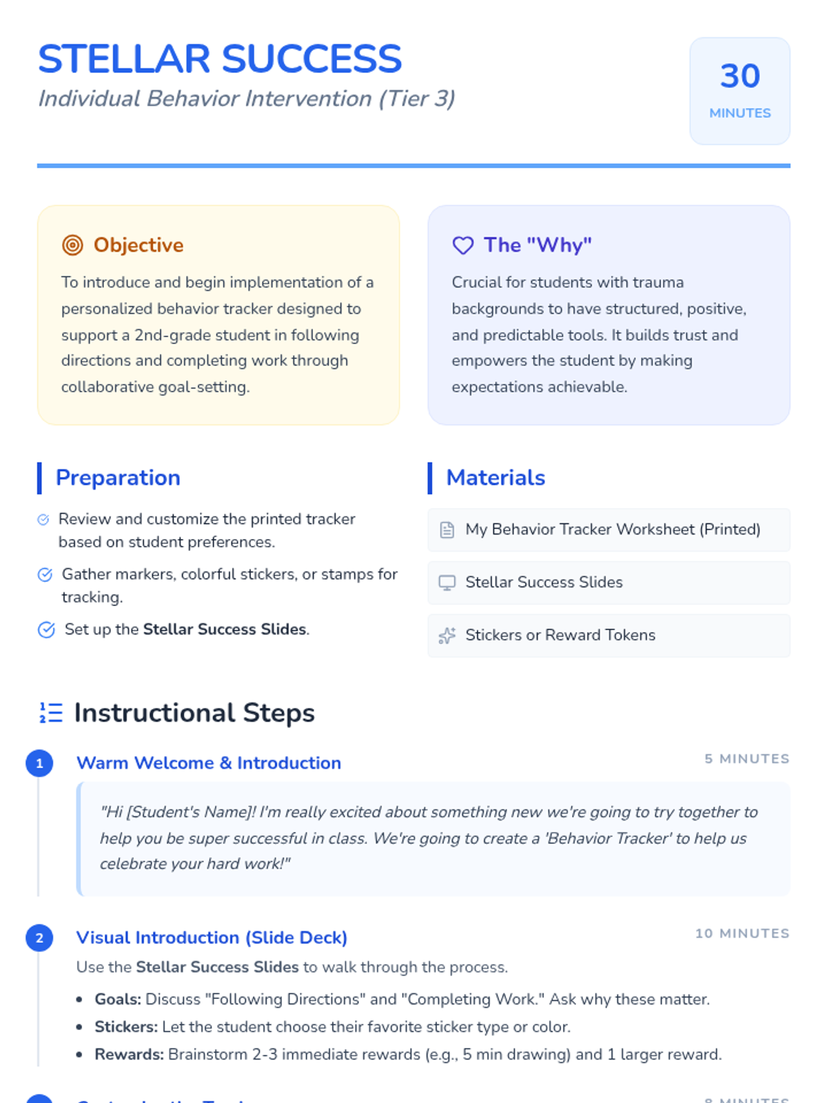 A Tier 3 individual intervention lesson for a 2nd-grade student with a trauma background, focused on collaborative goal-setting and self-regulation using a personalized behavior tracker.