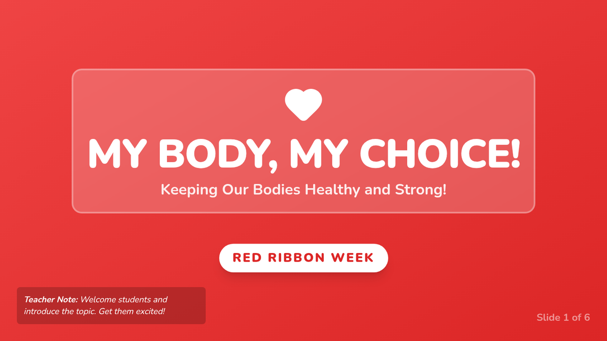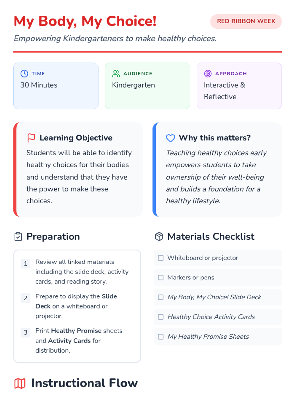 A 30-minute Kindergarten lesson for Red Ribbon Week that empowers students to make healthy choices for their bodies through interactive activities, a story, and a personal promise.