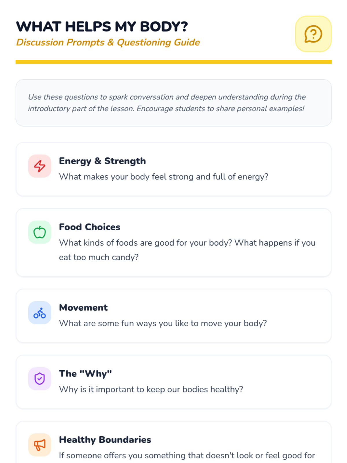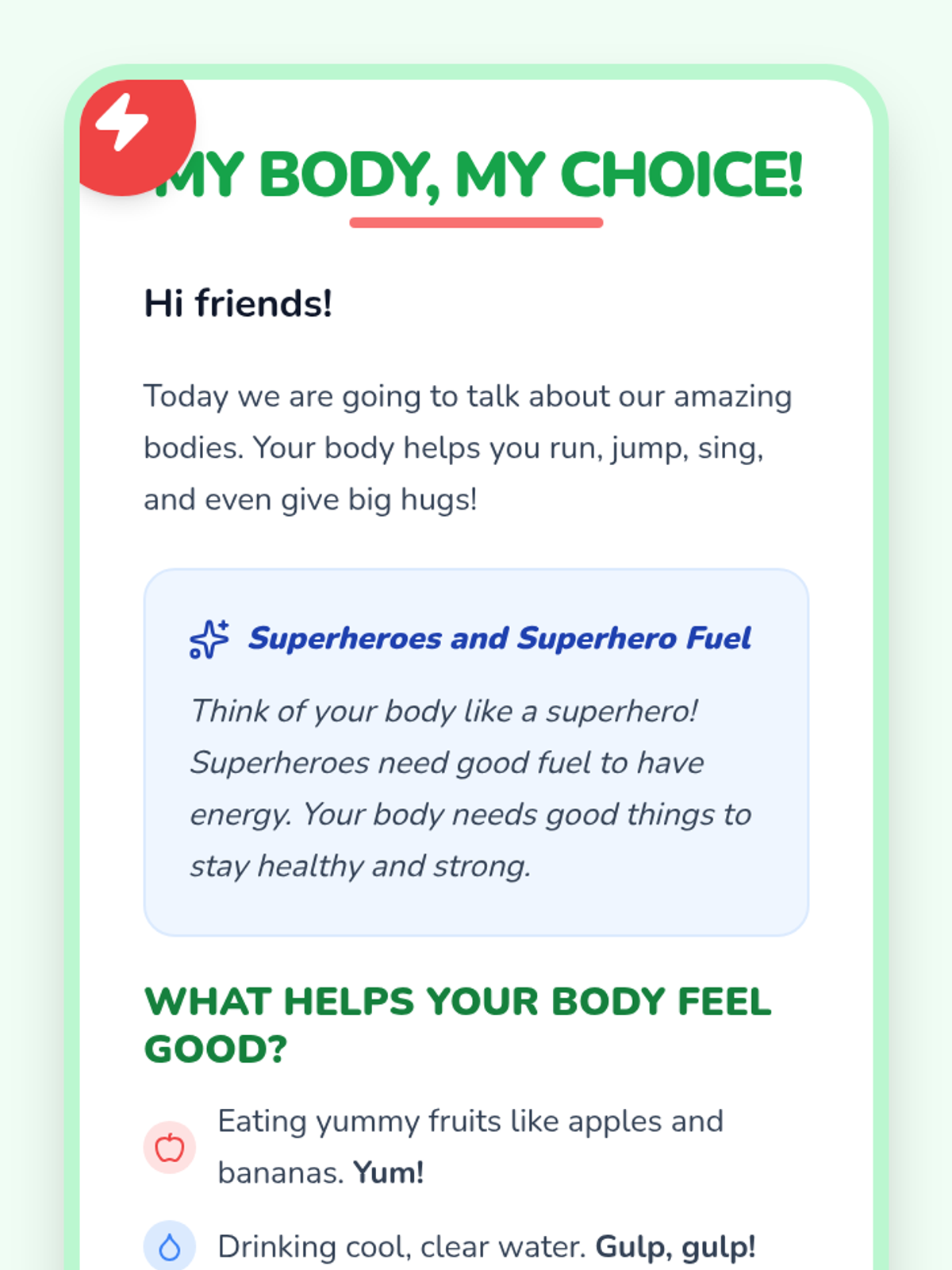 A comprehensive lesson on hydration safety and awareness, featuring fun facts, body awareness activities, and practical tips for staying hydrated in daily life.