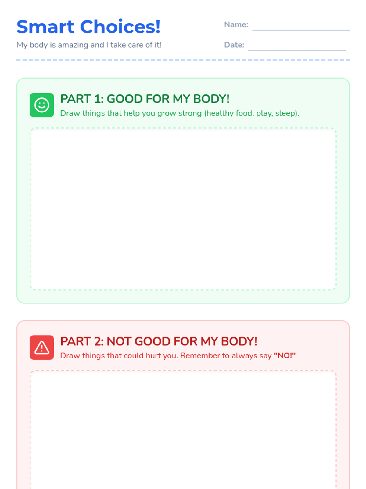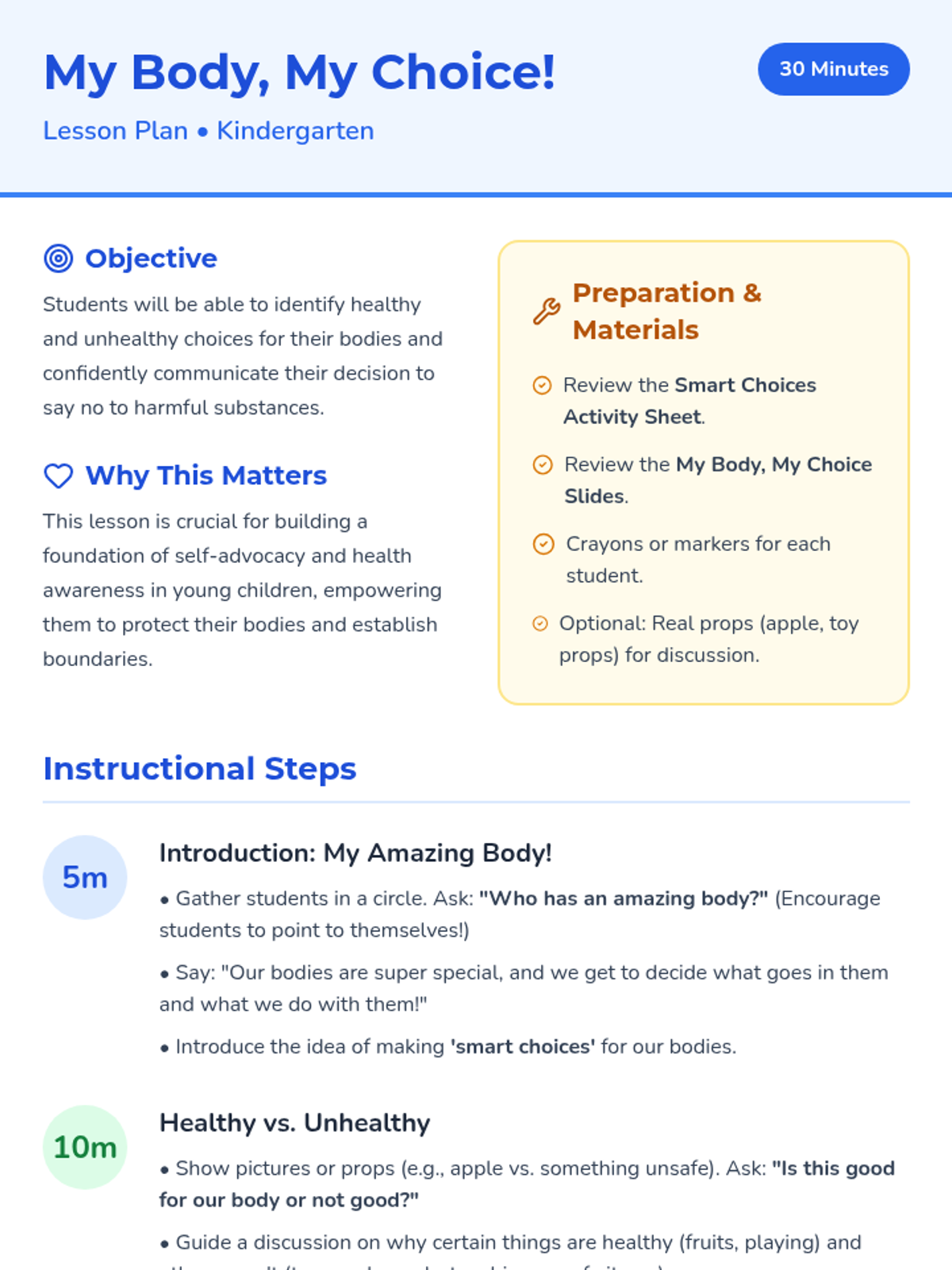 A 30-minute empowering lesson for Kindergarteners to learn about making healthy choices for their bodies and practicing self-advocacy by saying 'no' to harmful substances.