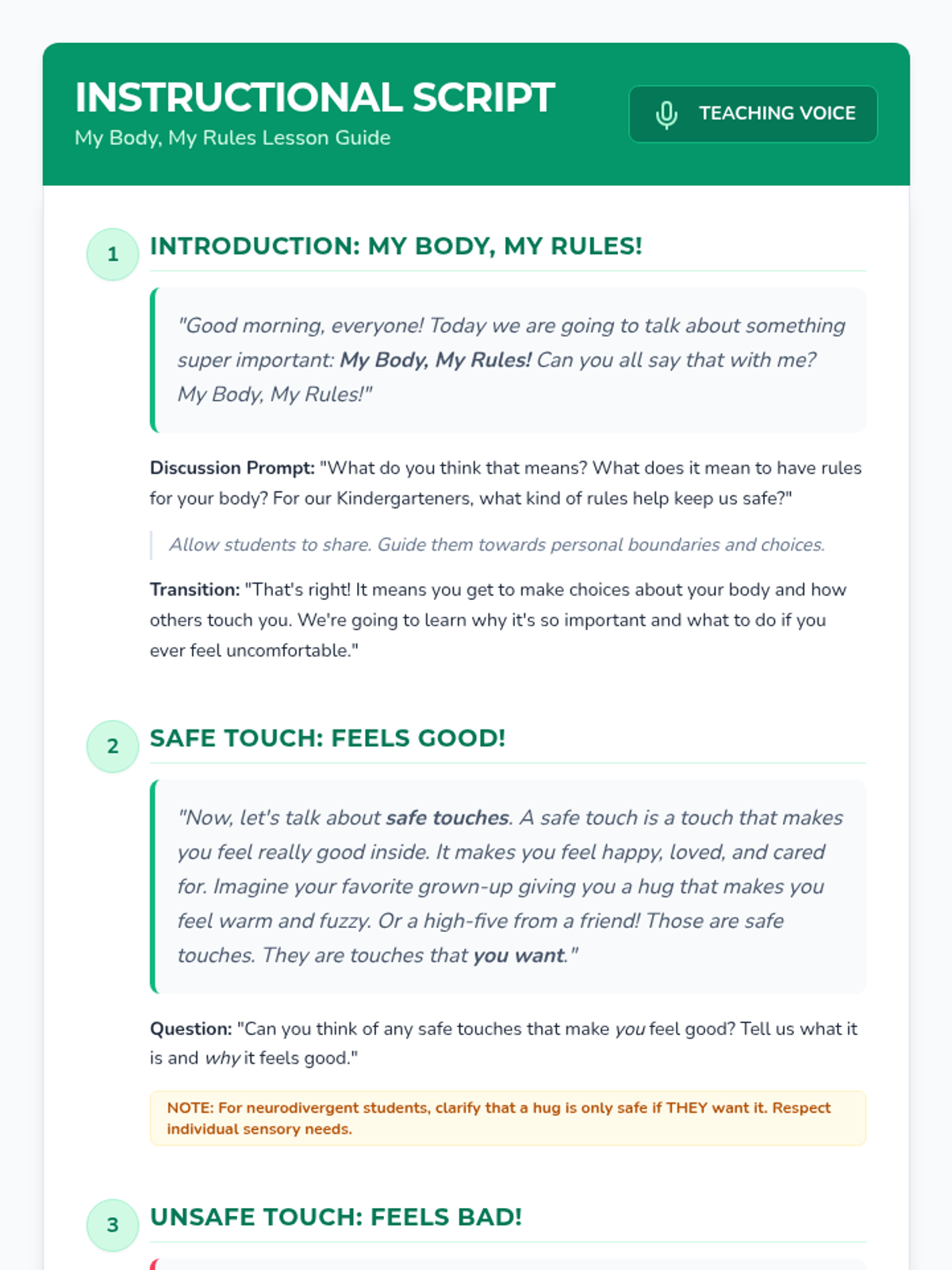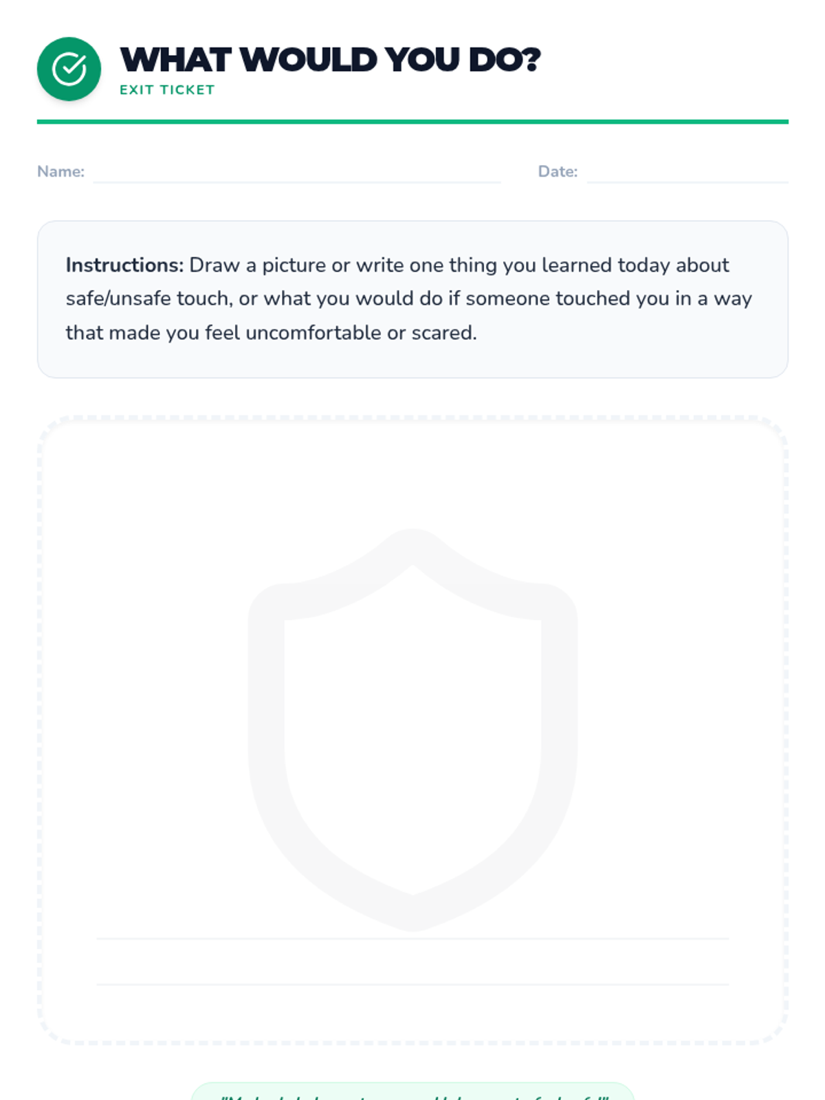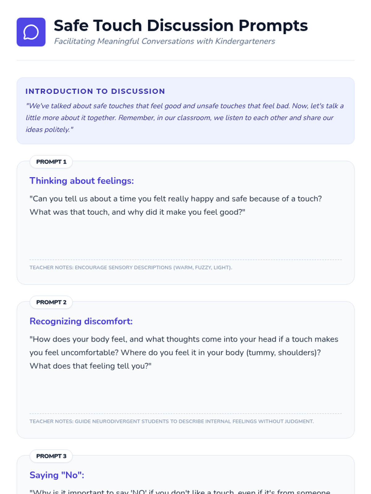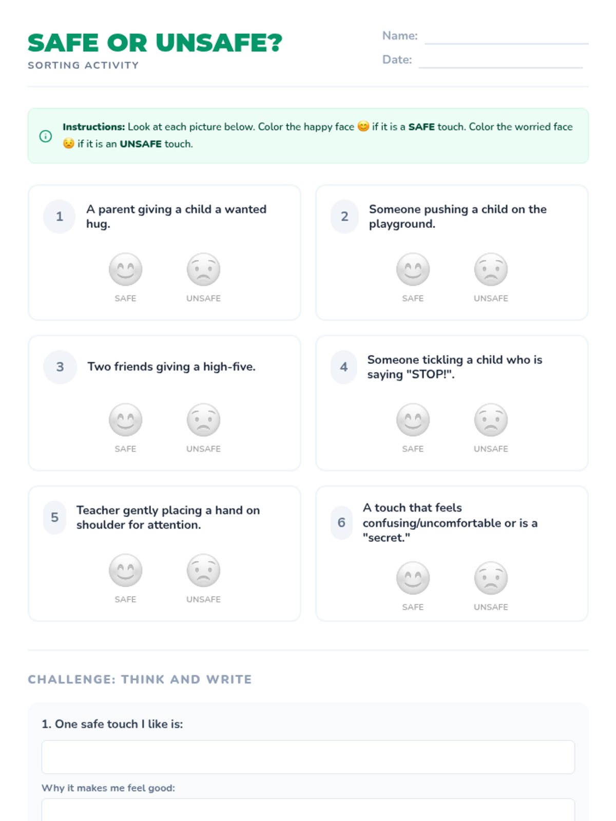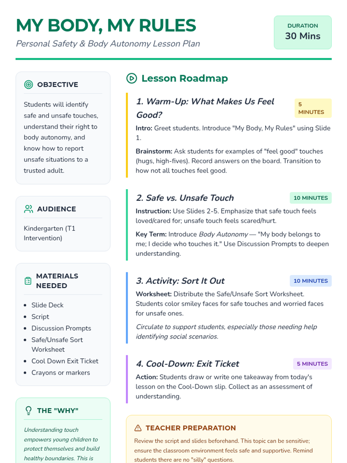 This lesson introduces Kindergarten students to the concept of safe and unsafe touch, emphasizing body autonomy and the importance of speaking up. It helps children understand boundaries and how to seek help through interactive discussion, visual aids, and a sorting activity.