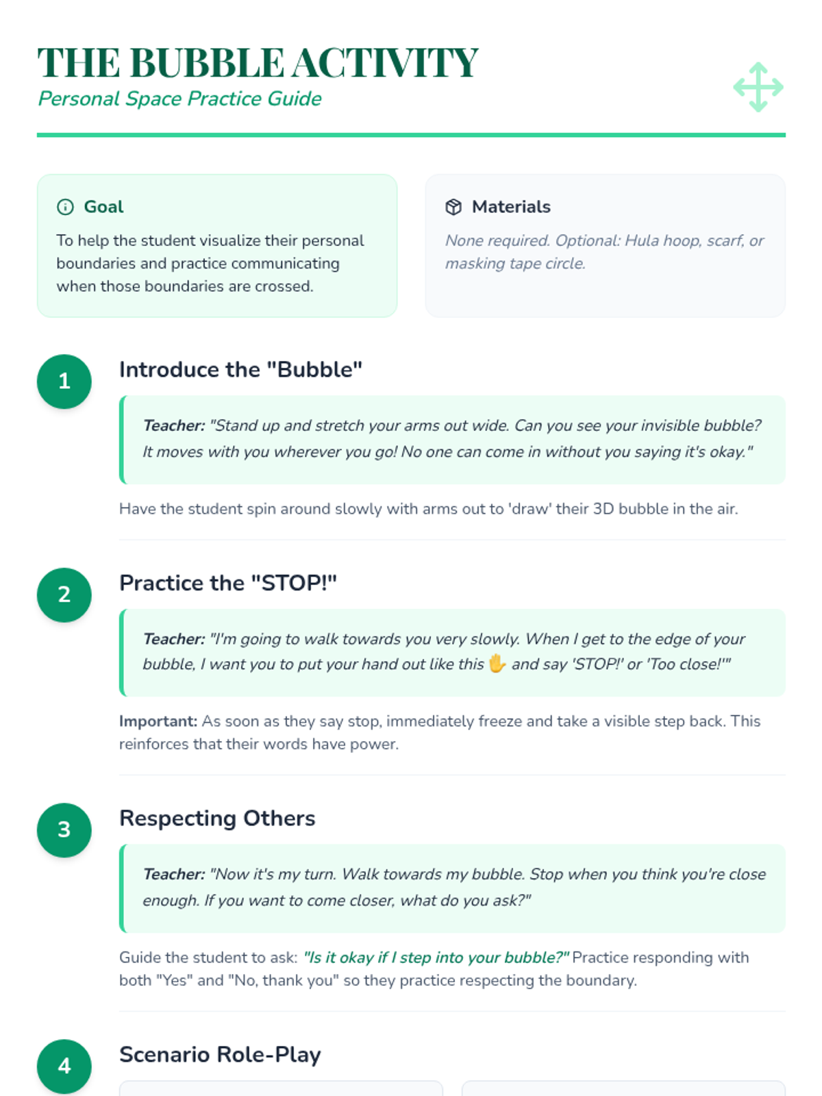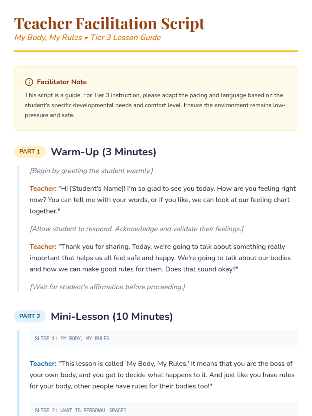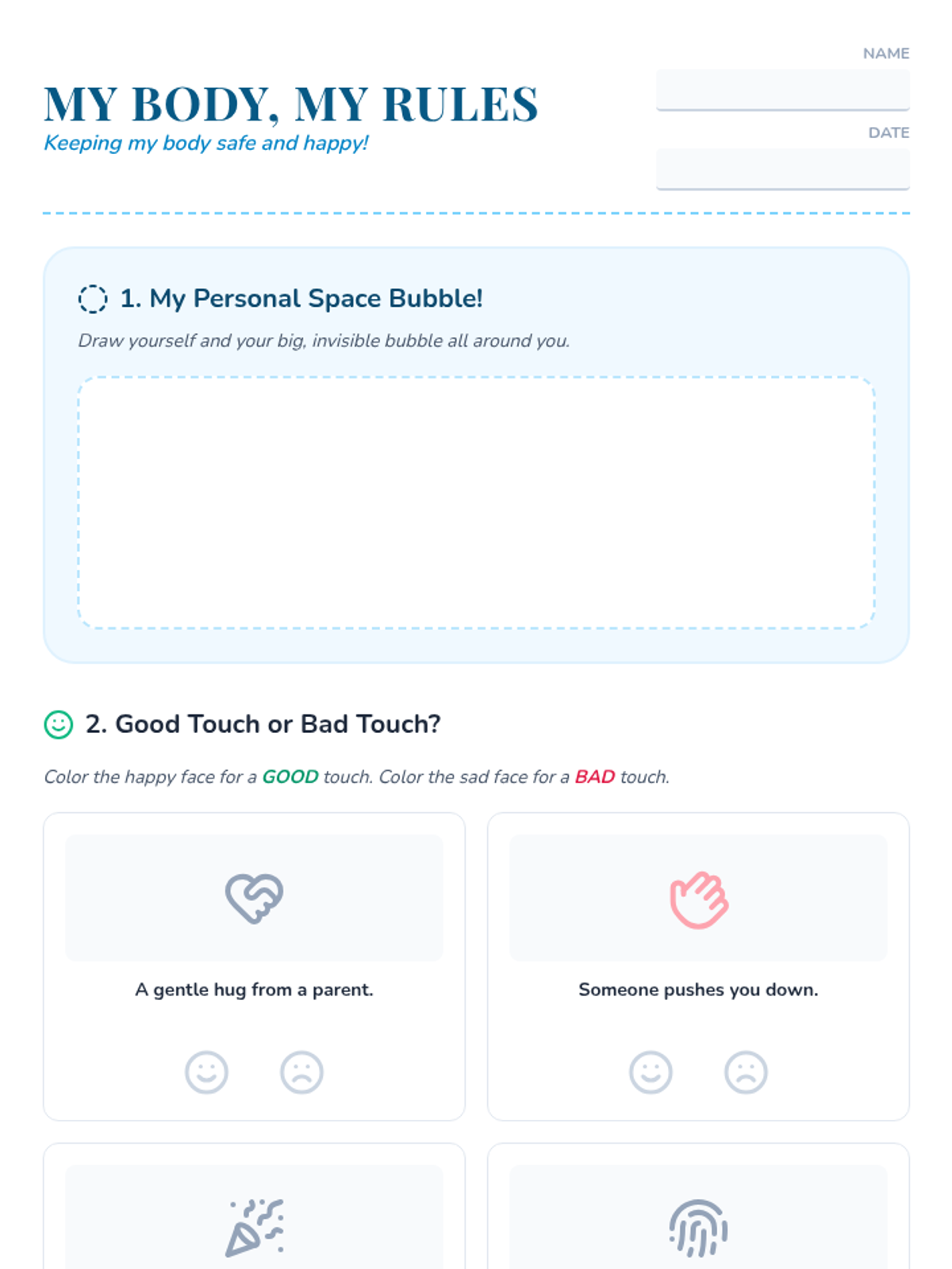 A 30-minute Tier 3 Kindergarten lesson focused on personal body safety, understanding boundaries, and identifying appropriate vs. inappropriate touch. Students learn the concept of a 'personal space bubble' and how to communicate their body rules to others.