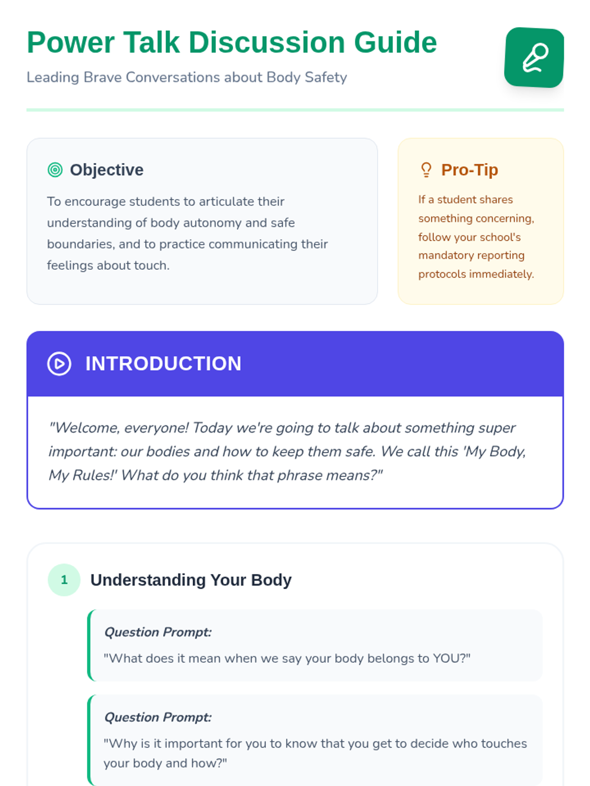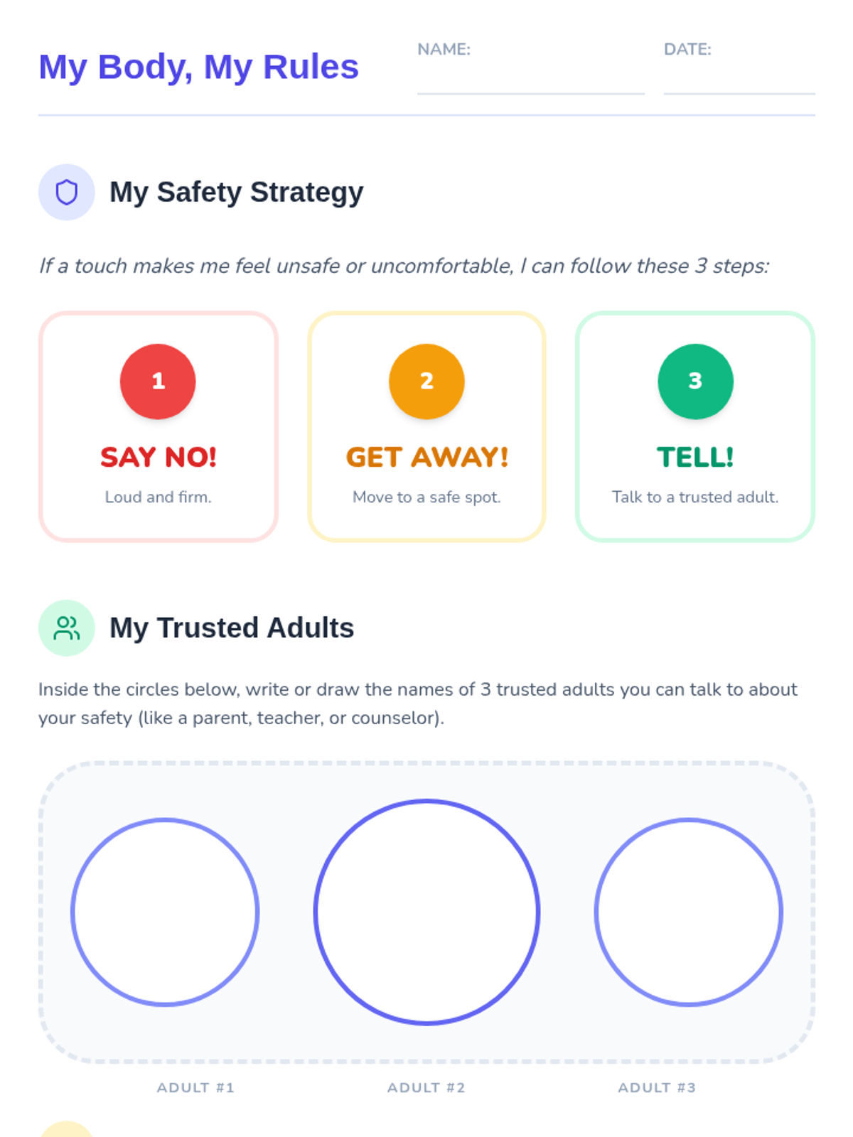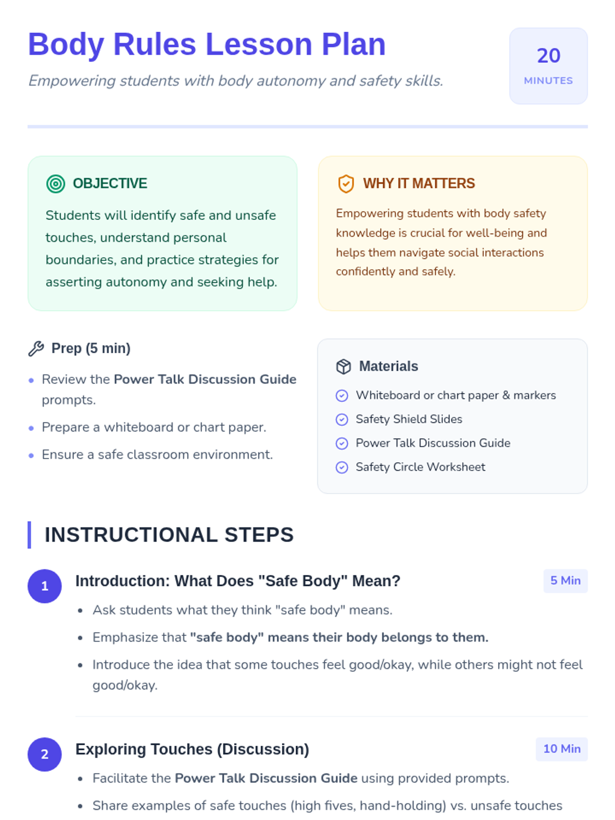 A 20-minute lesson empowering K-5 students with knowledge about body autonomy, safe and unsafe touch, and strategies for setting personal boundaries.