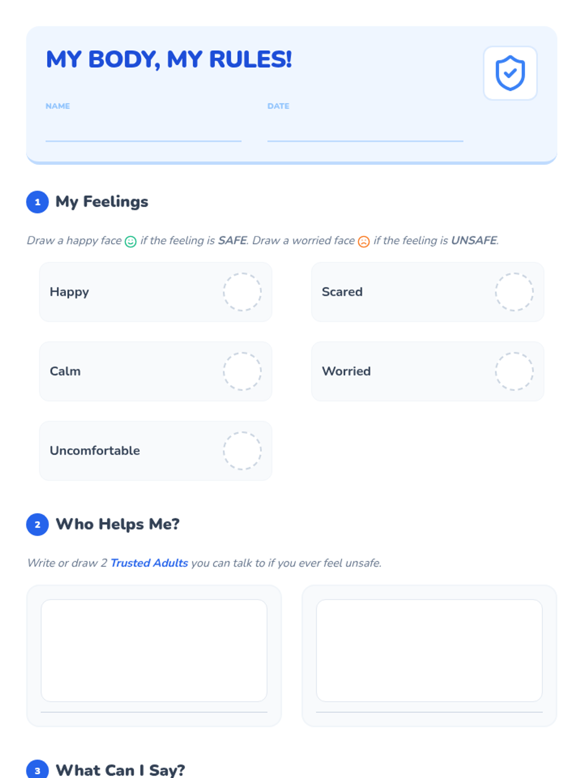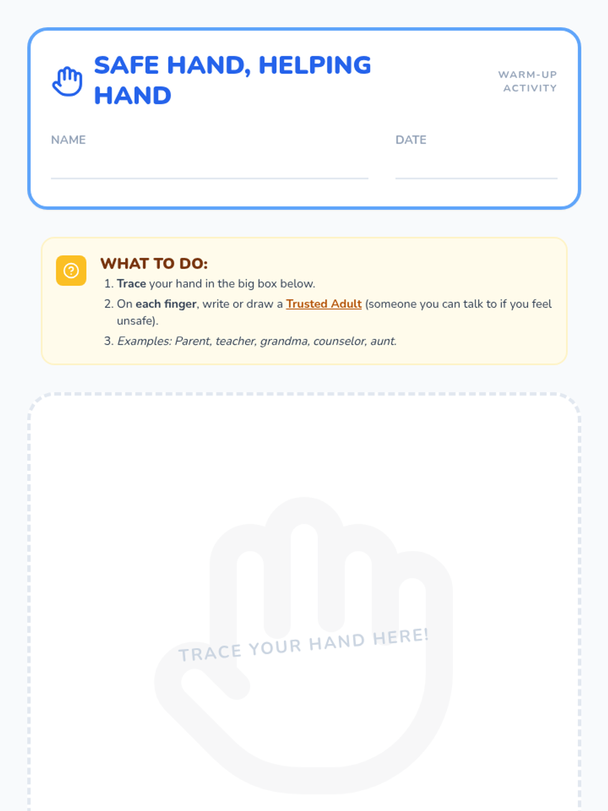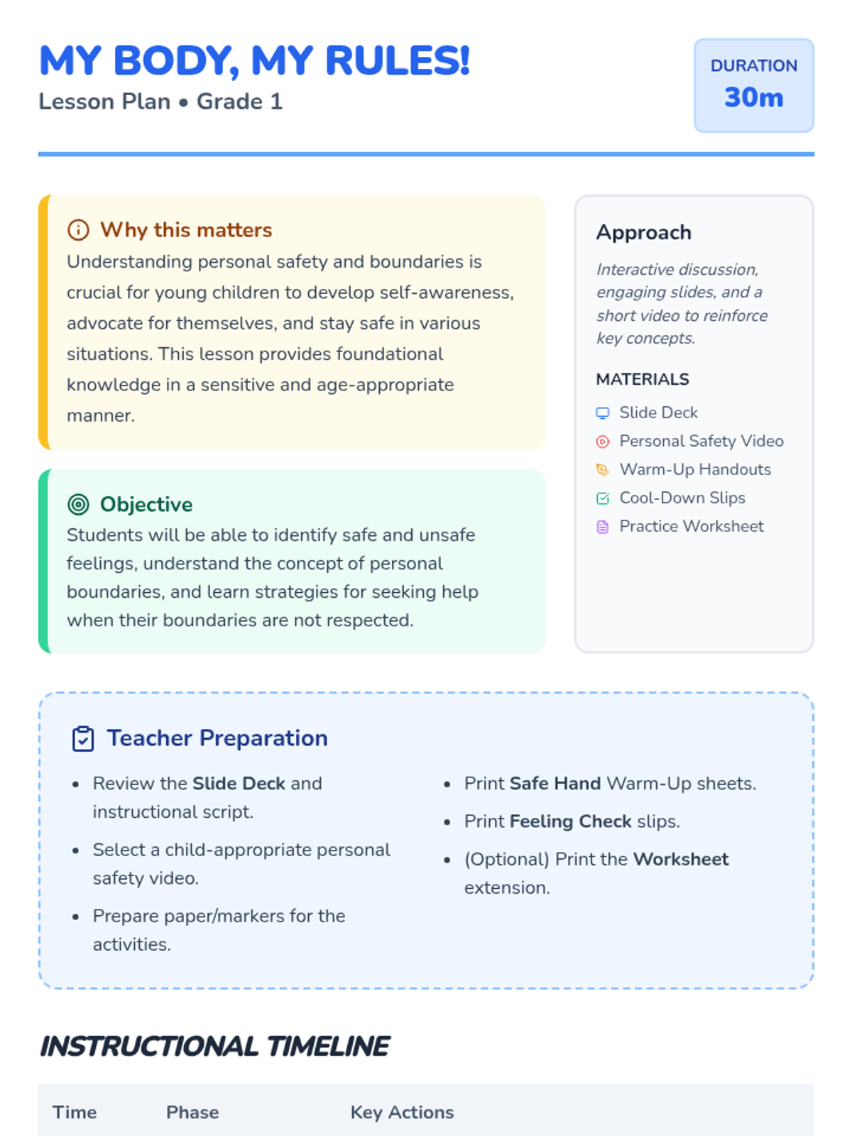 An empowering personal safety lesson for 1st graders that teaches the concepts of personal boundaries, safe/unsafe feelings, and the importance of telling a trusted adult.