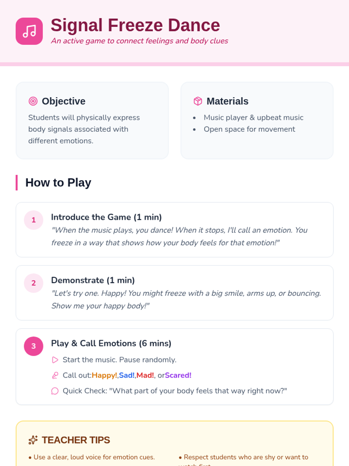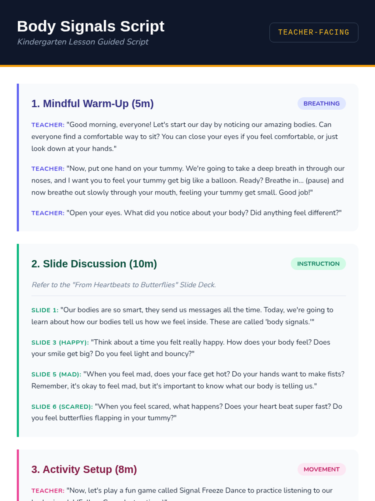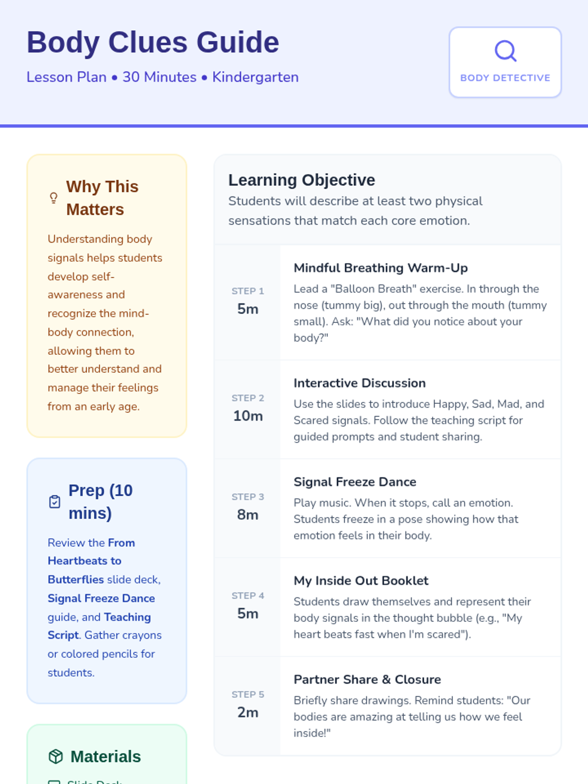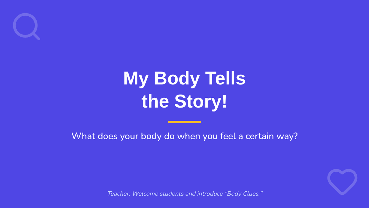 This interactive lesson helps Kindergarten students identify physical body signals (like heartbeats and butterflies) associated with core emotions, fostering early self-awareness and emotional regulation.