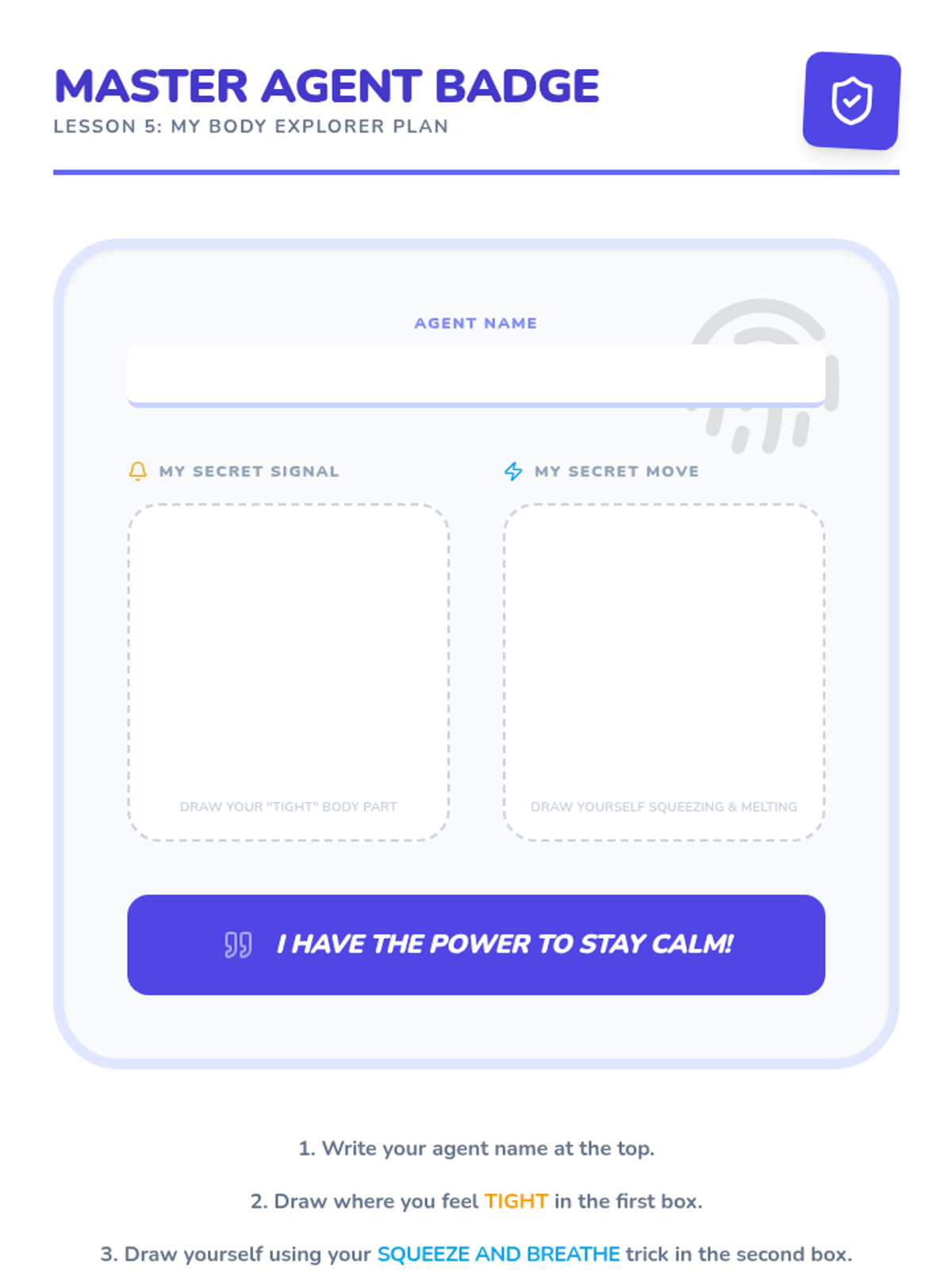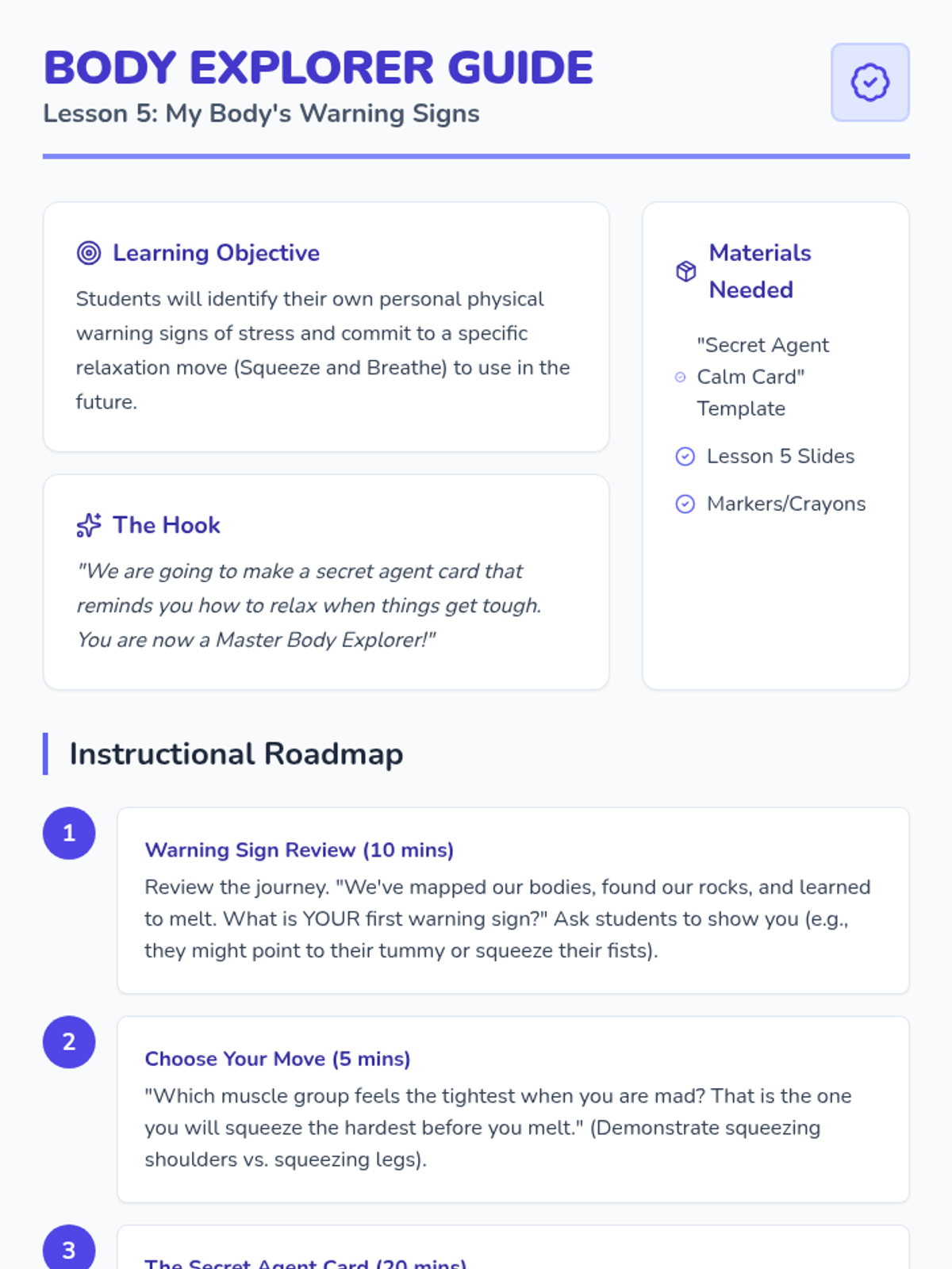 Students reflect on personal physical warning signs and create a visual reminder card for their chosen muscle relaxation move.