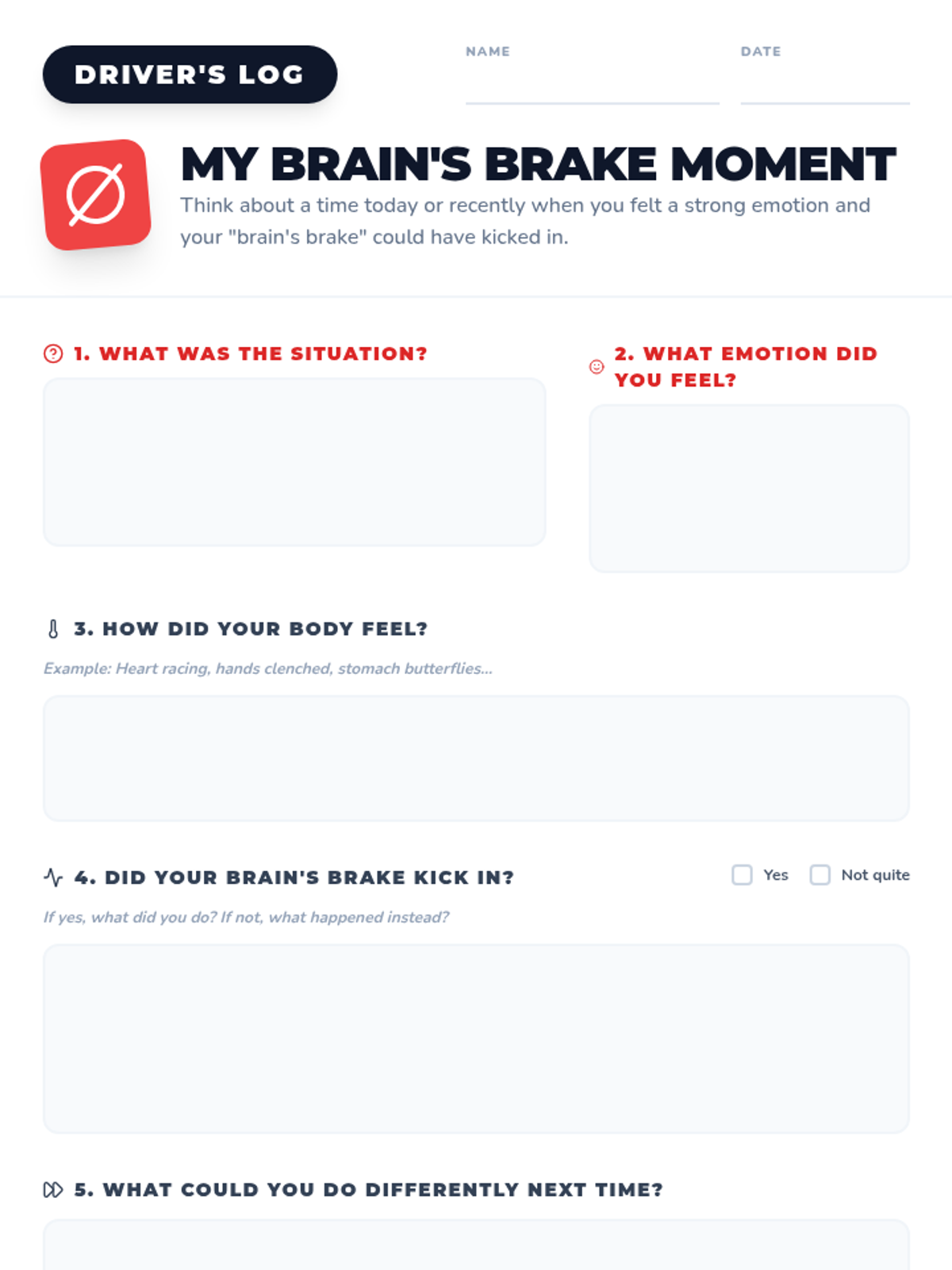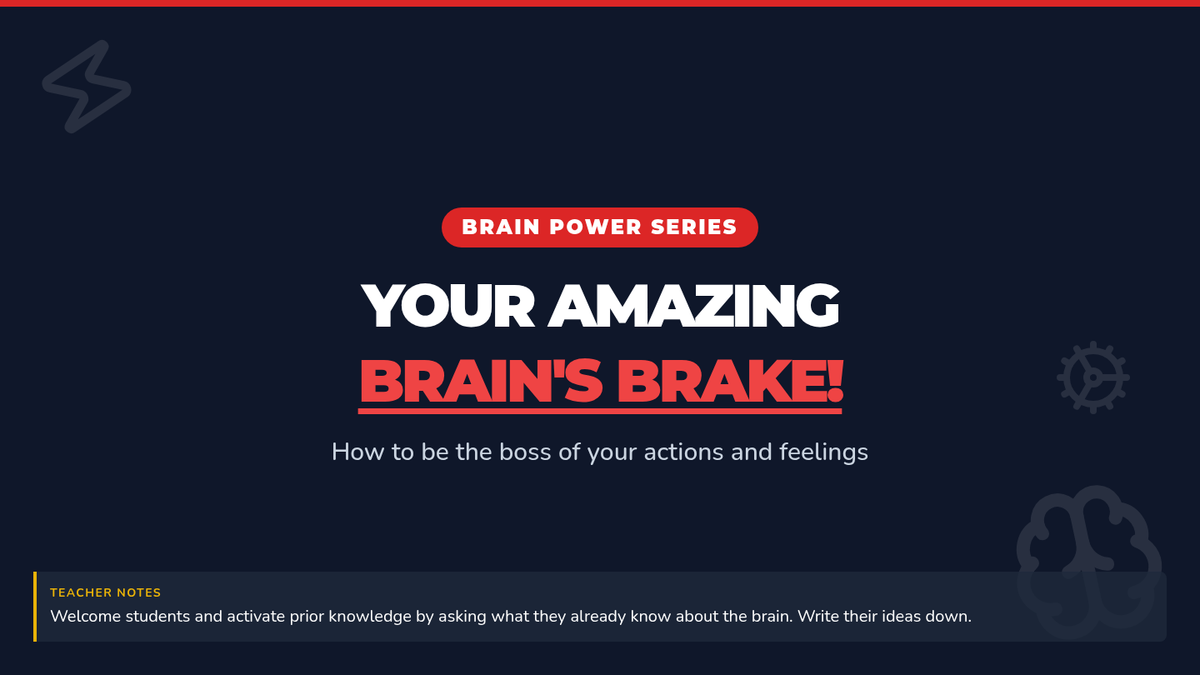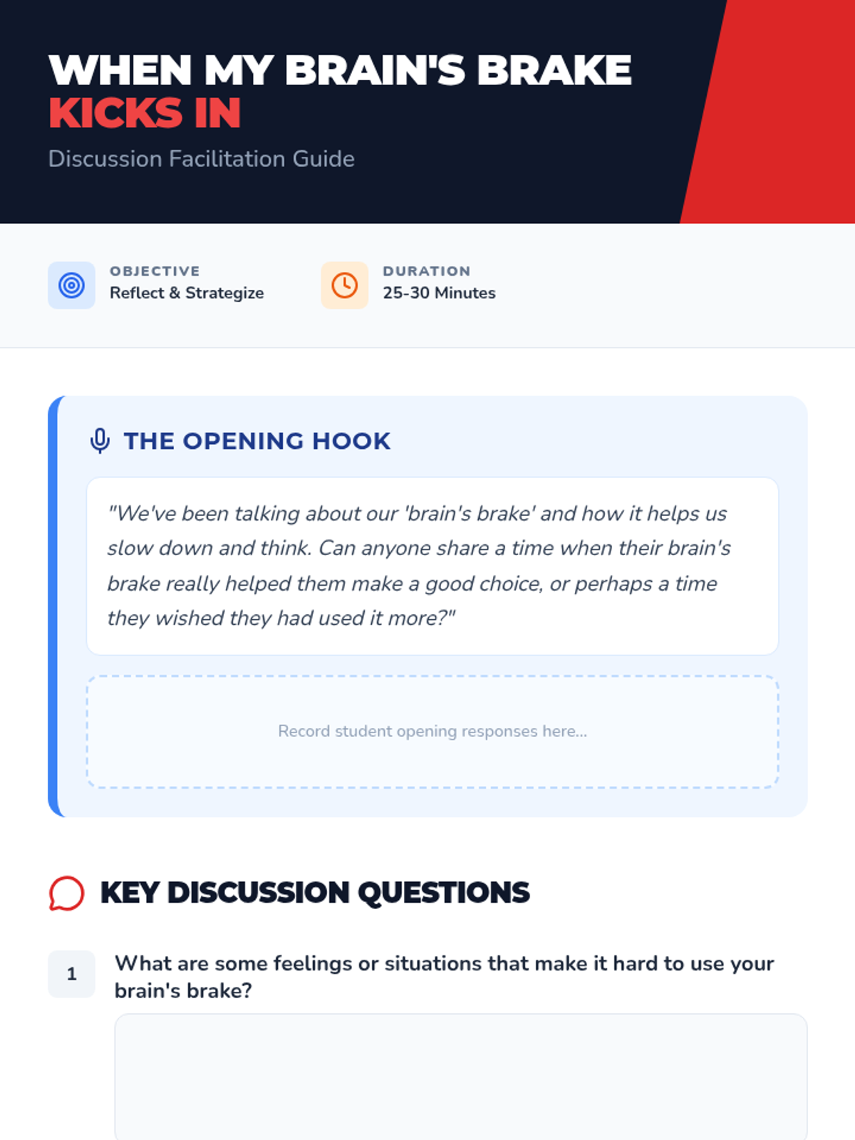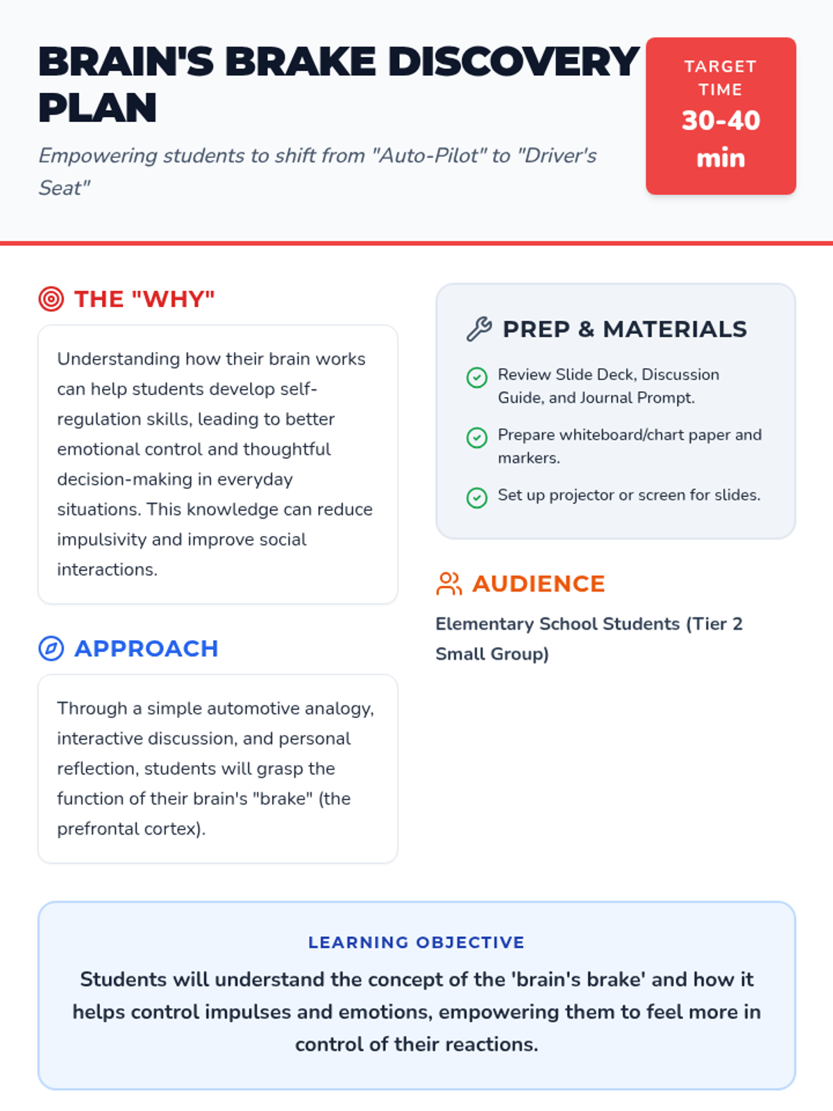 A Tier 2 small group lesson for elementary students explaining self-regulation through the 'brain's brake' analogy (prefrontal cortex). Students learn to stop, think, and act to manage impulses and strong emotions.