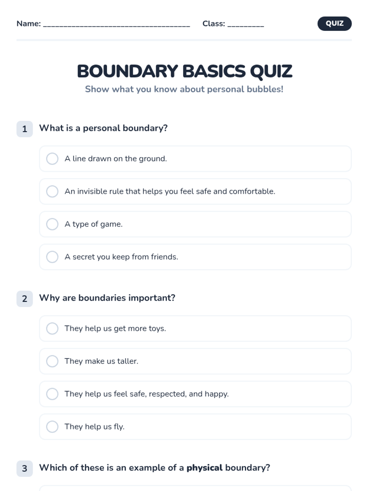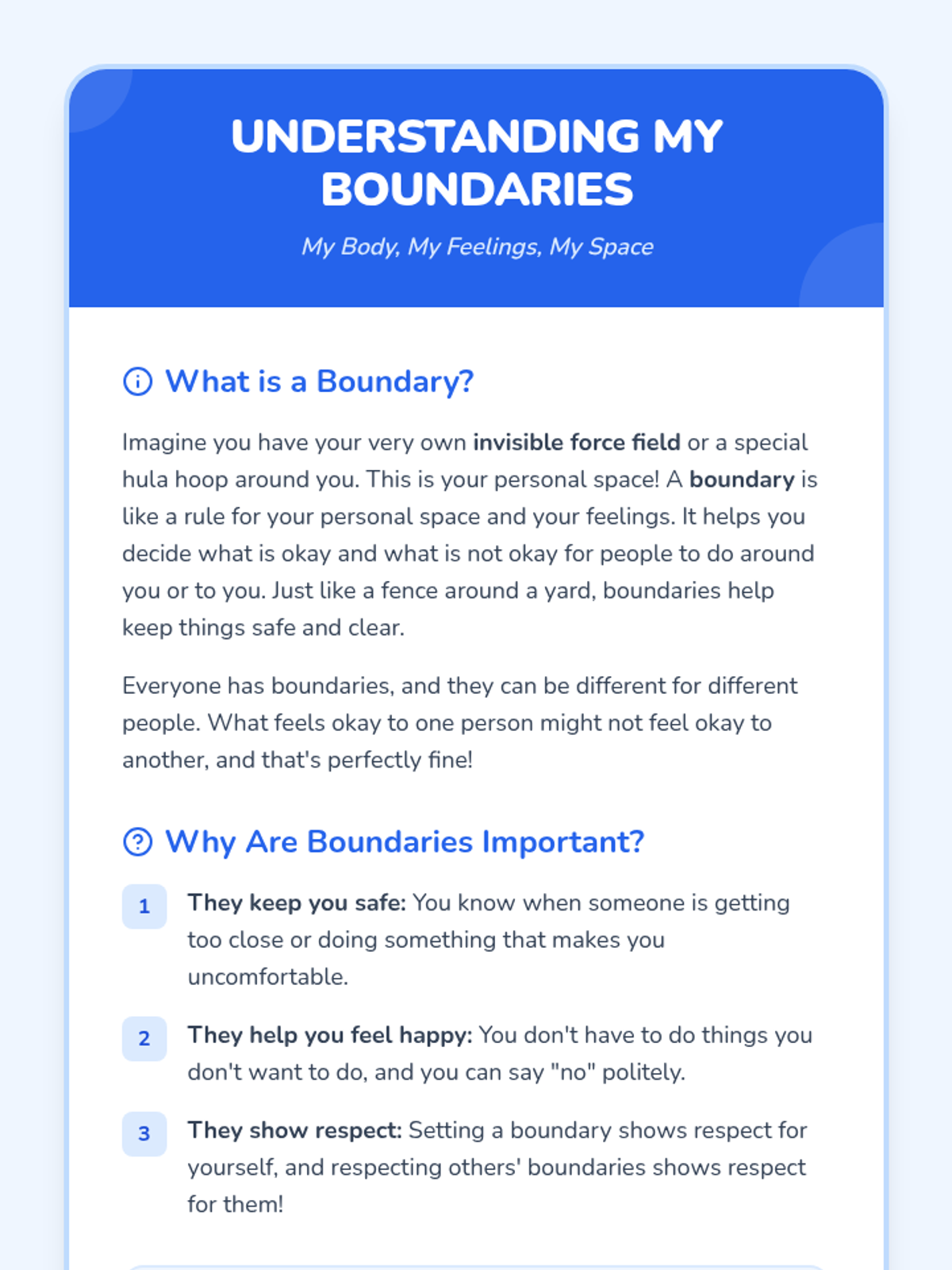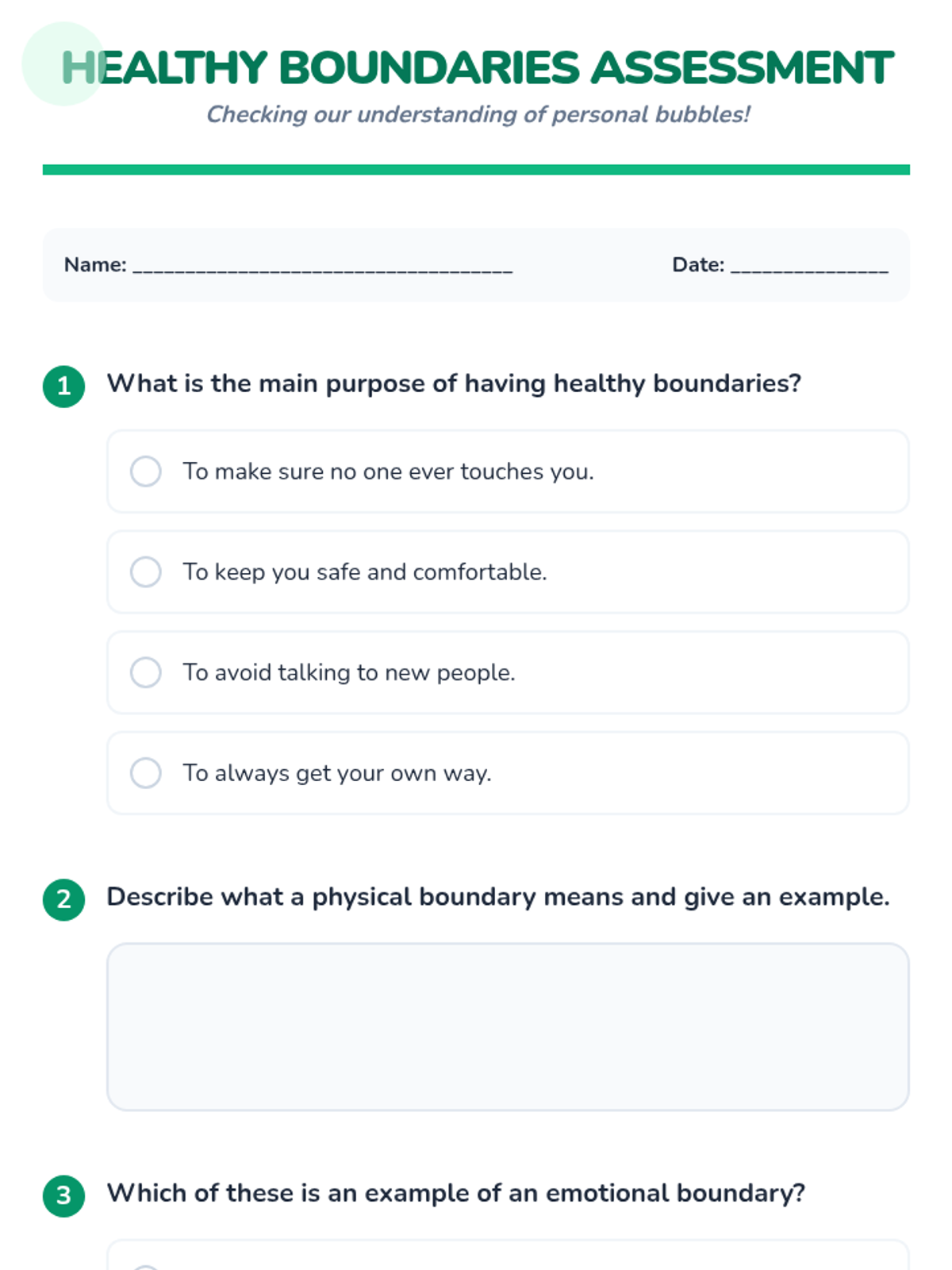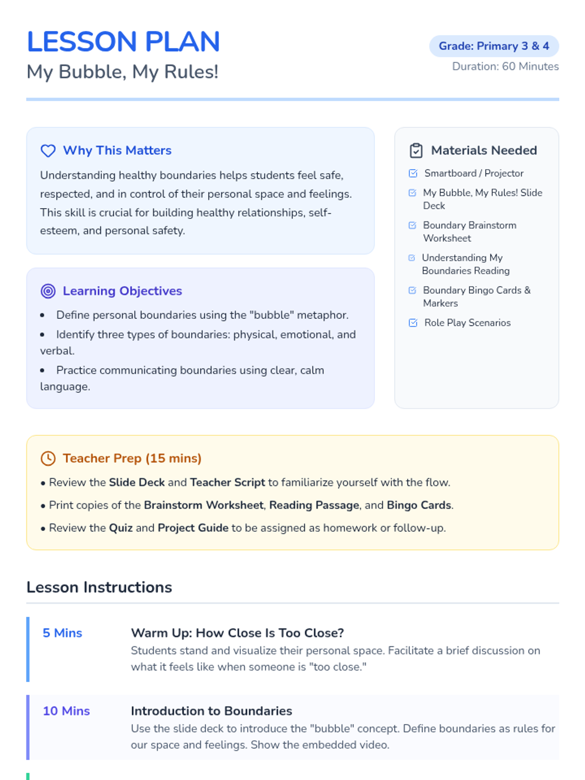 A 60-minute interactive lesson for Primary 3 & 4 students to understand personal space, identify types of boundaries (physical, emotional, verbal), and practice assertive communication. Students explore the 'bubble' metaphor to build self-respect and healthy relationships.