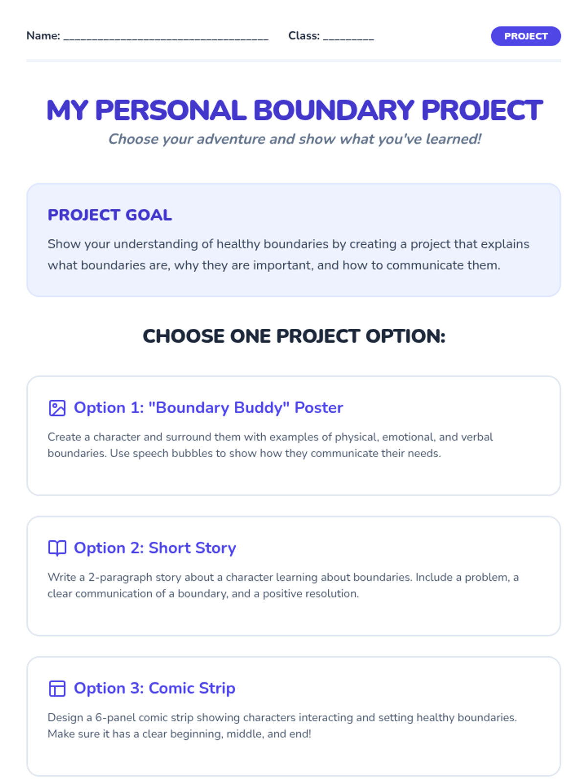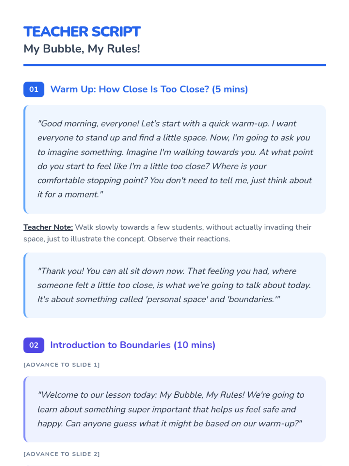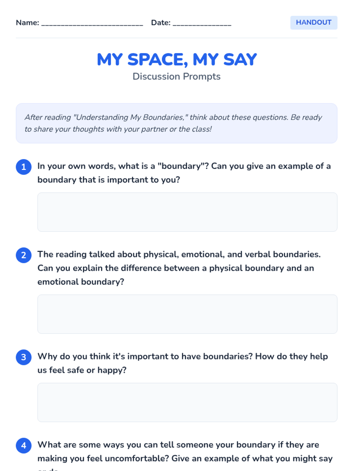 A 60-minute interactive lesson for Primary 3 & 4 students to understand personal space, identify types of boundaries (physical, emotional, verbal), and practice assertive communication. Students explore the 'bubble' metaphor to build self-respect and healthy relationships.