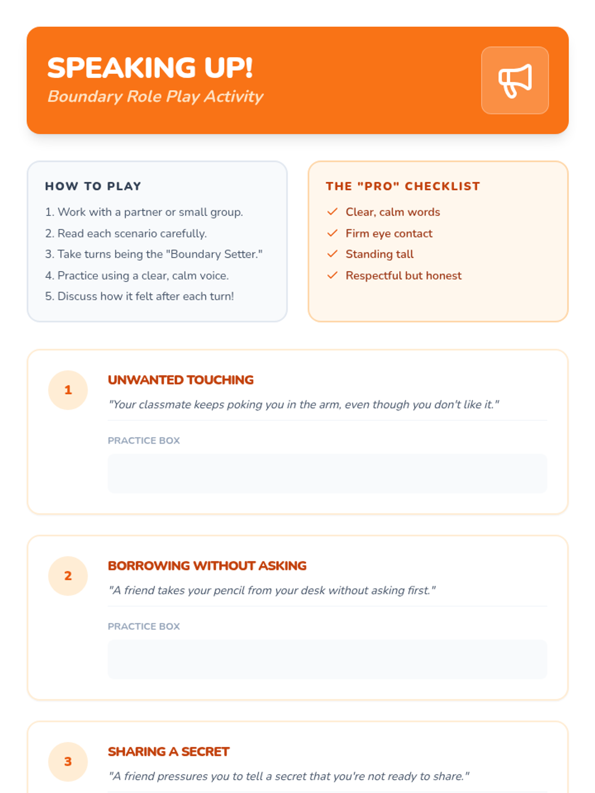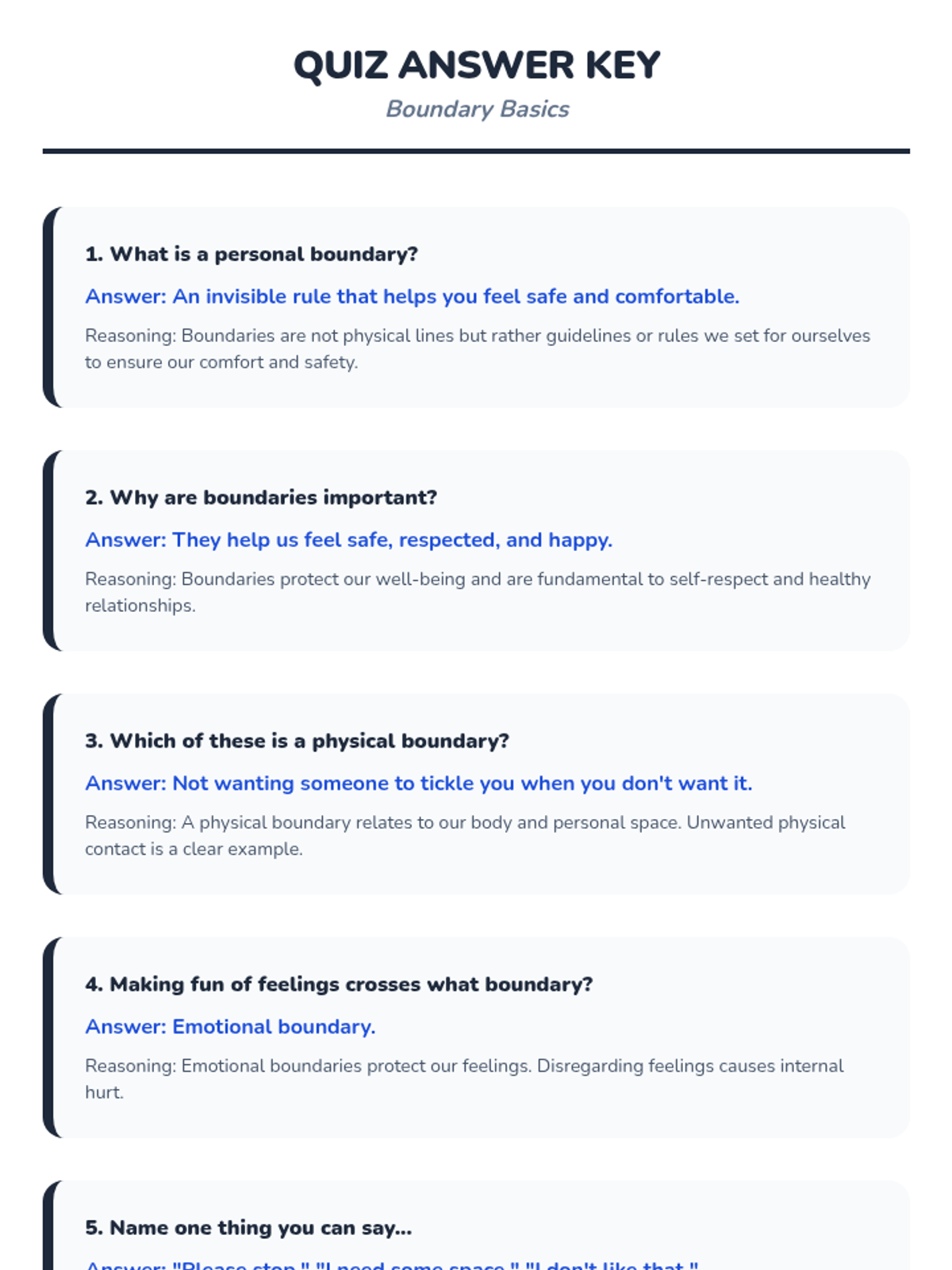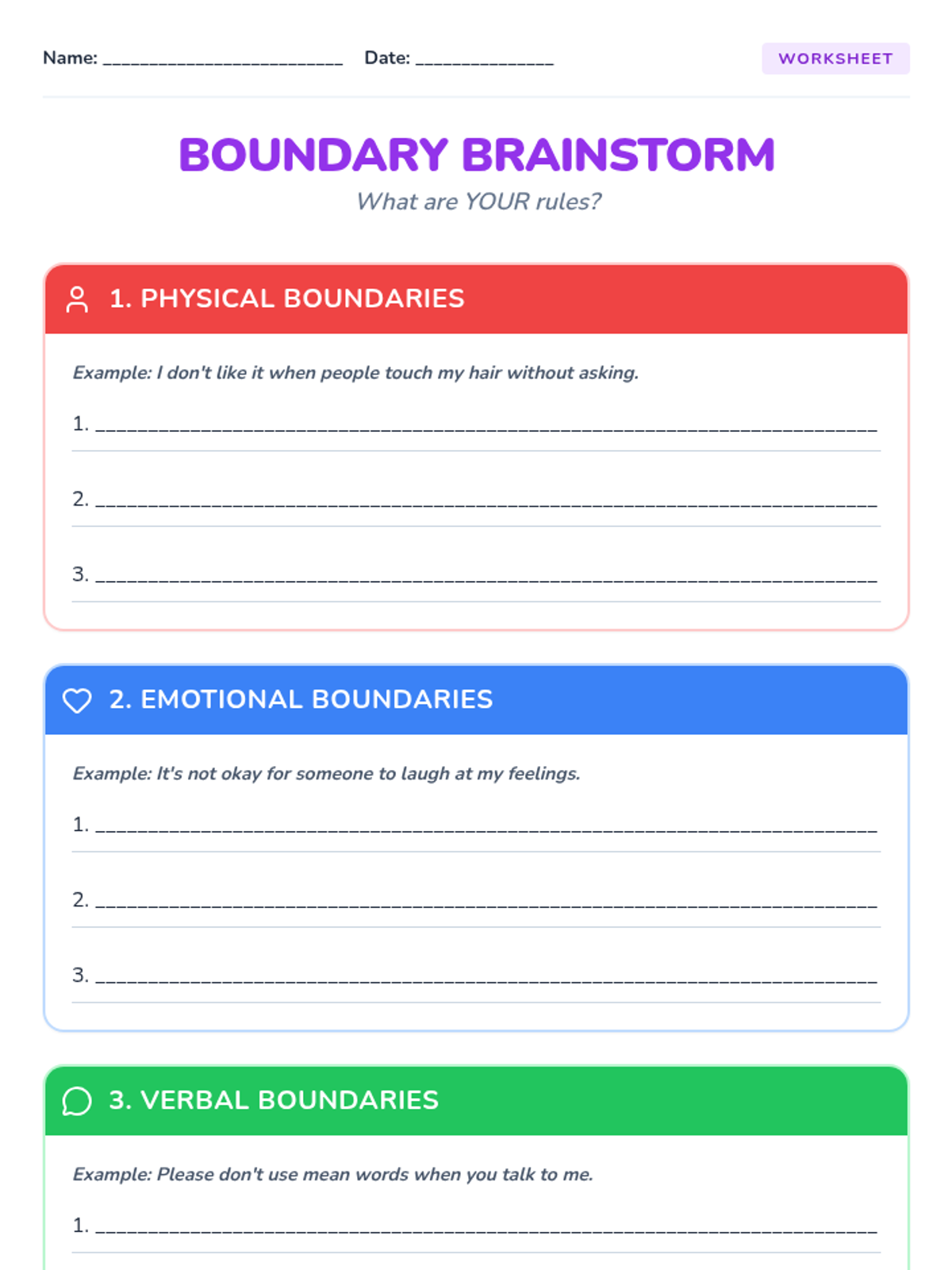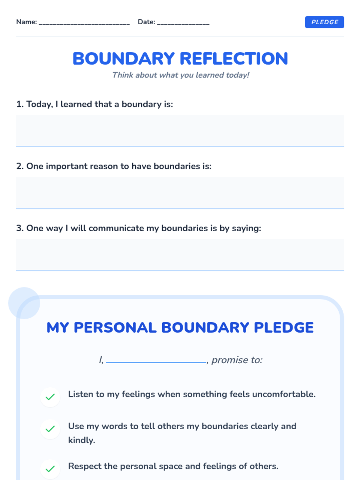 A 60-minute interactive lesson for Primary 3 & 4 students to understand personal space, identify types of boundaries (physical, emotional, verbal), and practice assertive communication. Students explore the 'bubble' metaphor to build self-respect and healthy relationships.