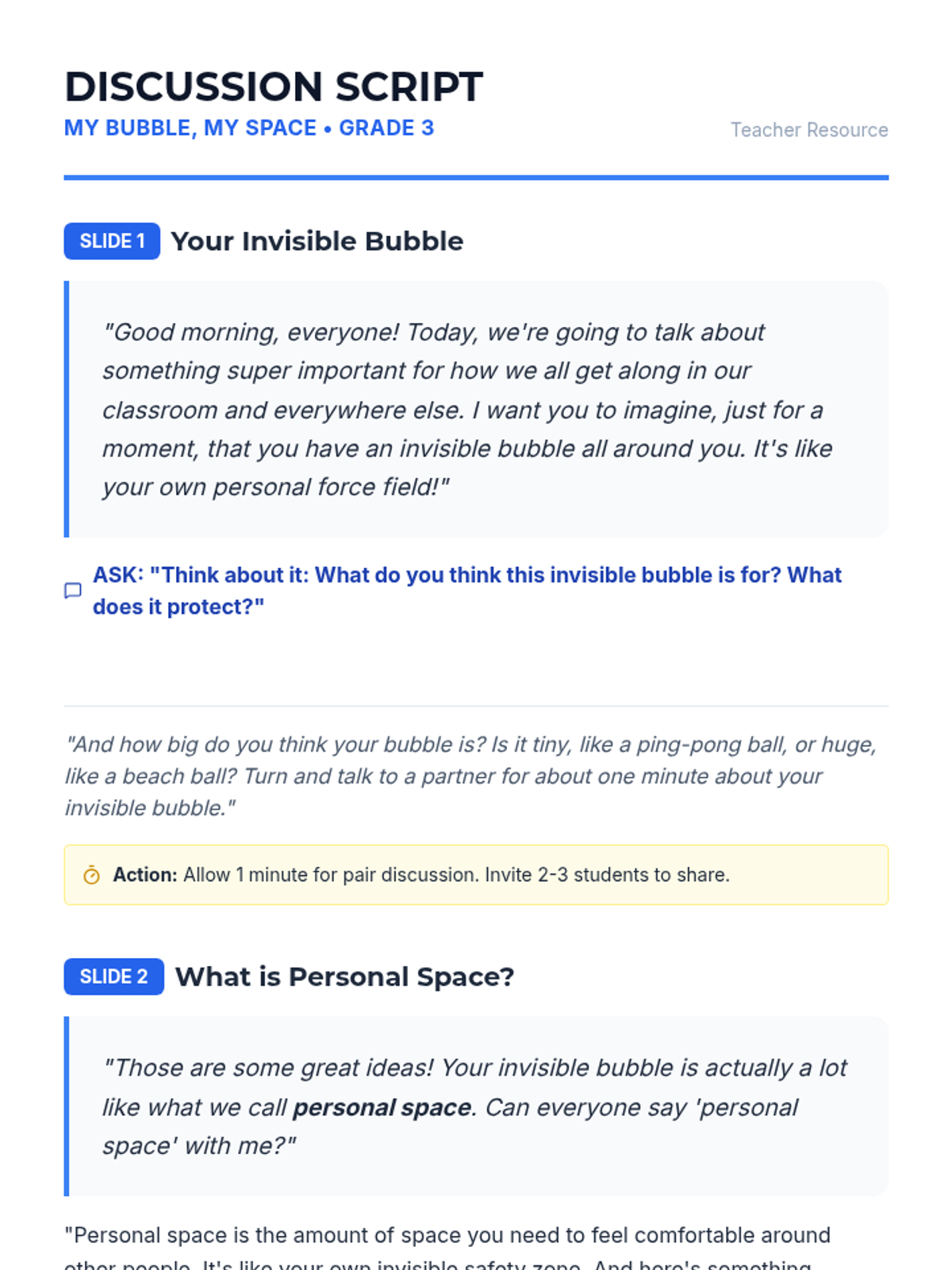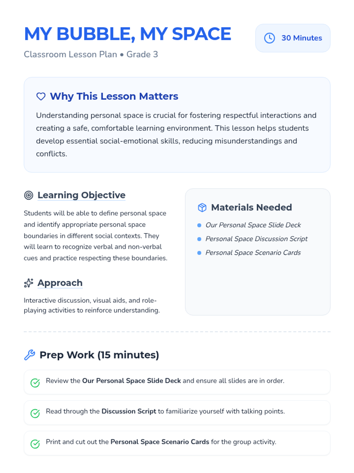 This lesson helps 3rd-grade students understand and respect personal space through the concept of 'invisible bubbles.' It teaches appropriate social distances, verbal/non-verbal cues, and boundary respect in various contexts.