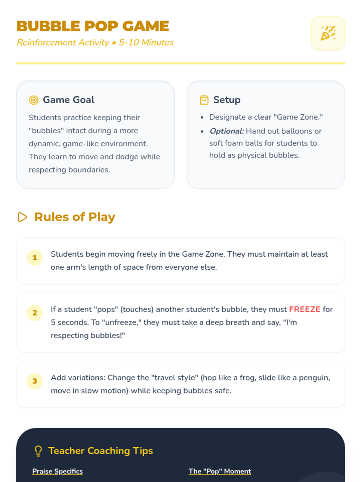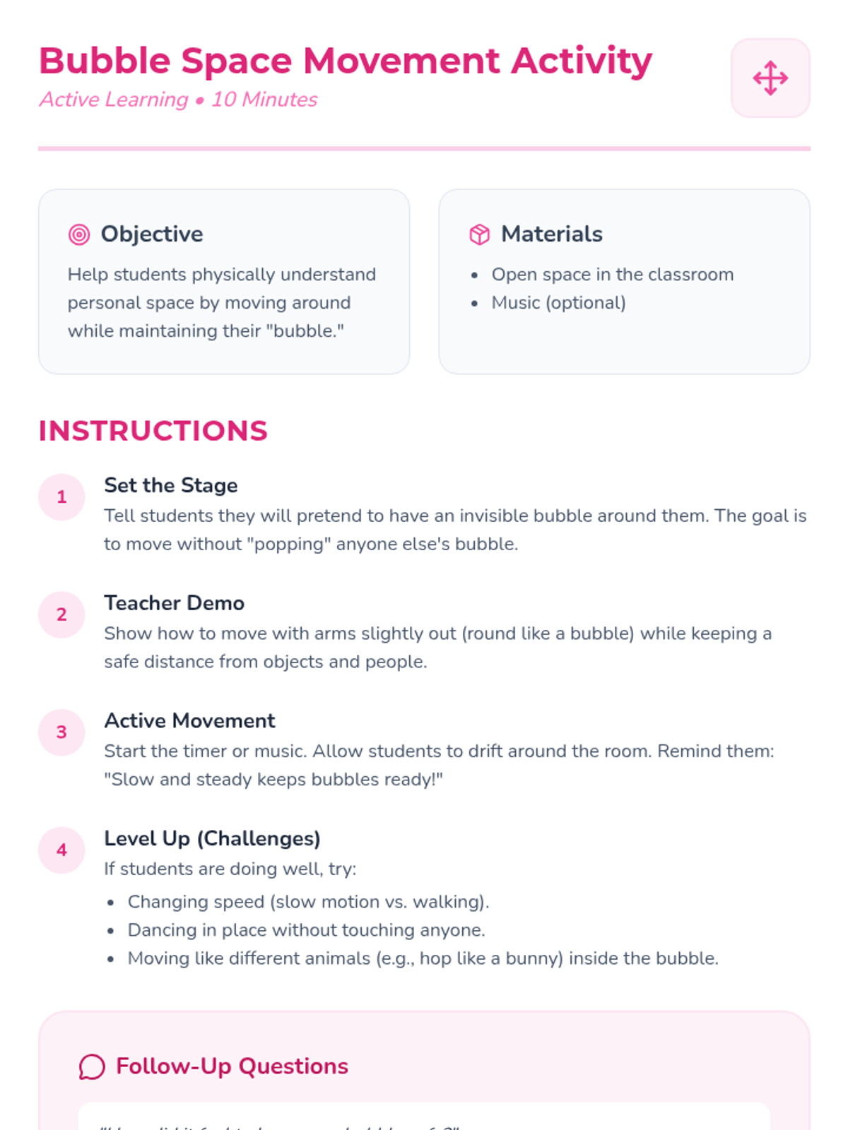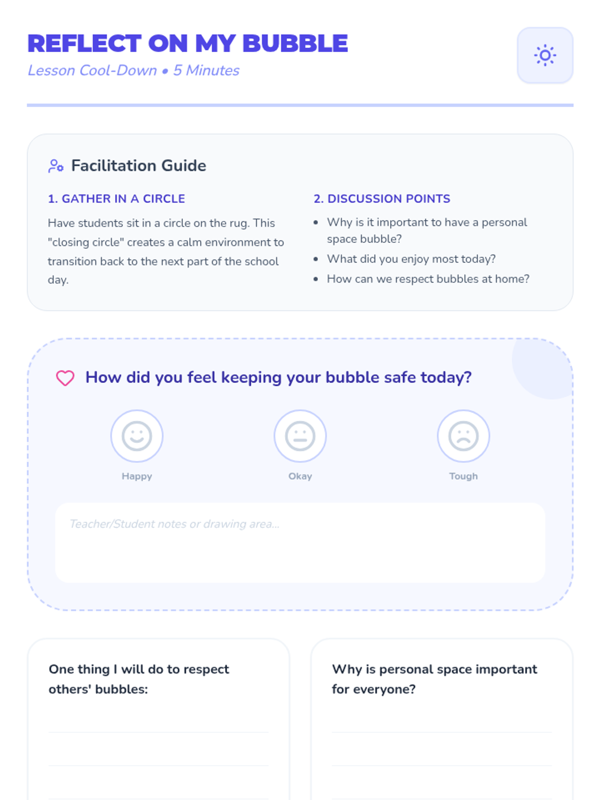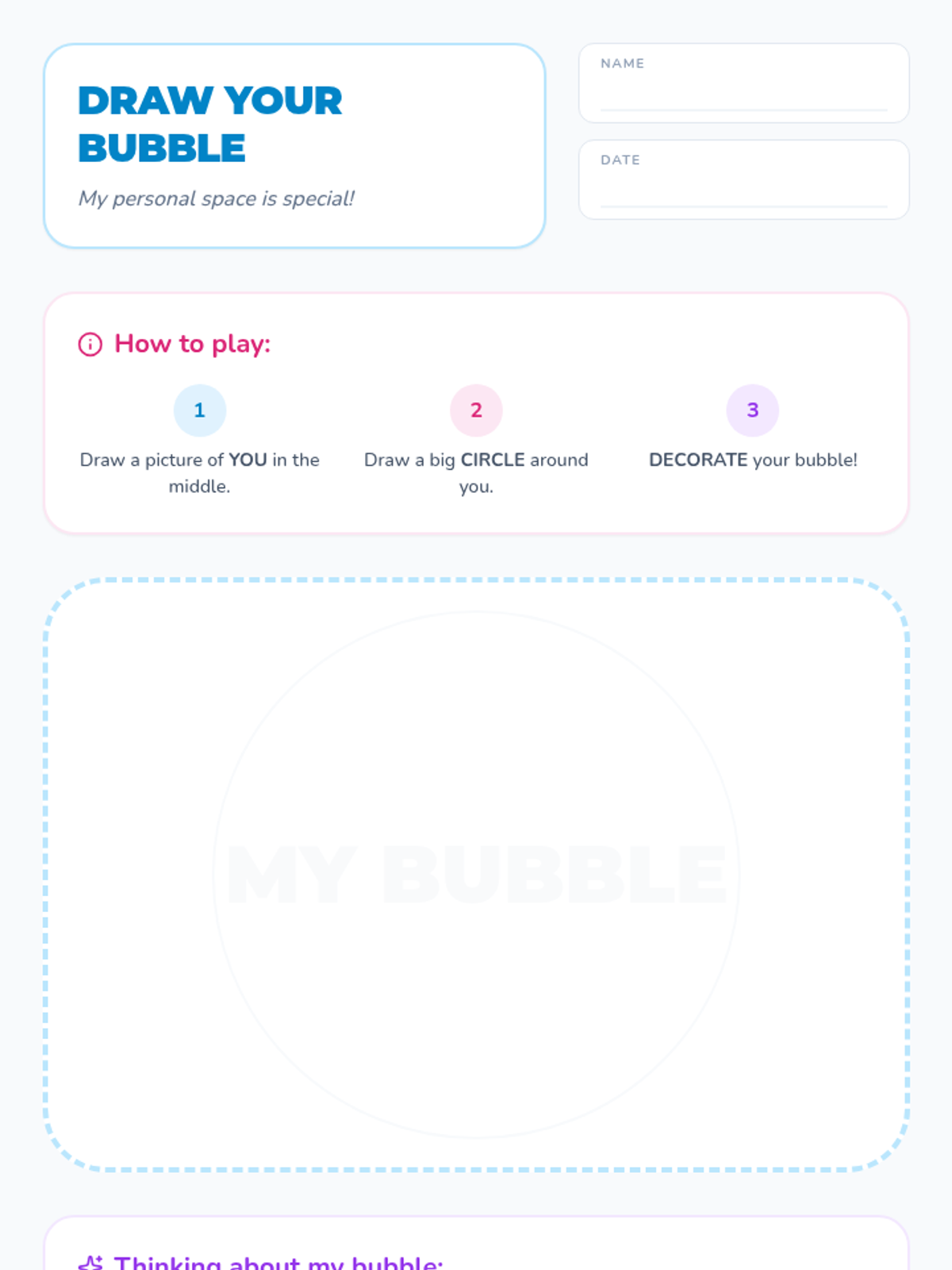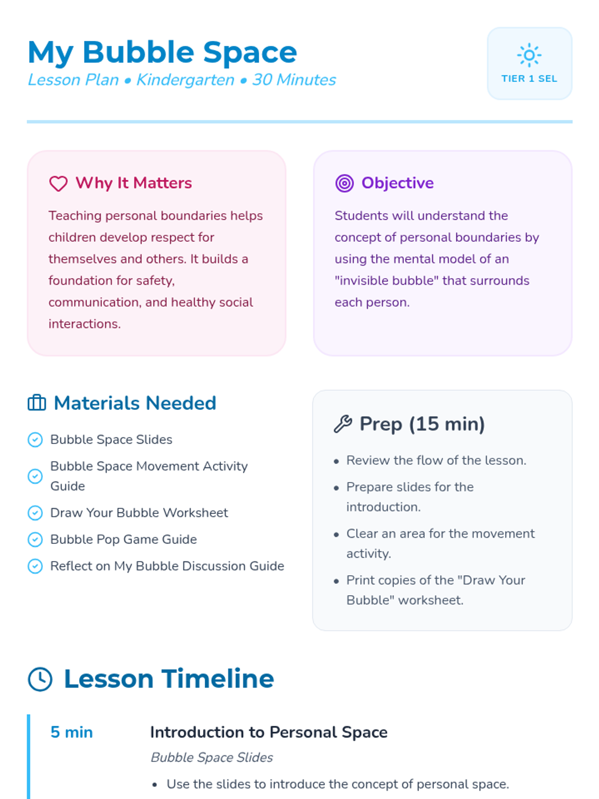 An introductory social-emotional learning lesson for kindergarten students to understand personal space using the concept of an invisible bubble.