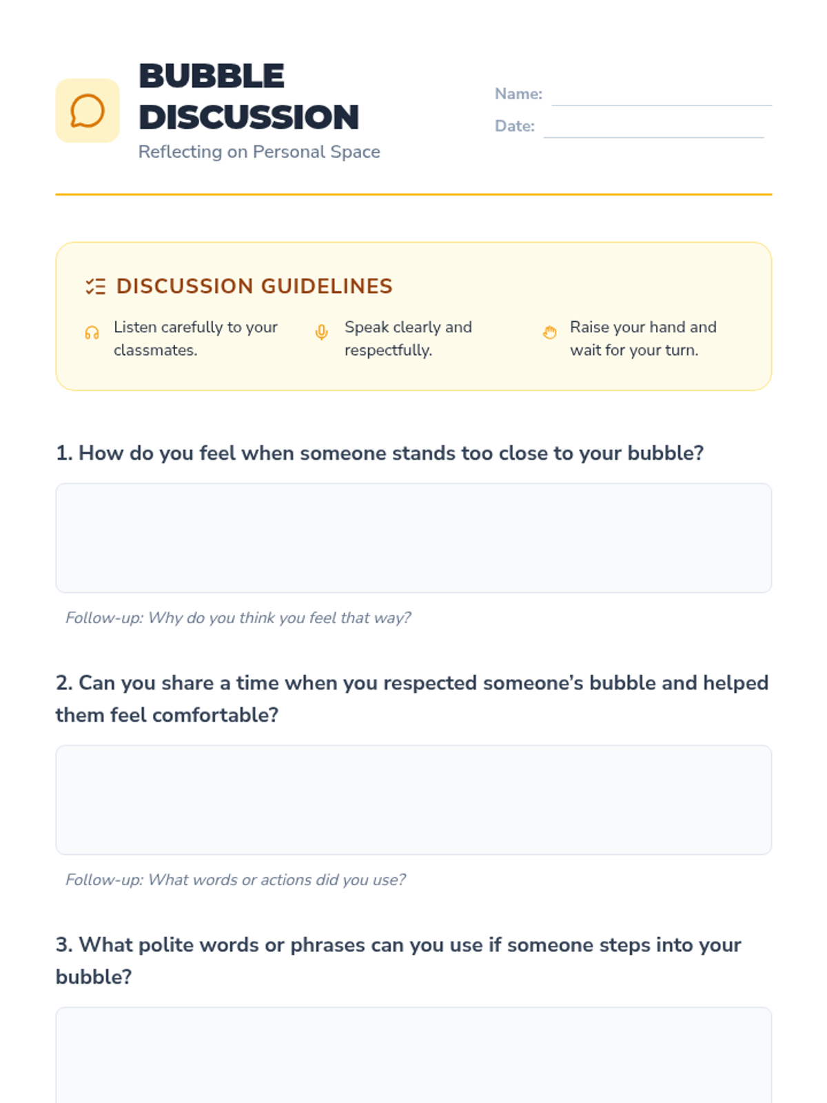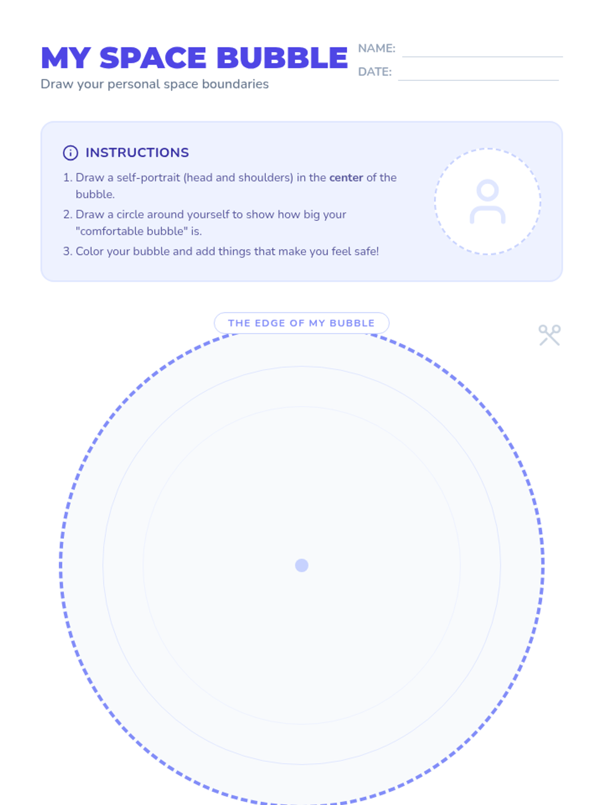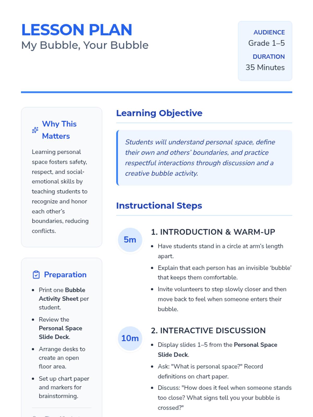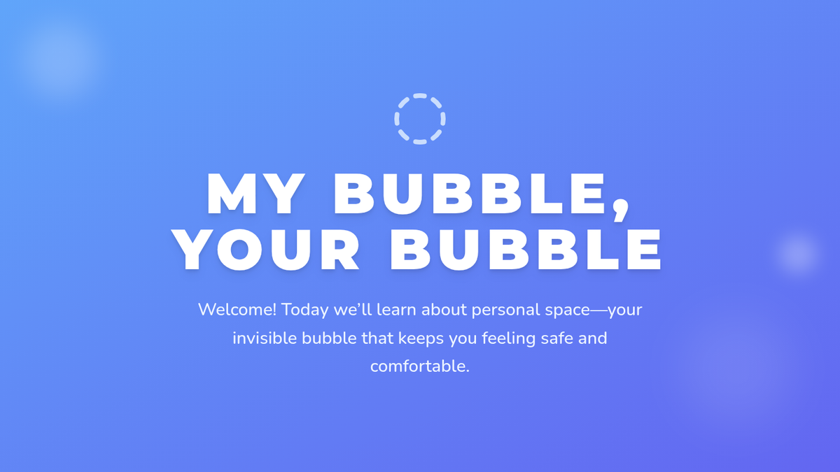 A gentle and engaging lesson for Grade 1–5 students to learn about personal space boundaries, identifying their own "bubbles," and practicing respectful interactions with others.