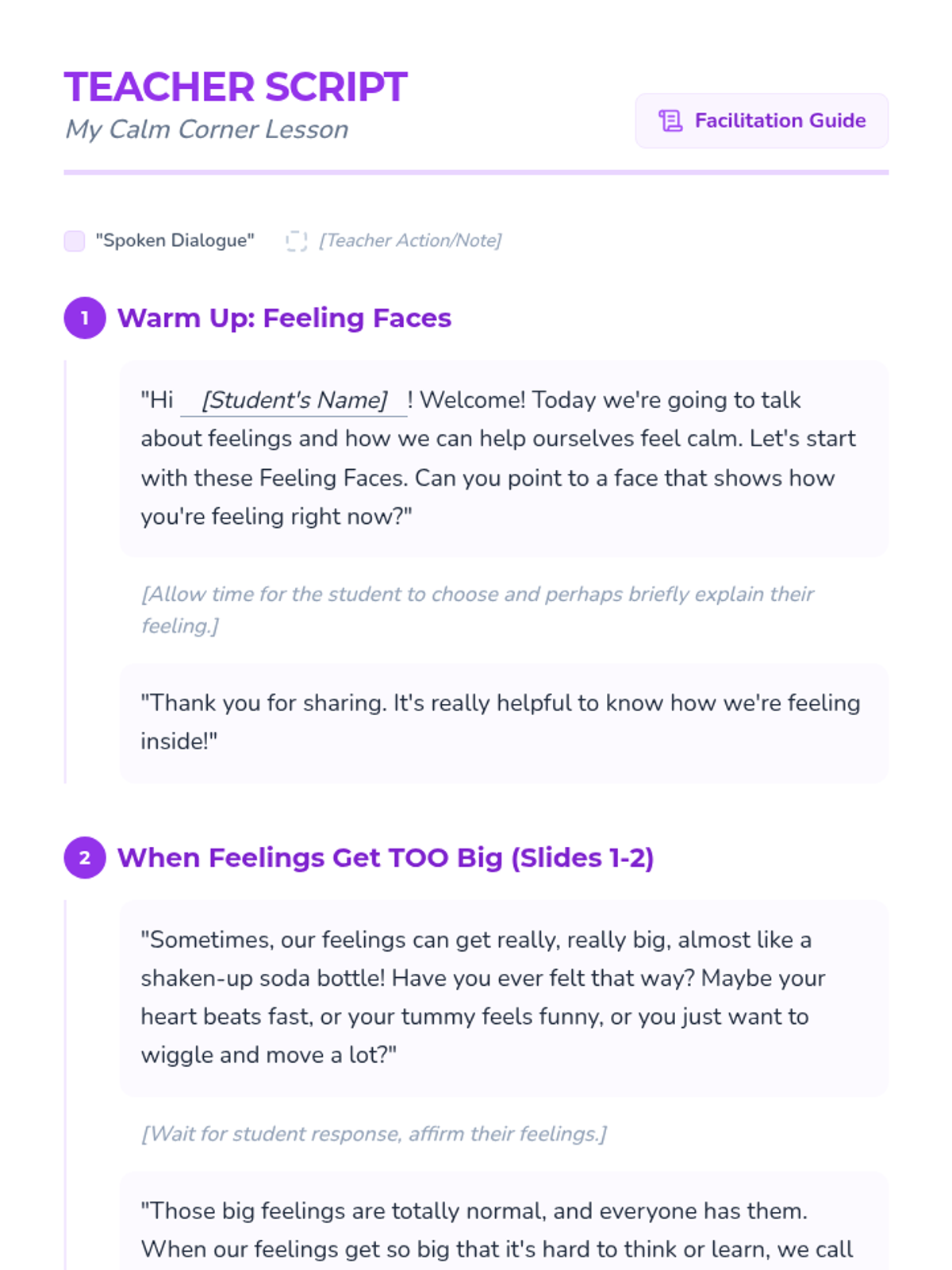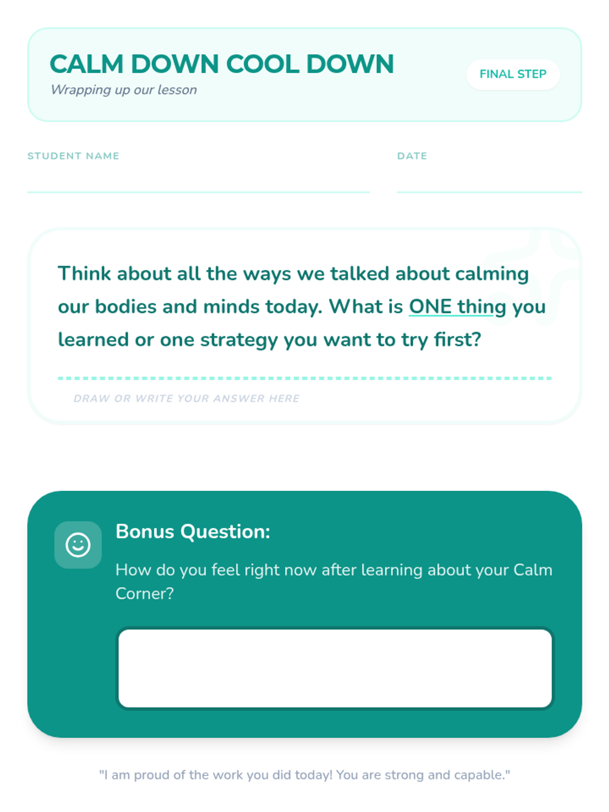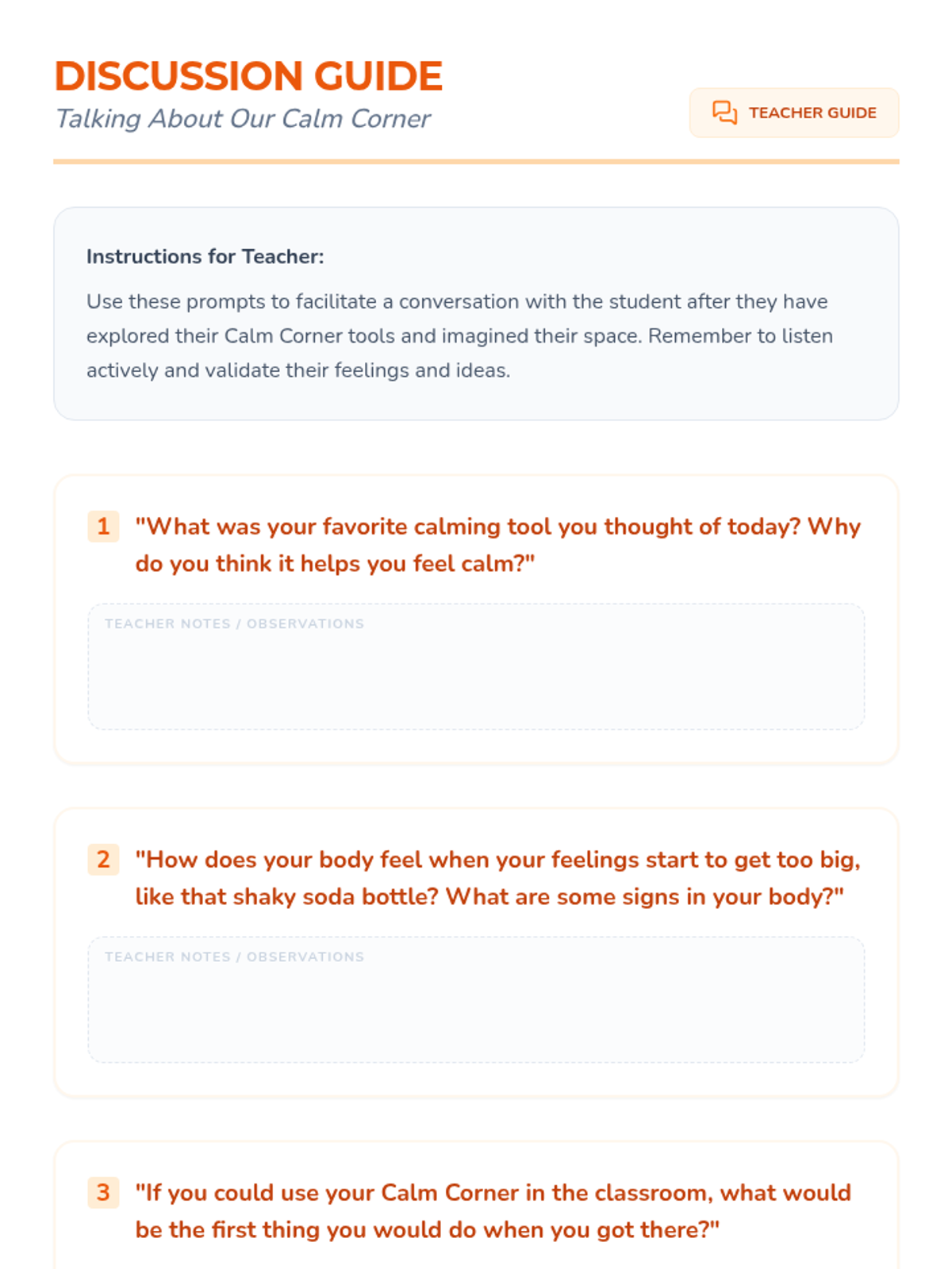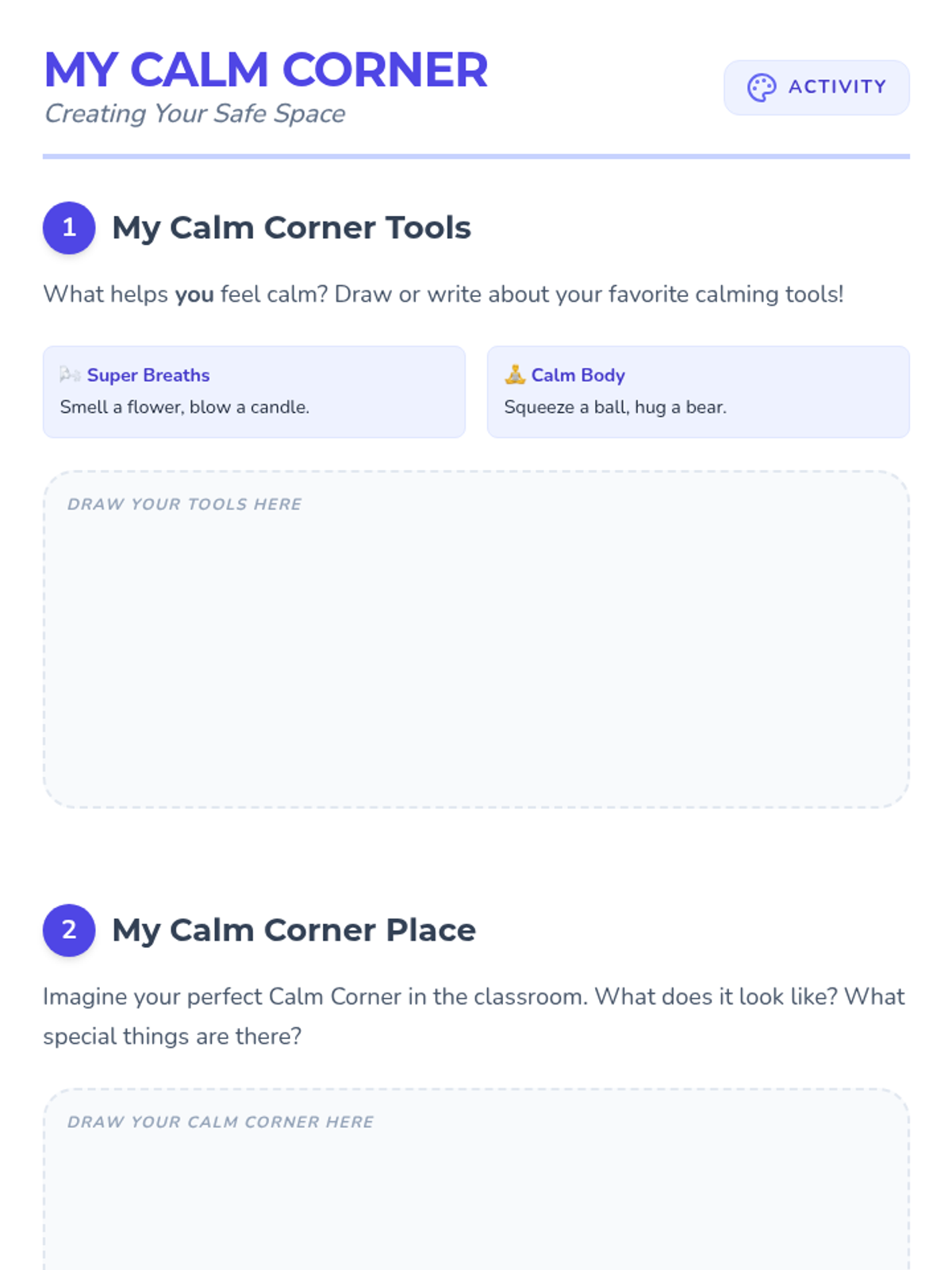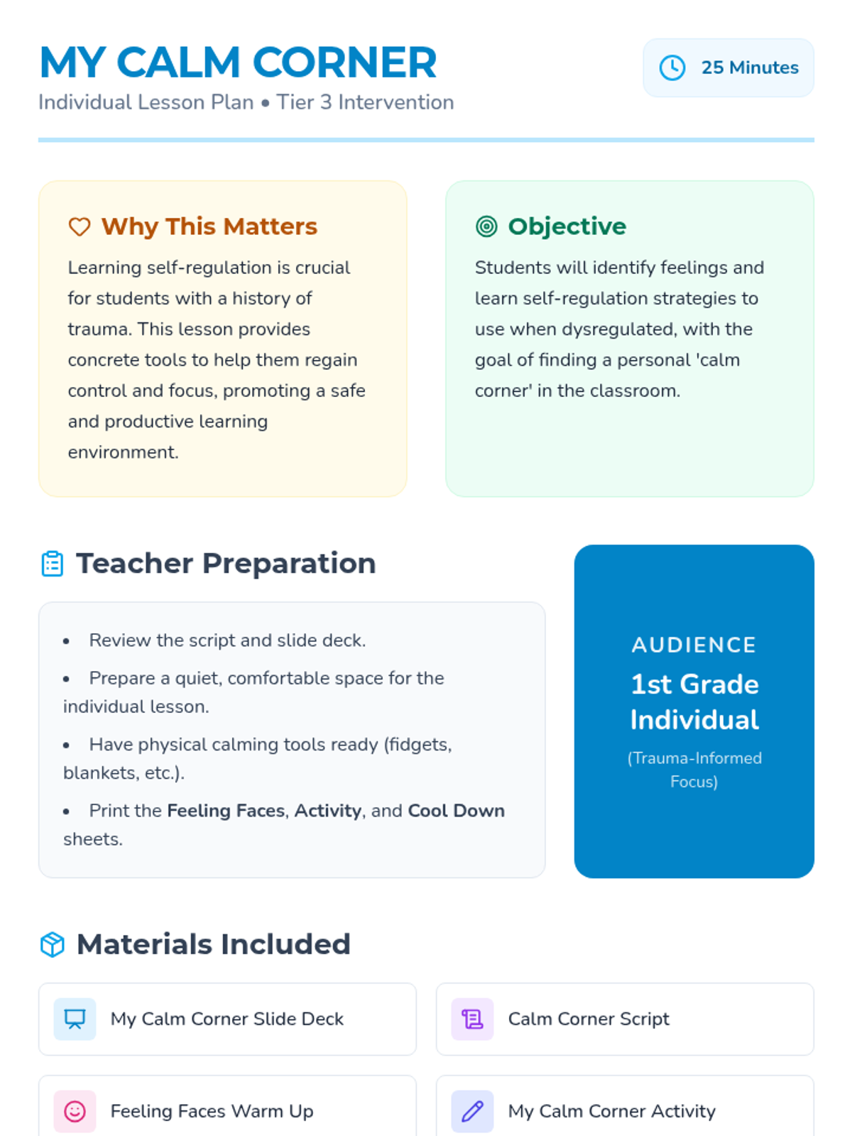 A 25-minute individual Tier 3 lesson for 1st-grade students with a history of trauma, focusing on identifying dysregulation and developing a personalized 'calm corner' with self-regulation tools.