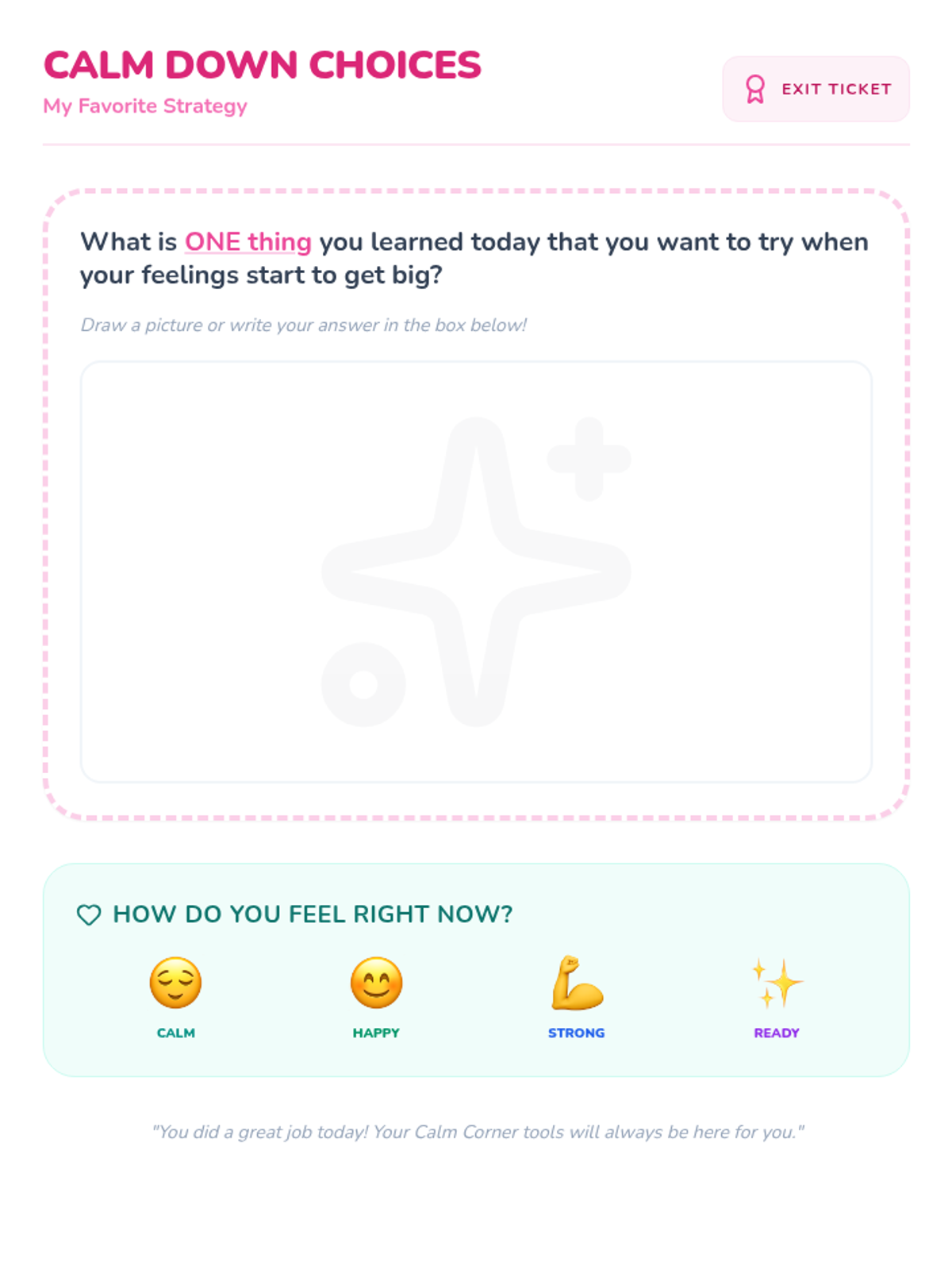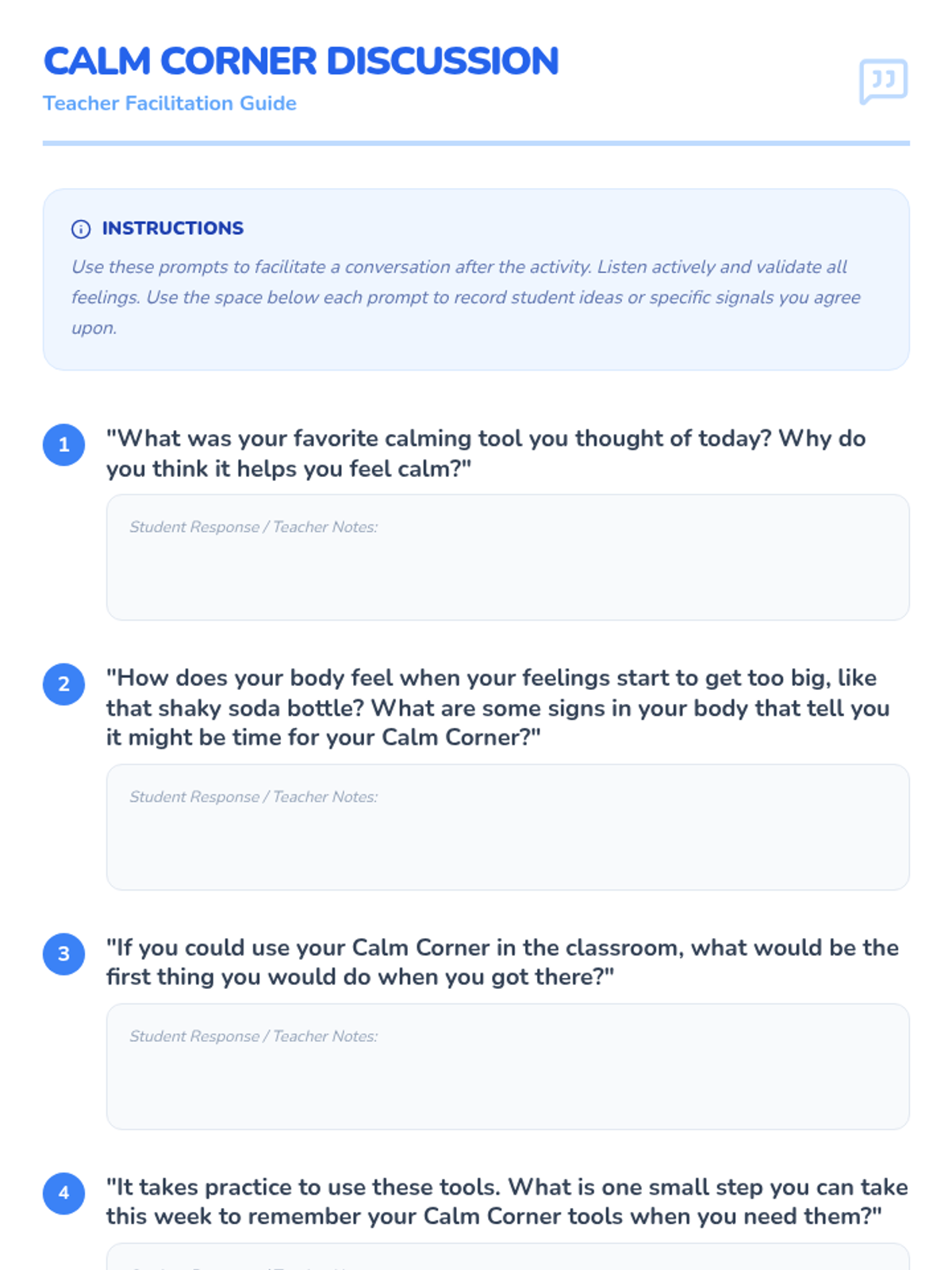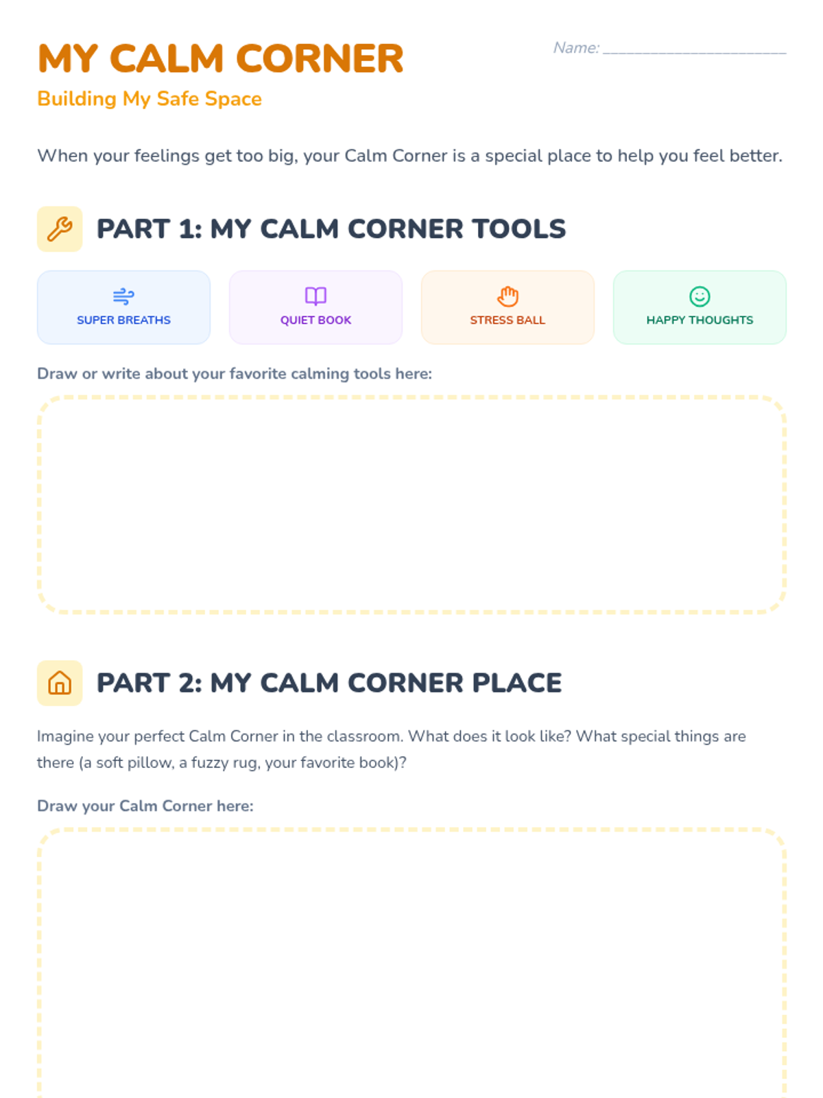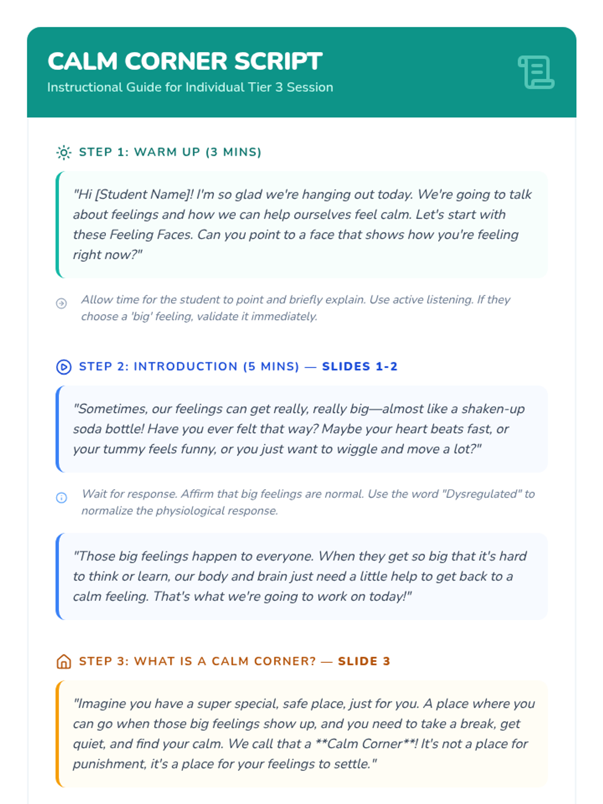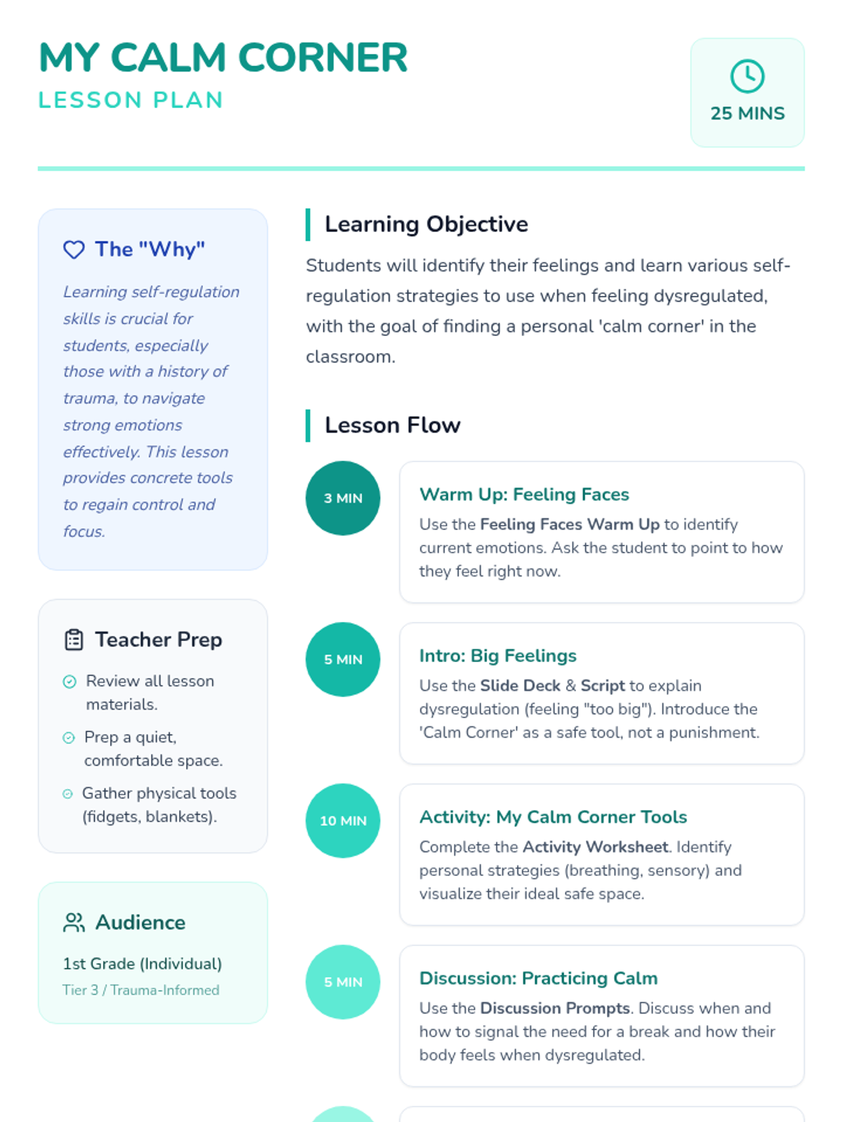A 25-minute Tier 3 individual lesson for 1st-grade students focusing on identifying feelings and learning self-regulation strategies through the concept of a 'Calm Corner'.