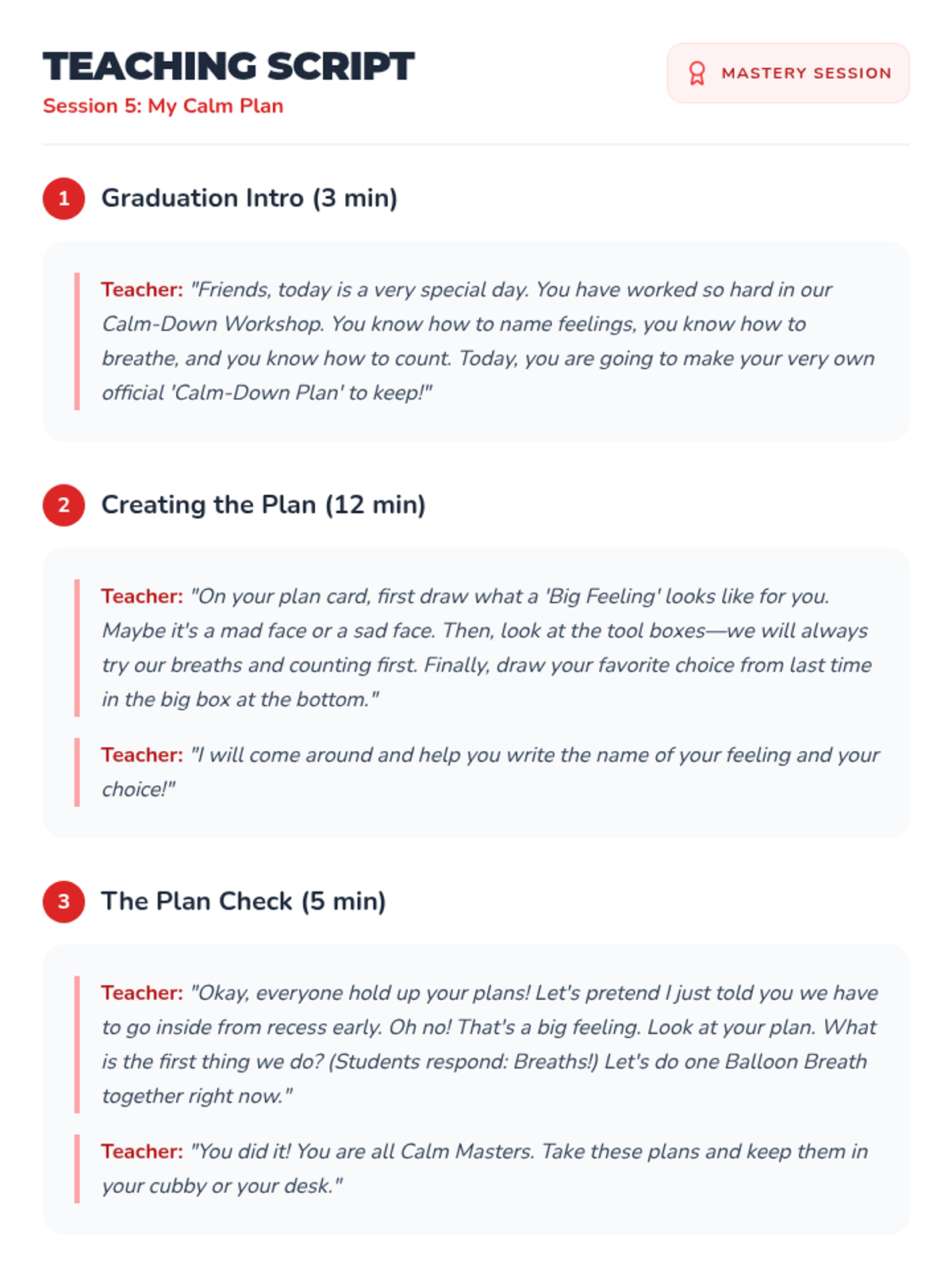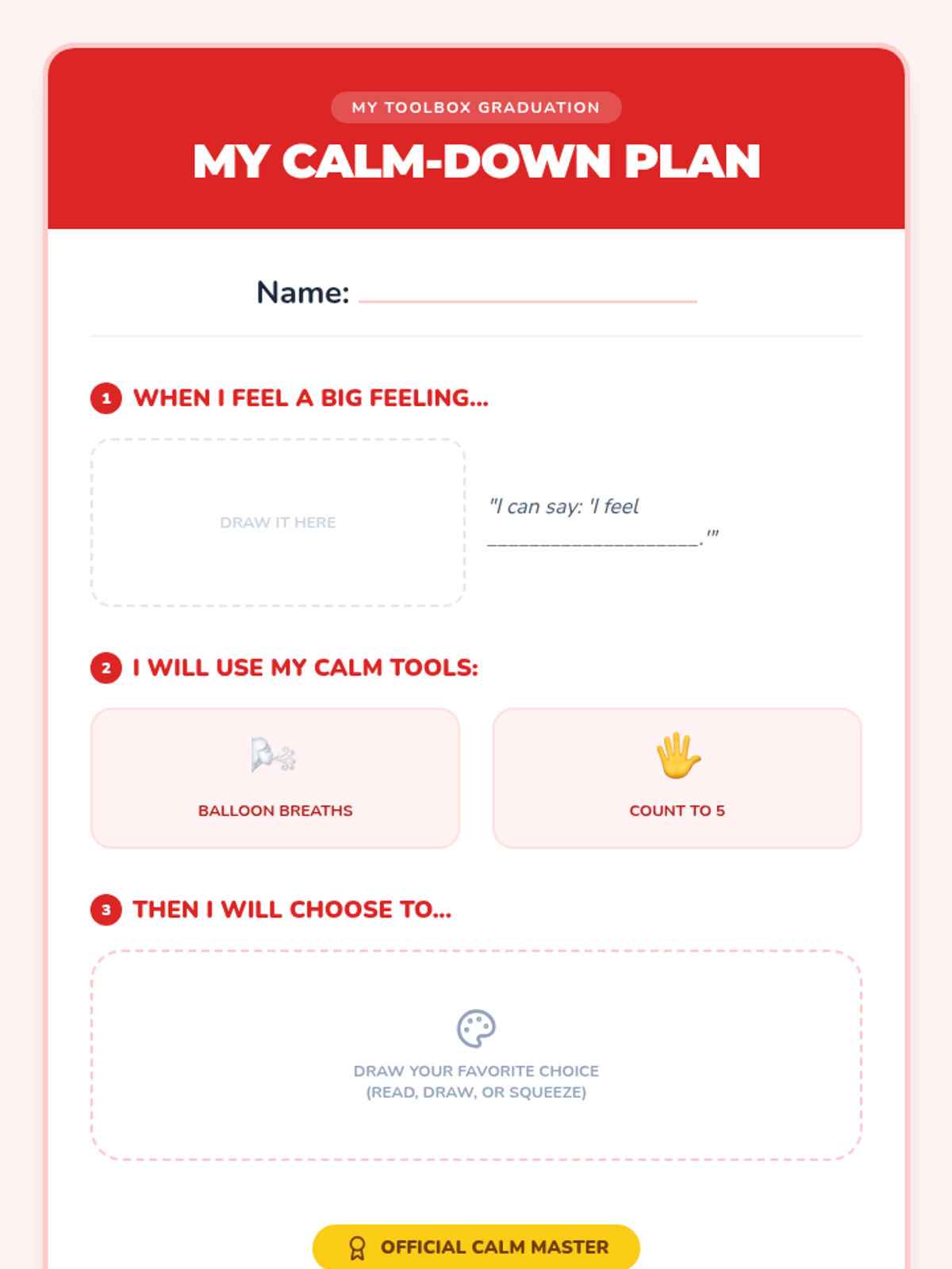 Students create their own personalized 'Calm-Down Toolbox' plan to keep at their desk or take home, summarizing everything they've learned.