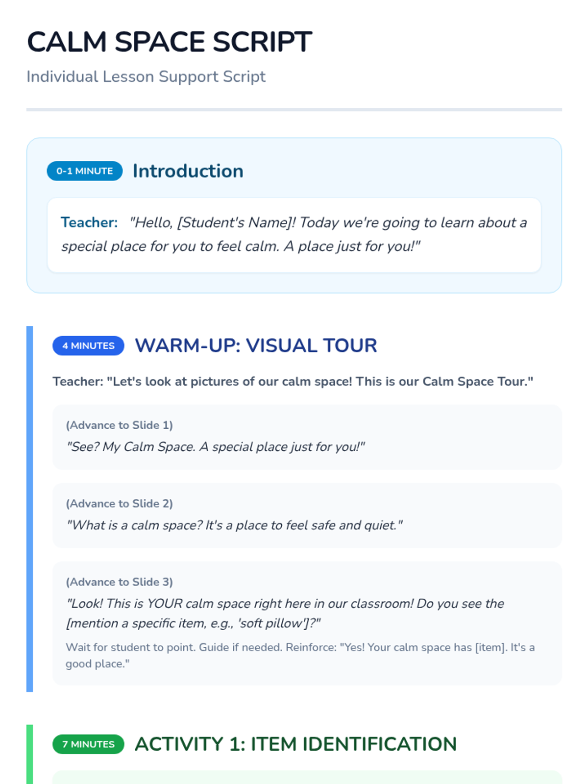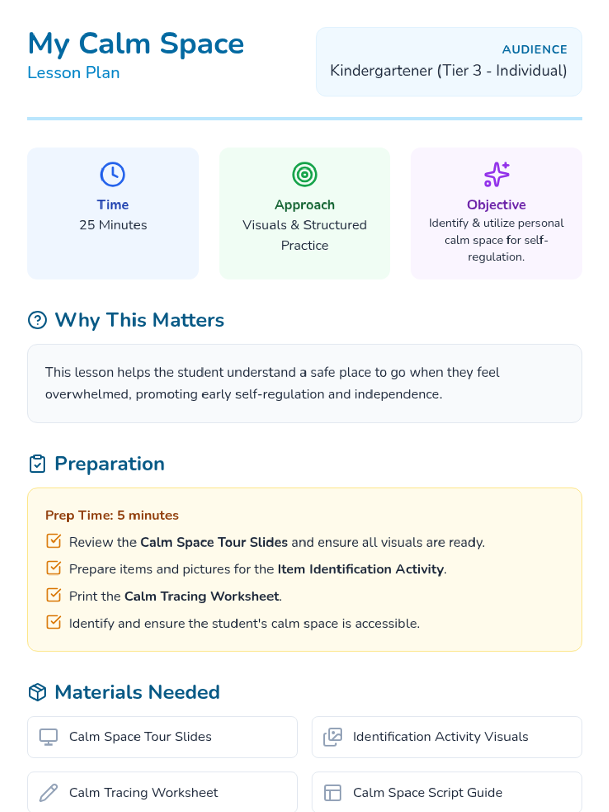 This 25-minute individual lesson for a kindergartener with limited speech and autism spectrum disorder focuses on identifying and utilizing a personal calm space within the classroom to begin developing self-regulation skills.