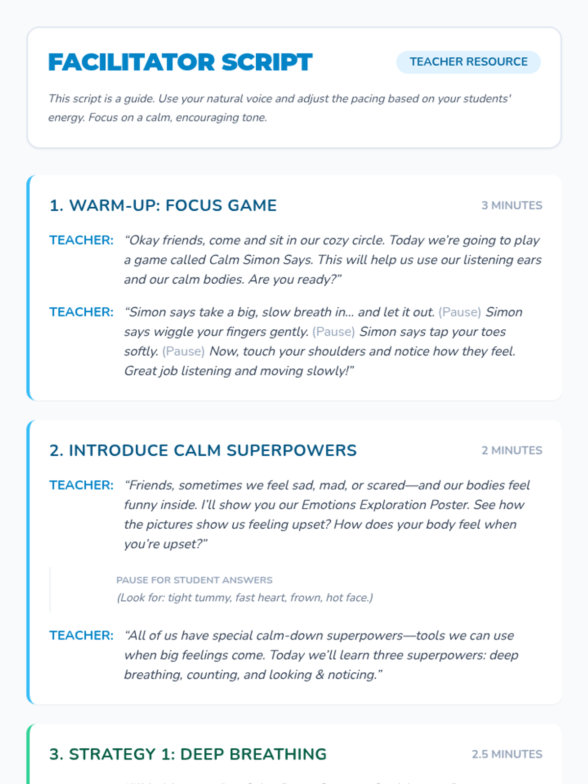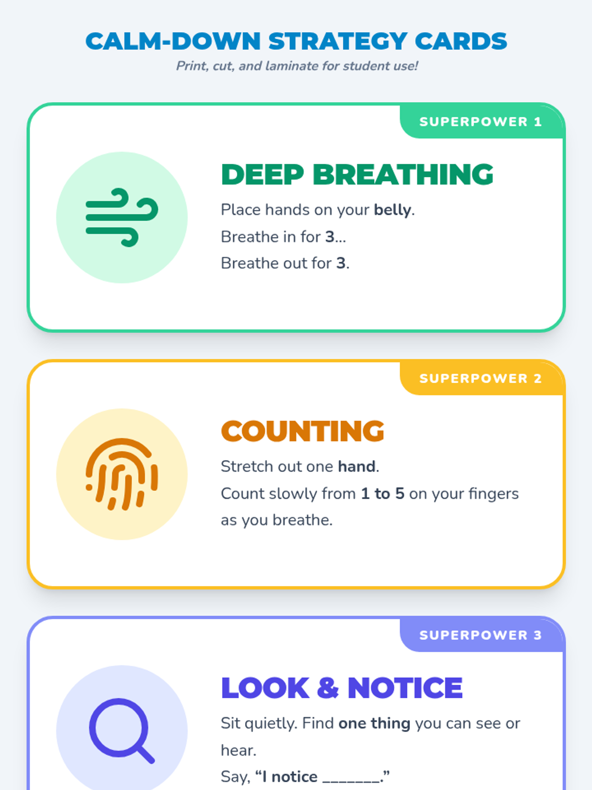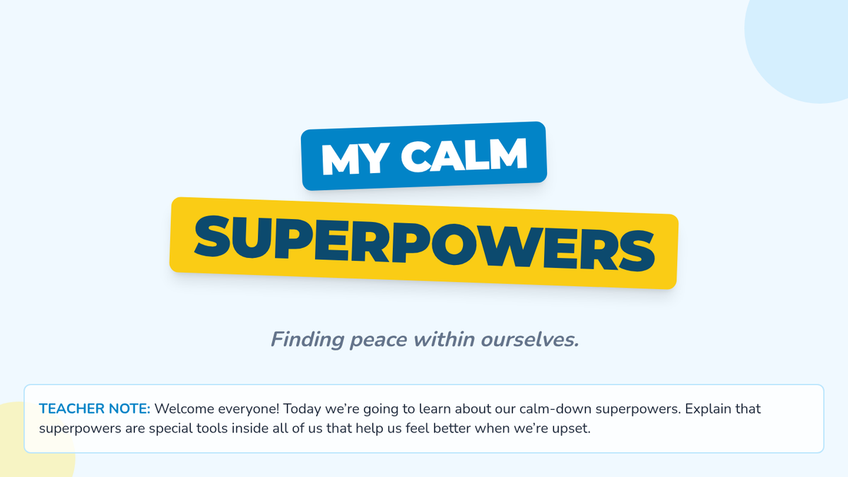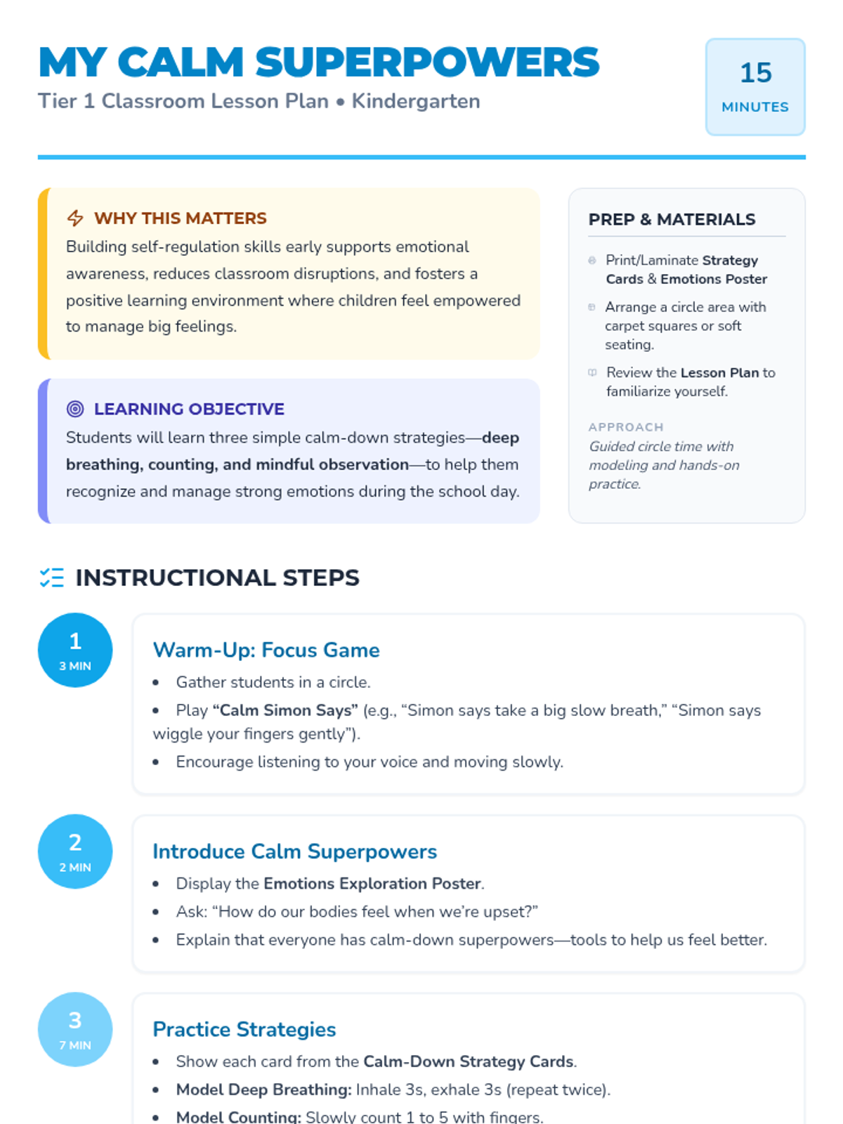 A 15-minute kindergarten lesson introducing three self-regulation 'superpowers'—deep breathing, counting, and mindful observation—to help young learners manage big emotions and build a positive classroom environment.
