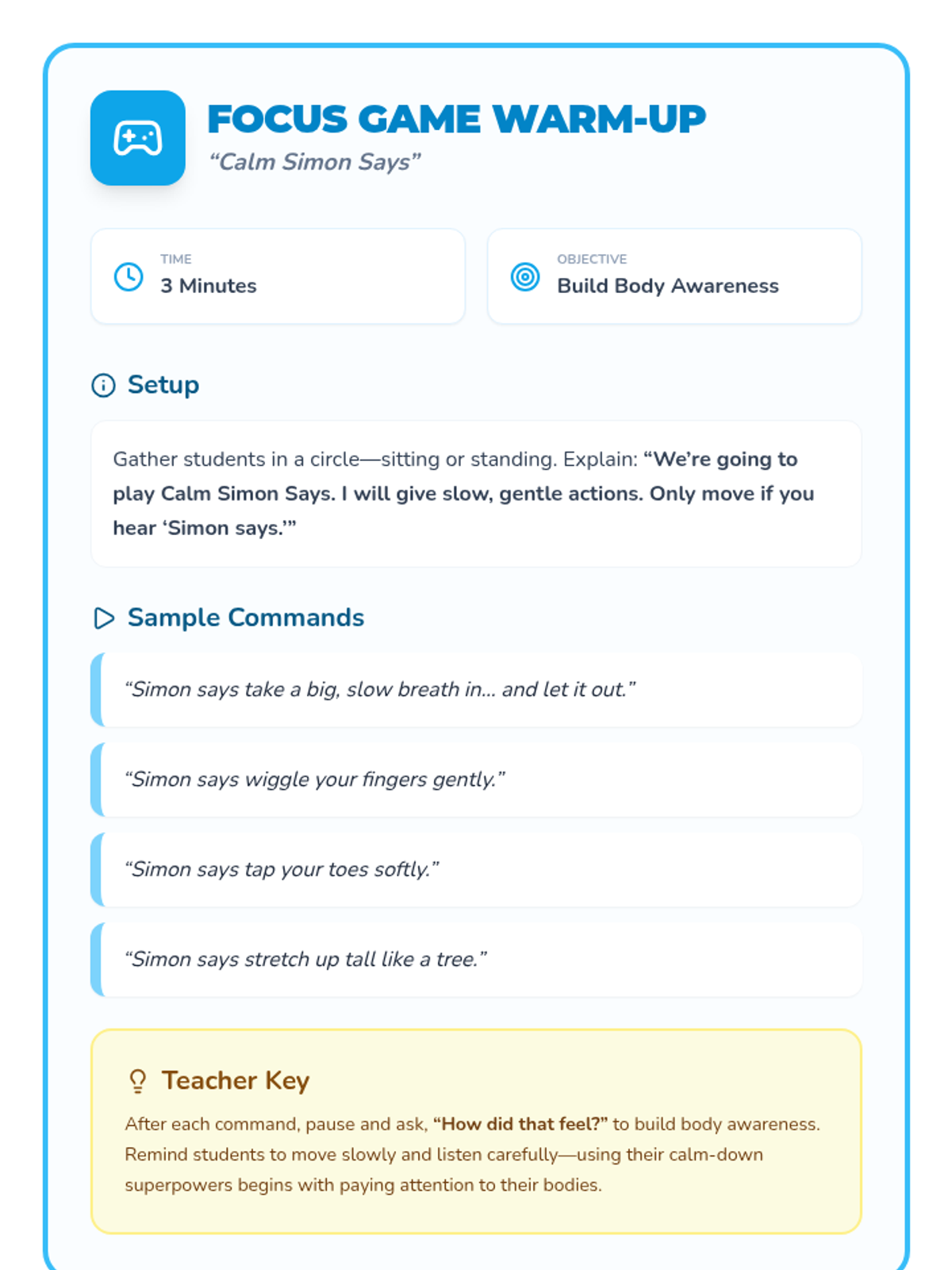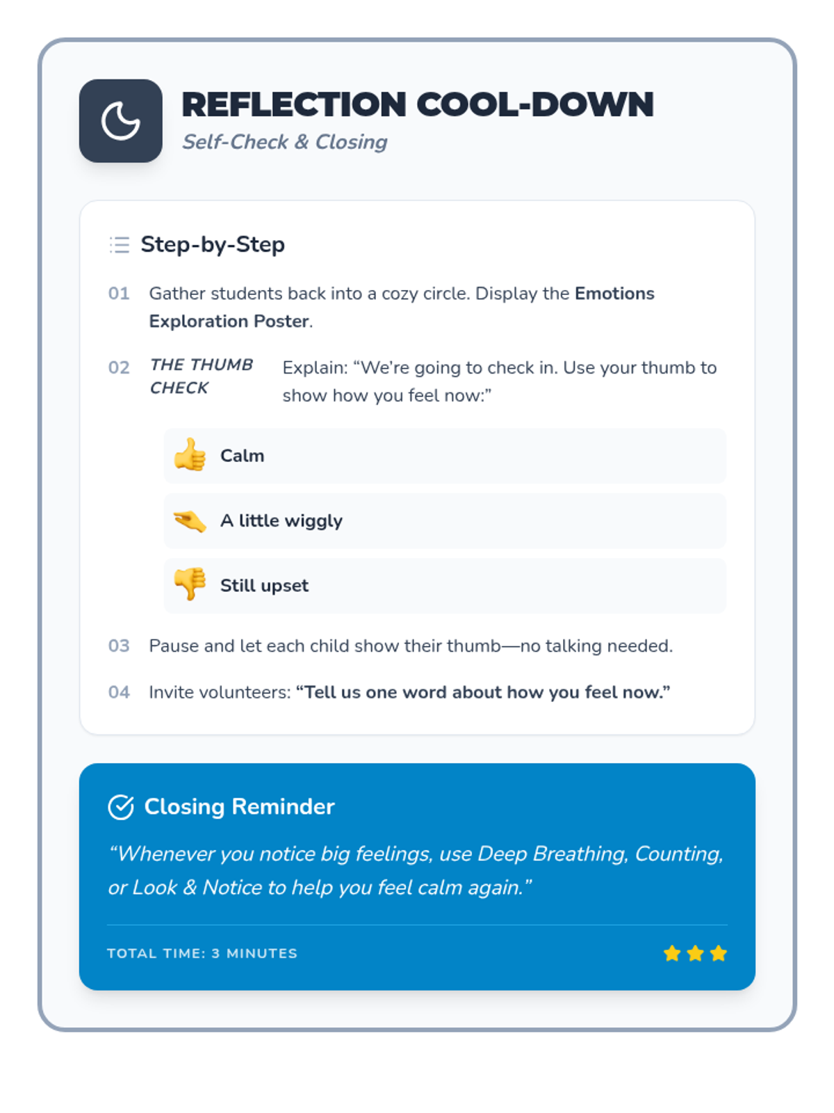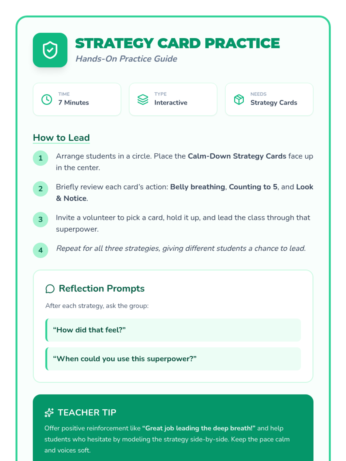 A 15-minute kindergarten lesson introducing three self-regulation 'superpowers'—deep breathing, counting, and mindful observation—to help young learners manage big emotions and build a positive classroom environment.