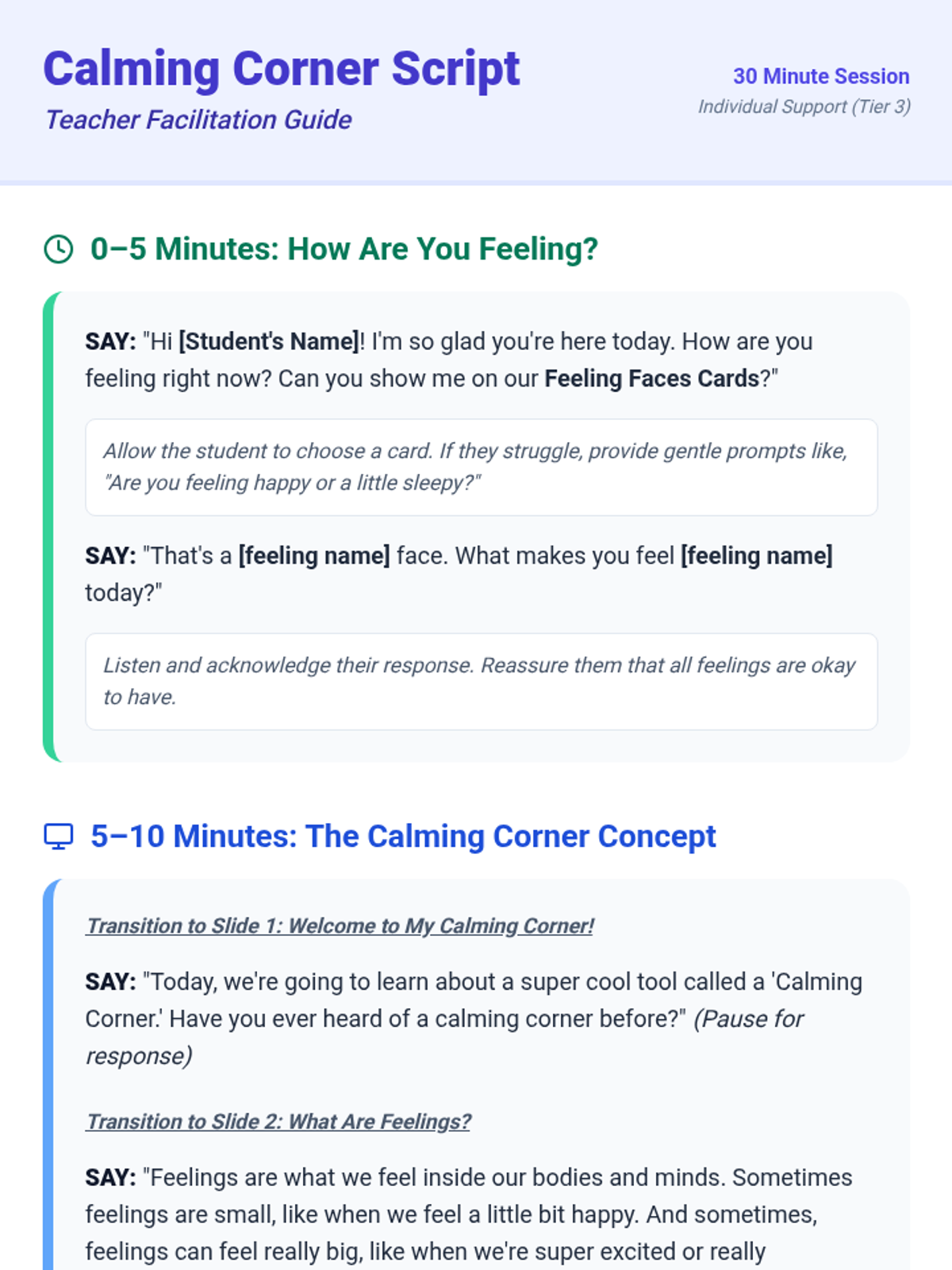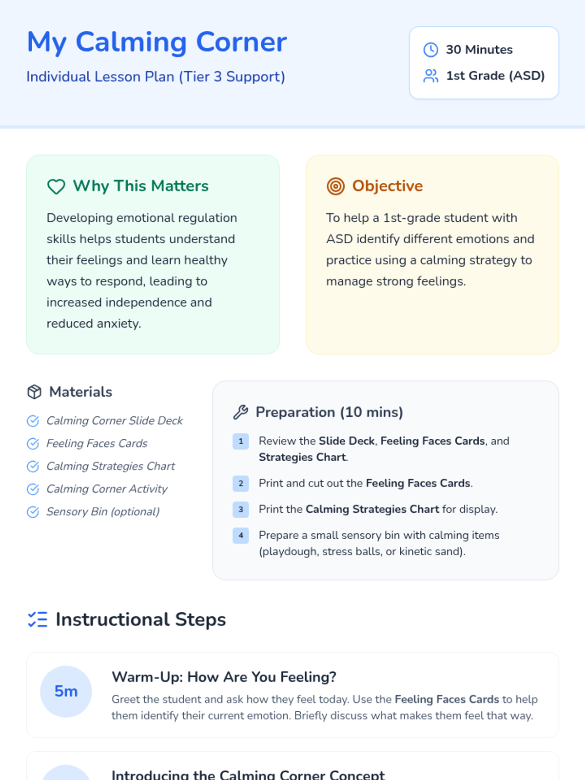 This 30-minute individual lesson helps a 1st-grade student with ASD develop emotional regulation skills by identifying feelings and using calming strategies. It's important for fostering self-awareness and independent coping mechanisms.