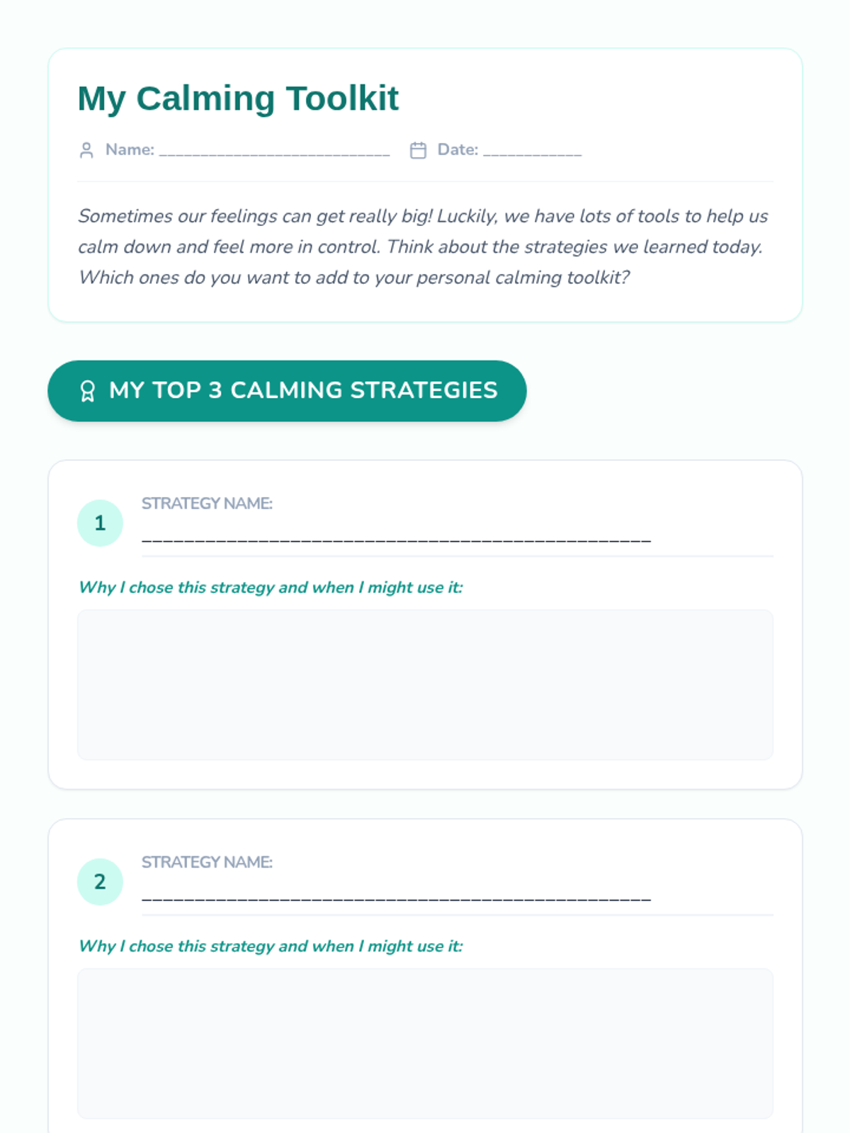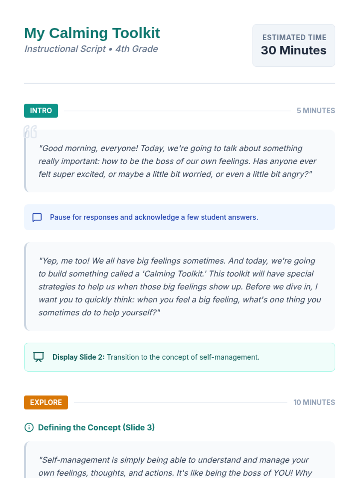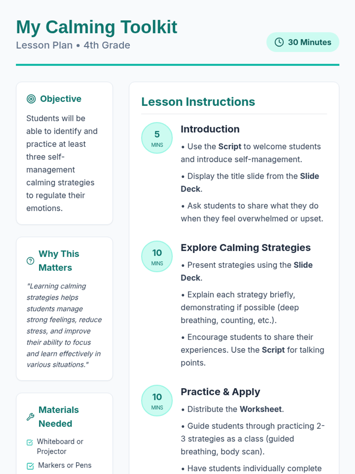 This lesson introduces 4th-grade students to self-management calming strategies, empowering them to identify and utilize tools to regulate their emotions and foster a positive classroom environment.