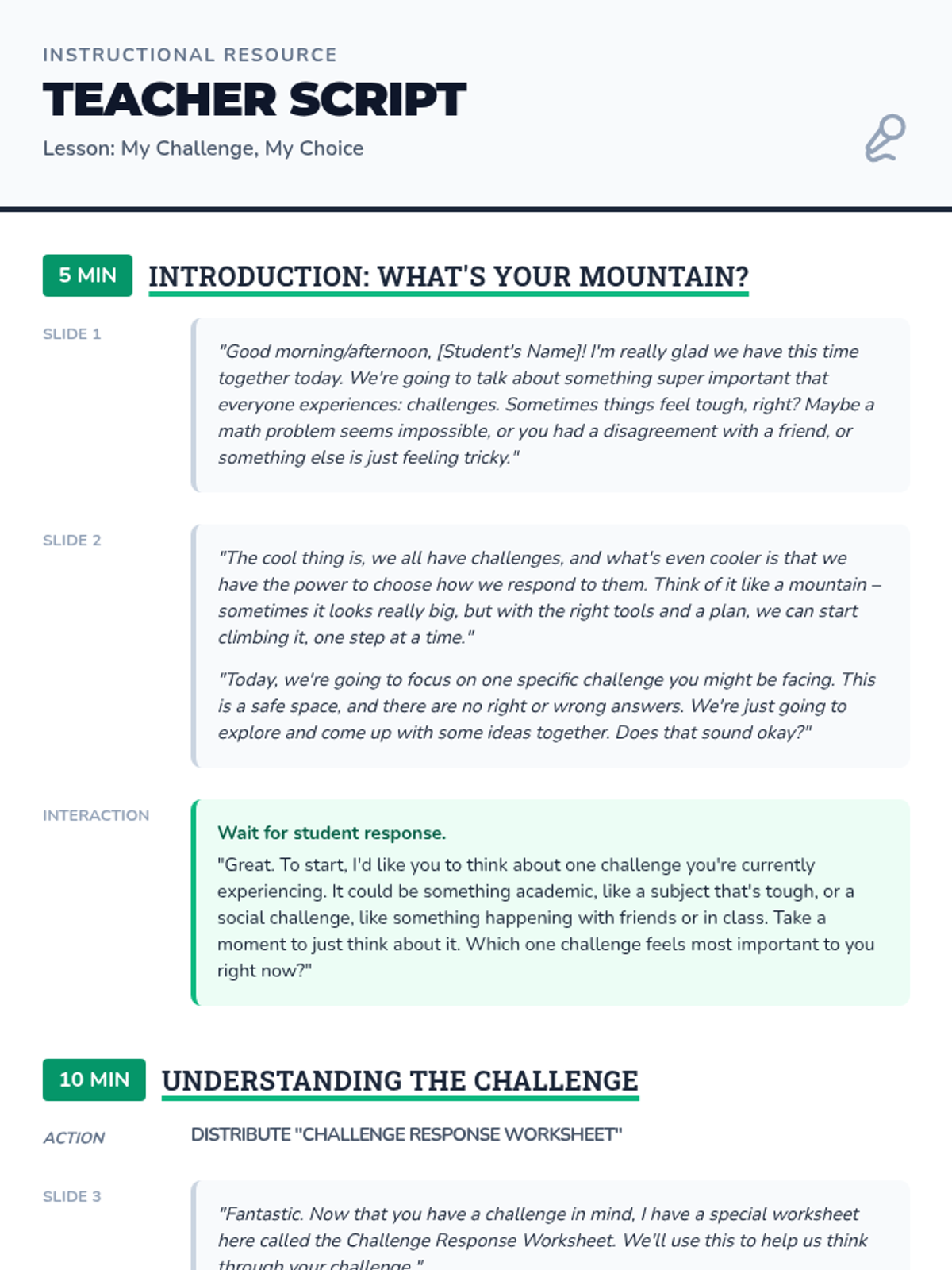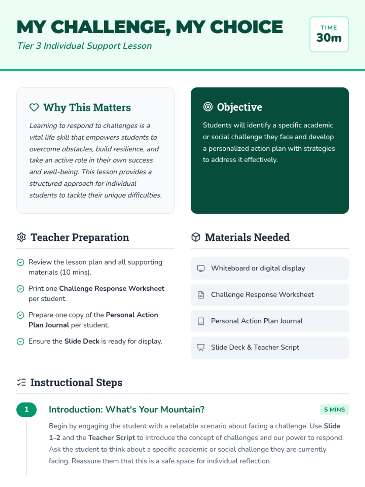 A 30-minute Tier 3 individual lesson for 5th-grade students to develop personalized strategies for navigating academic and social challenges through reflection and action planning.