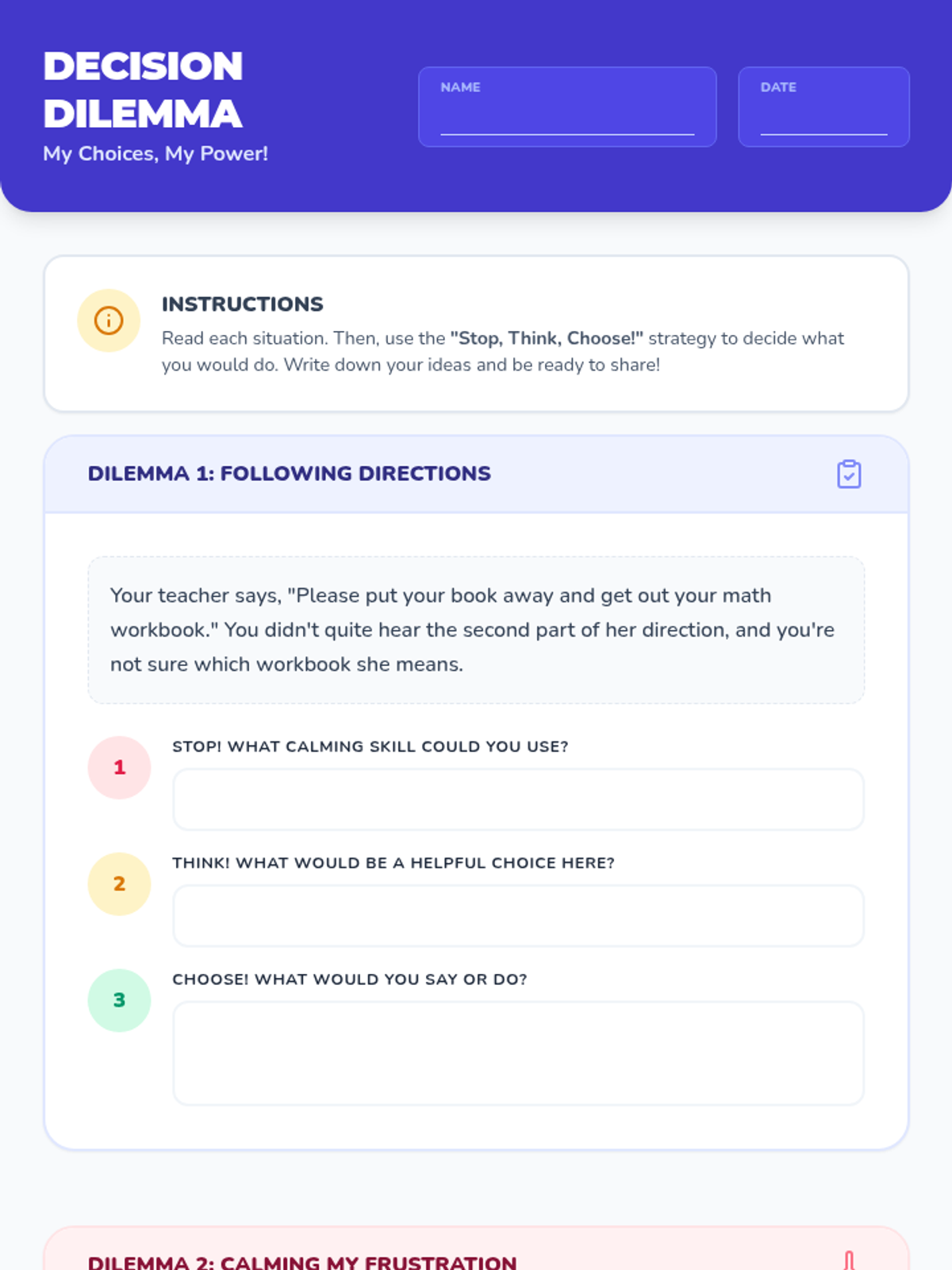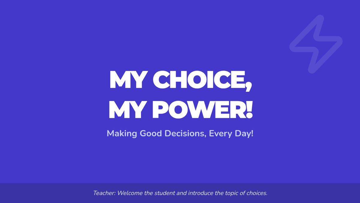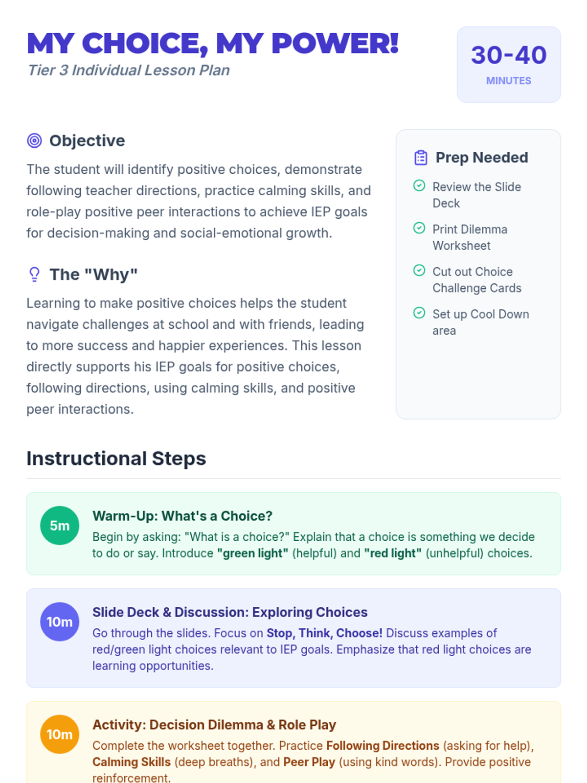 A 30-minute Tier 3 individual lesson for a 3rd-grade student to develop decision-making skills using the 'Stop, Think, Choose!' strategy. The lesson covers identifying positive choices, following directions, and using calming skills.