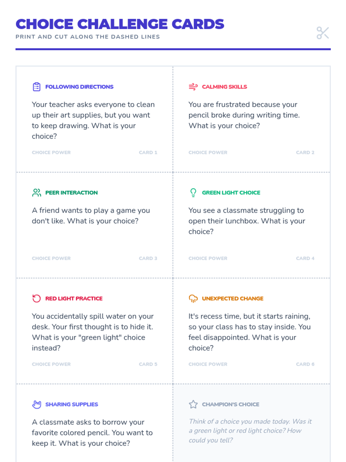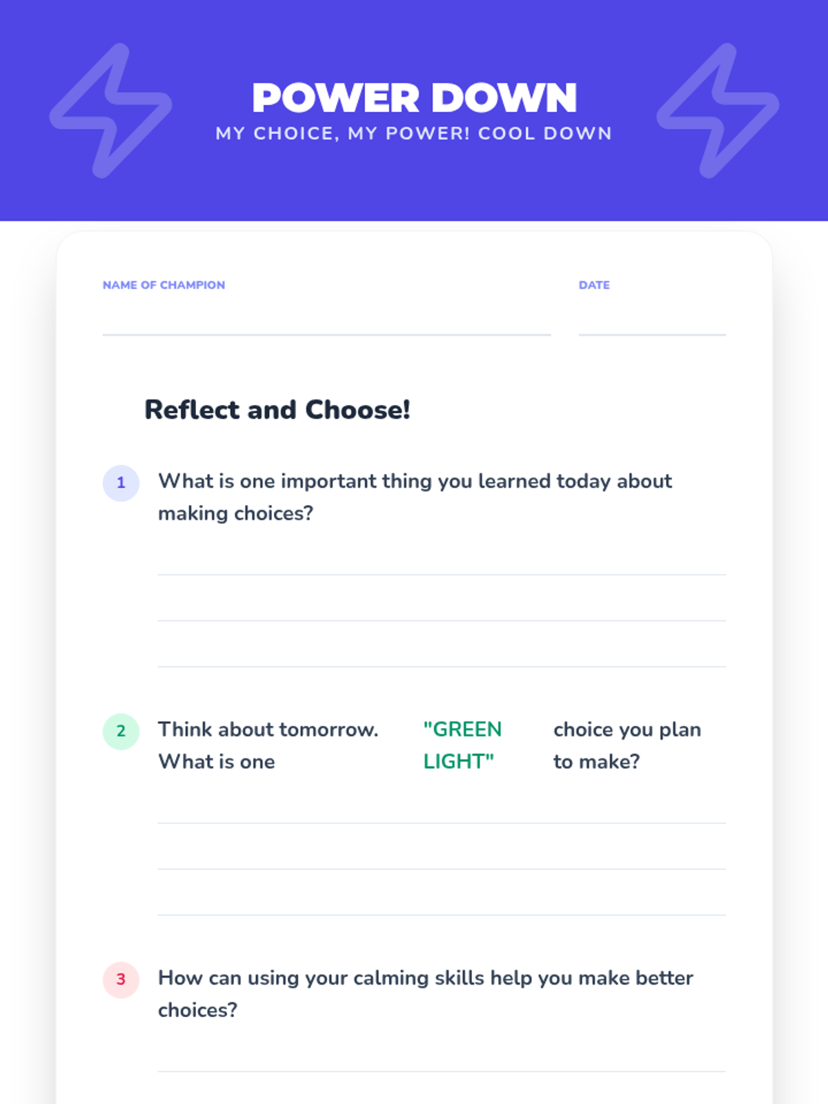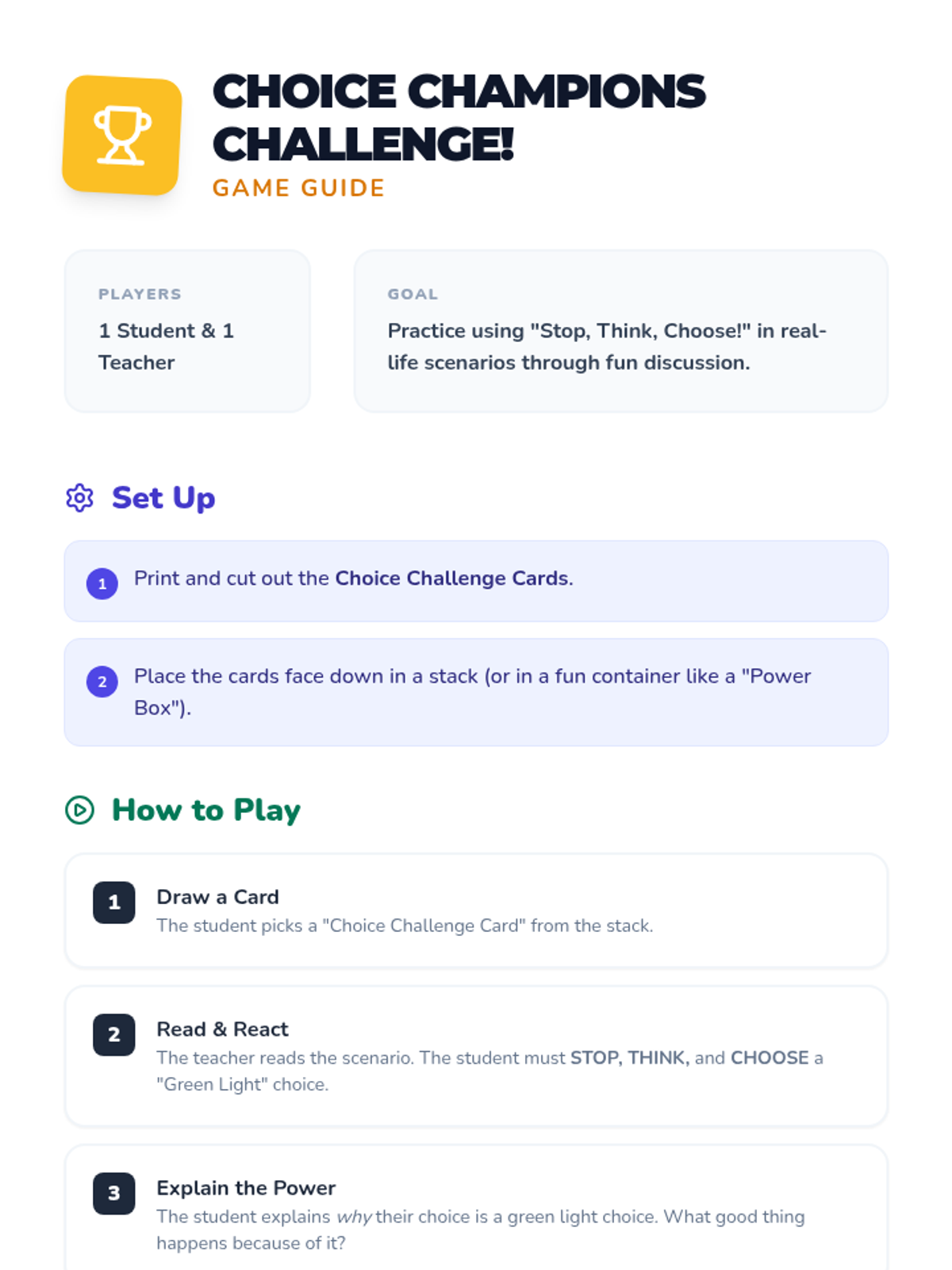 A 30-minute Tier 3 individual lesson for a 3rd-grade student to develop decision-making skills using the 'Stop, Think, Choose!' strategy. The lesson covers identifying positive choices, following directions, and using calming skills.