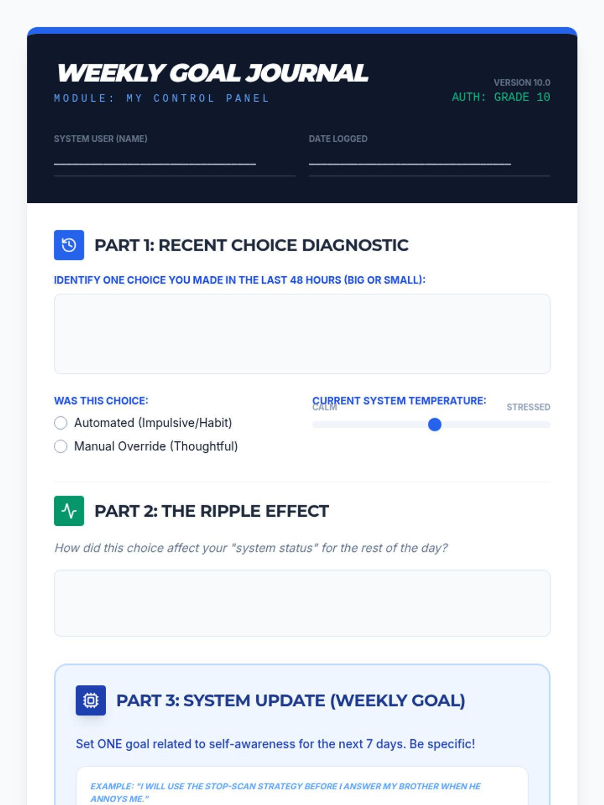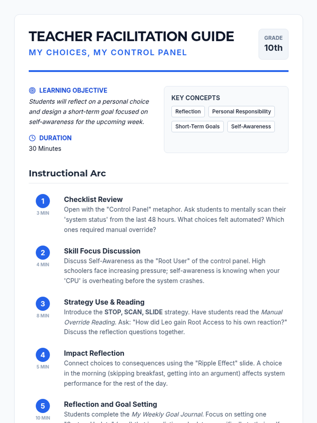 A 30-minute high school lesson focused on self-awareness and personal responsibility through the metaphor of a digital control panel. Students reflect on past choices and set actionable short-term goals.