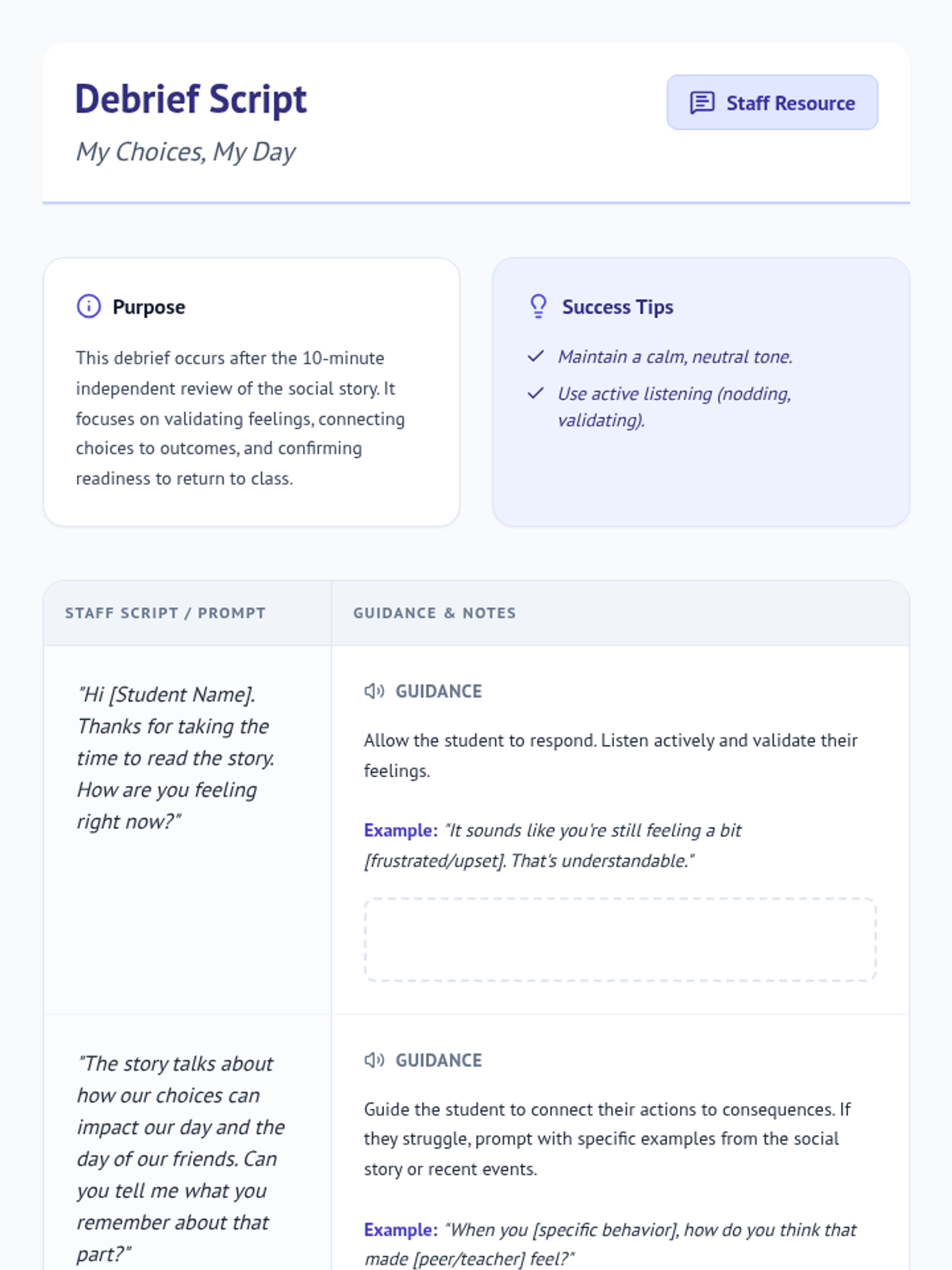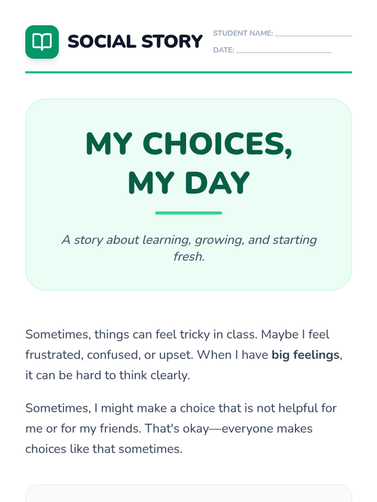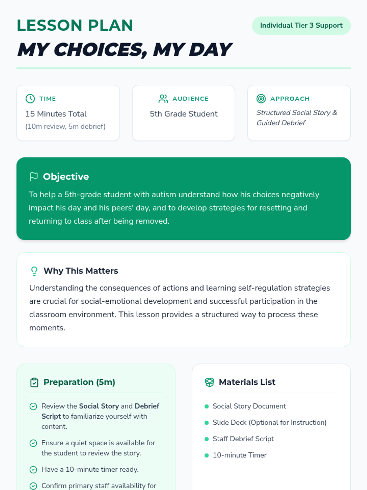 This Tier 3 social story lesson helps a 5th-grade student with autism understand the impact of their choices on themselves and peers, while providing a structured 'reset' process for returning to the classroom after a behavioral incident.