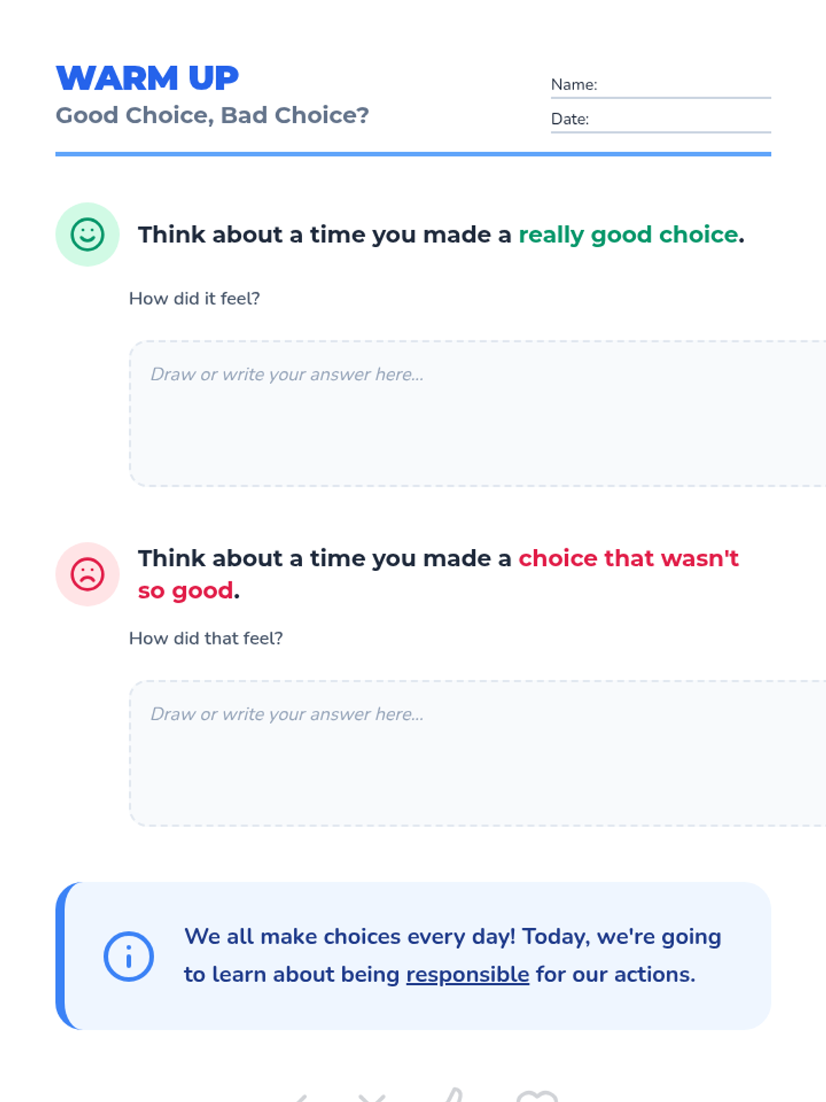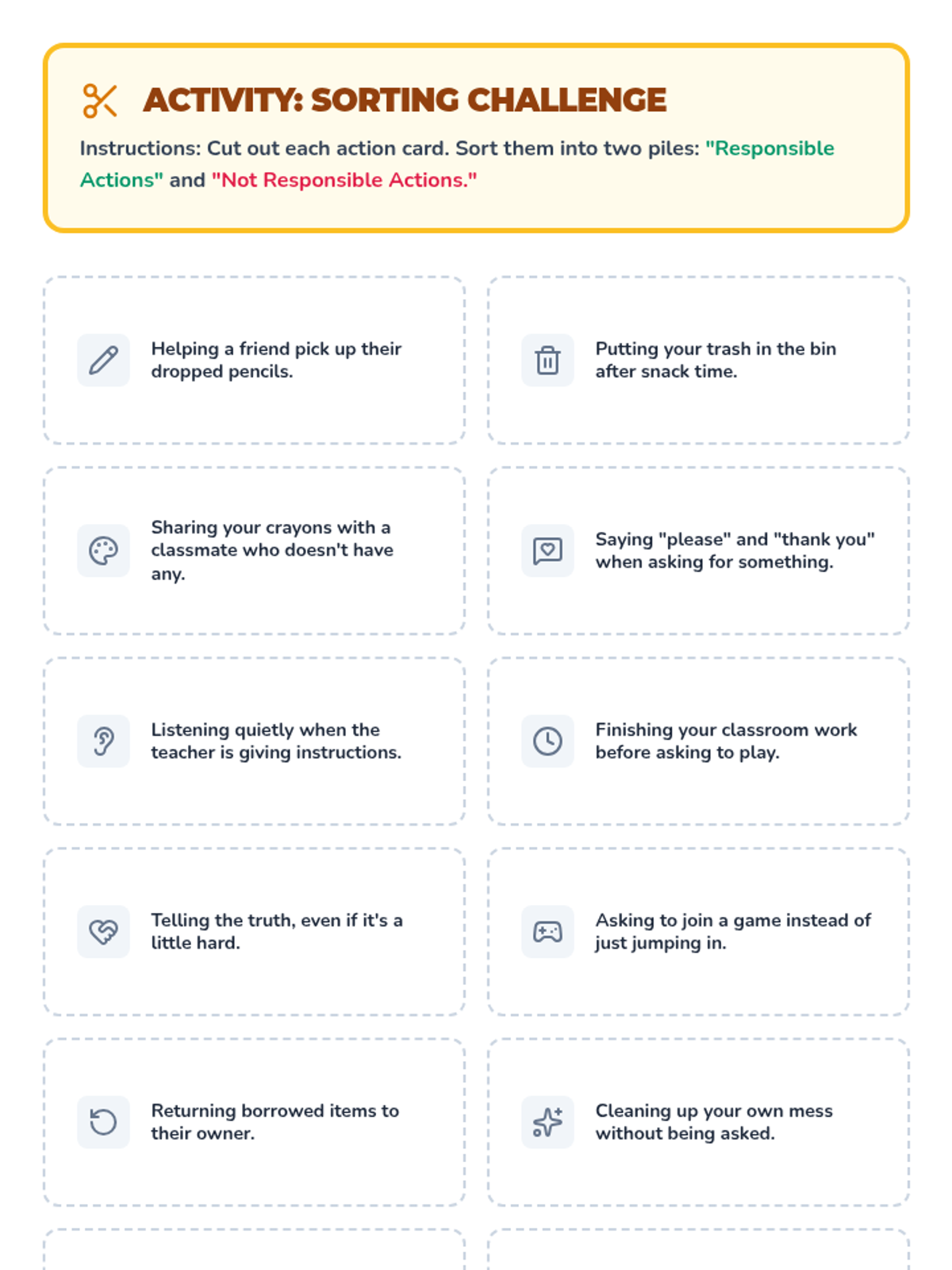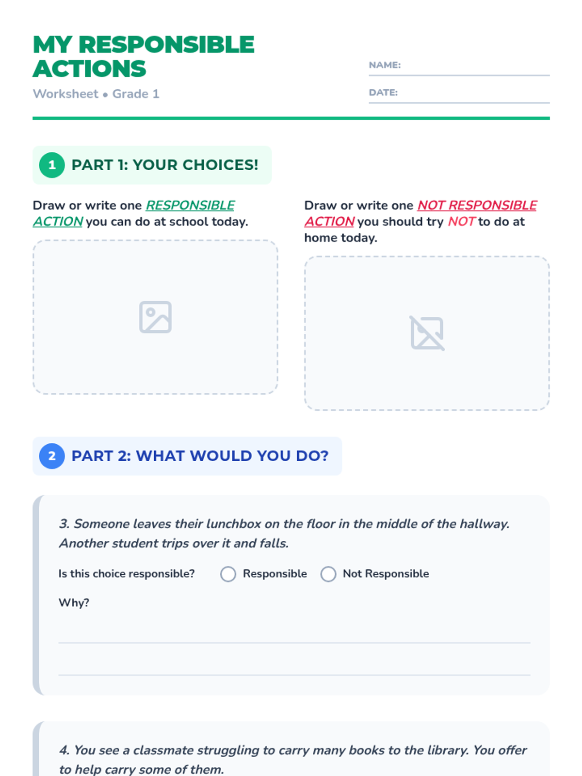 This lesson helps 1st-grade students understand and identify responsible and not responsible actions. By learning about the impact of their choices, students will develop a foundation for positive behavior and social-emotional growth.