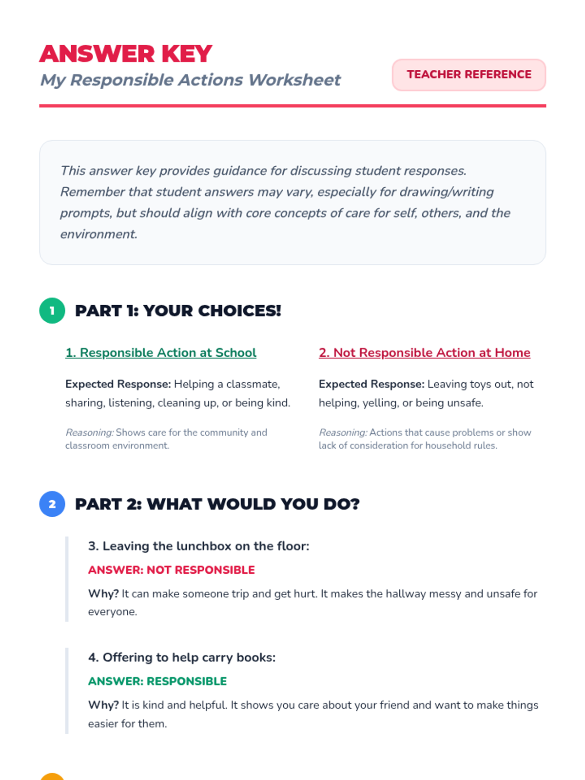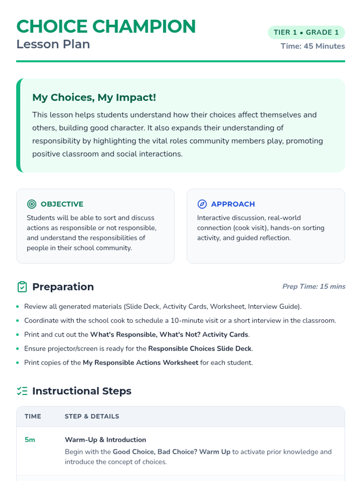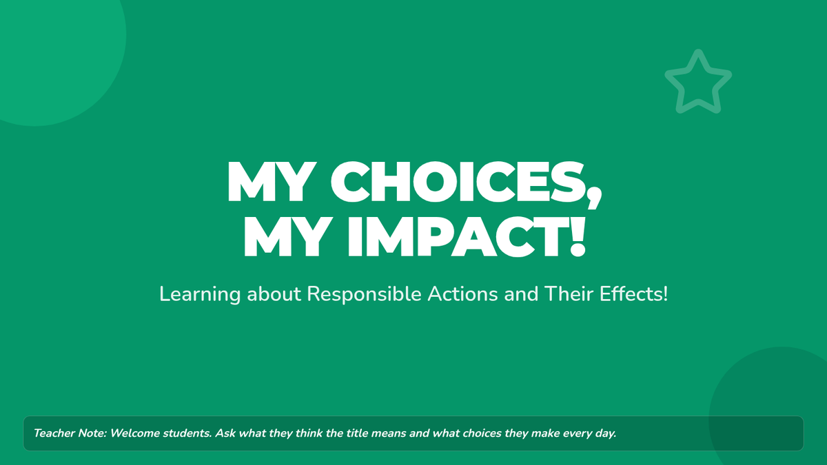 This lesson helps 1st-grade students understand and identify responsible and not responsible actions. By learning about the impact of their choices, students will develop a foundation for positive behavior and social-emotional growth.