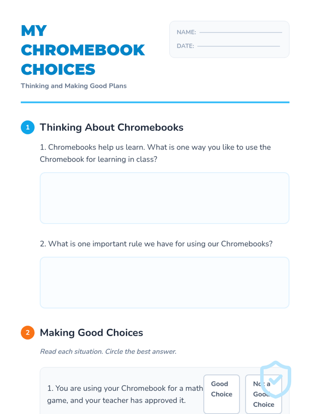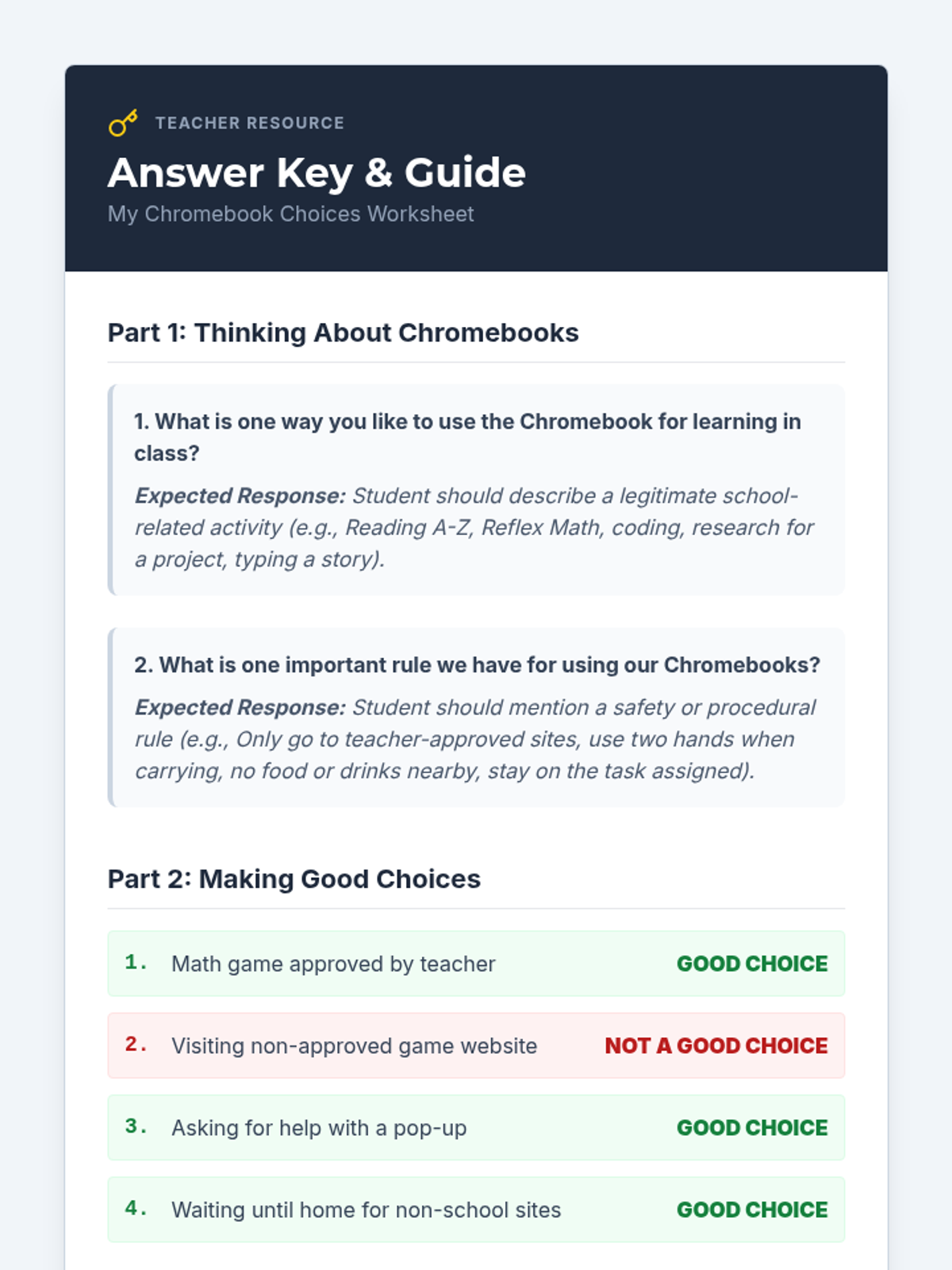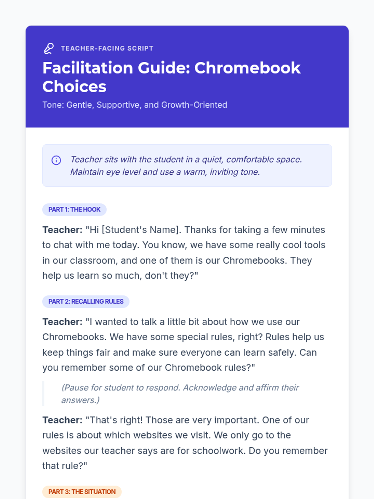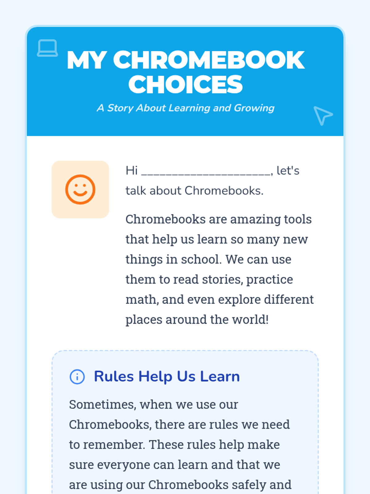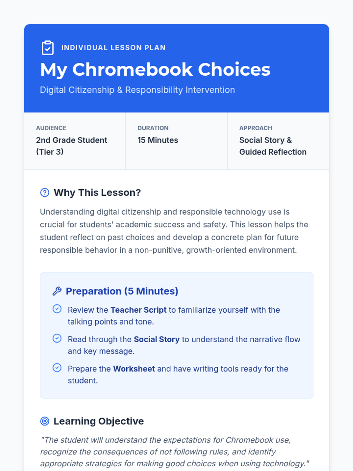 A Tier 3 social story and reflection lesson designed to help a 2nd-grade student understand the importance of following digital citizenship rules and how to regain Chromebook privileges through responsible choices.