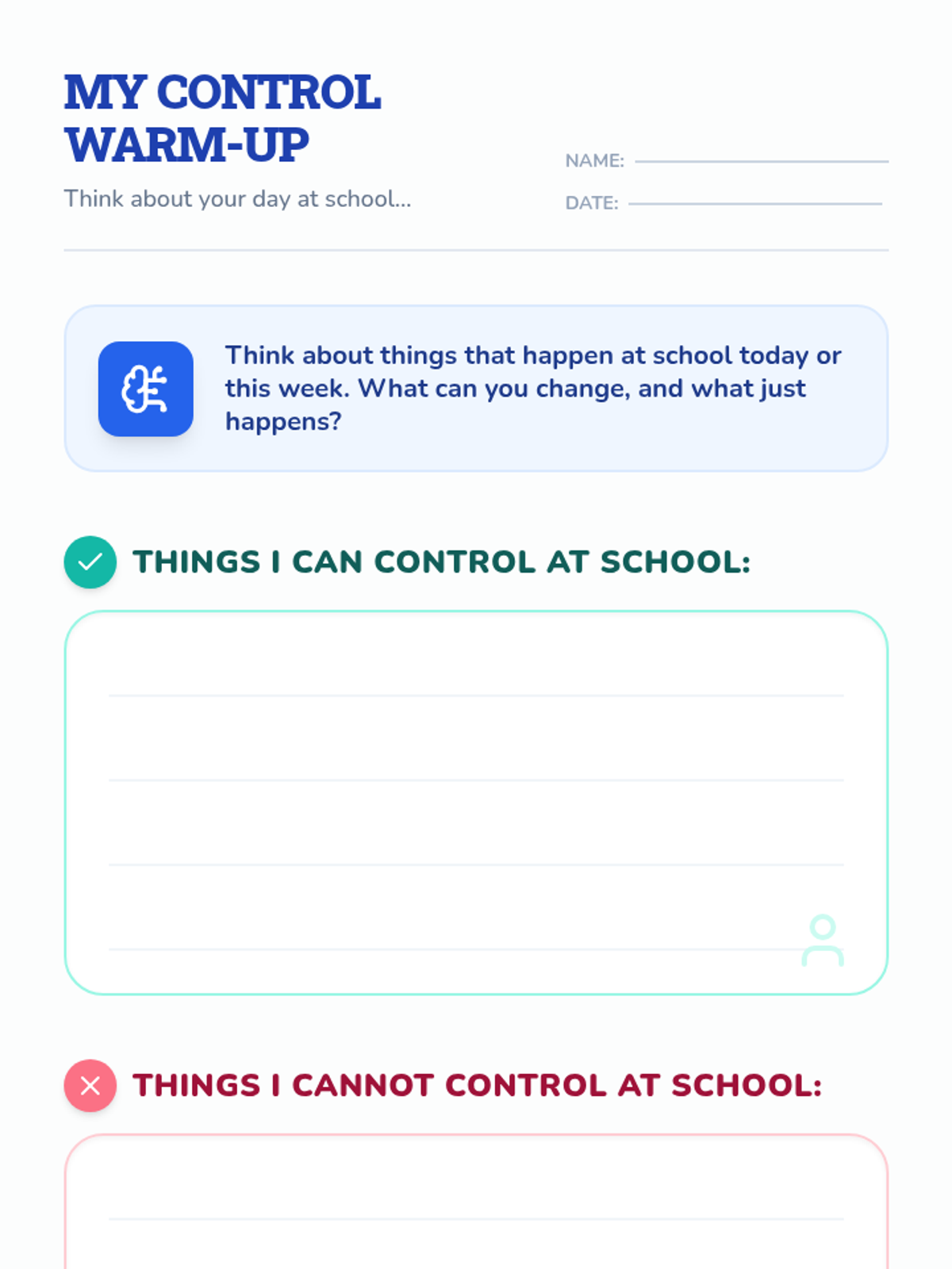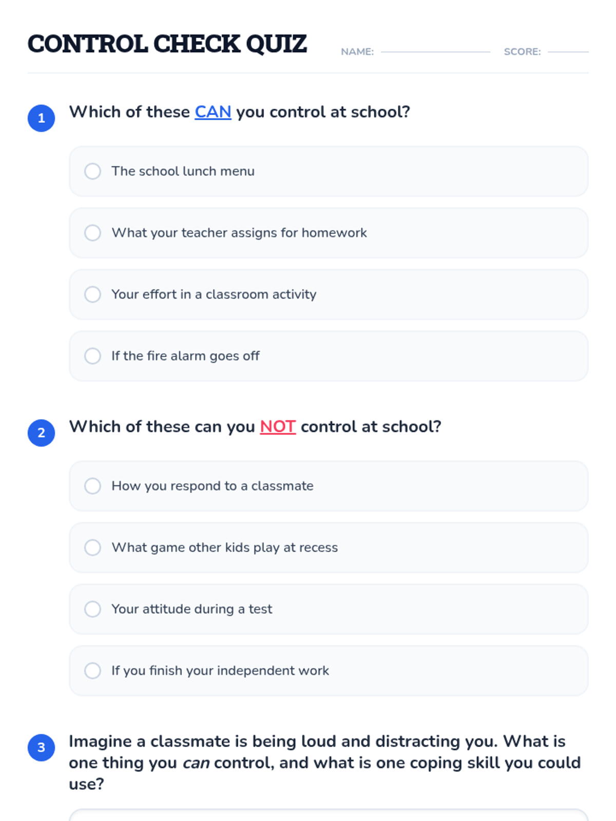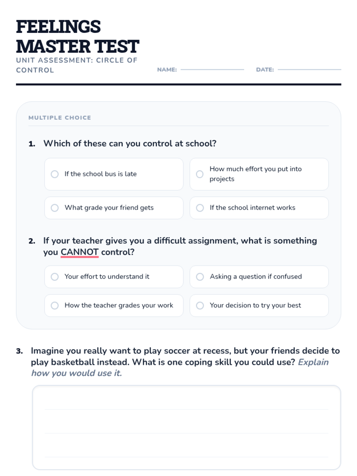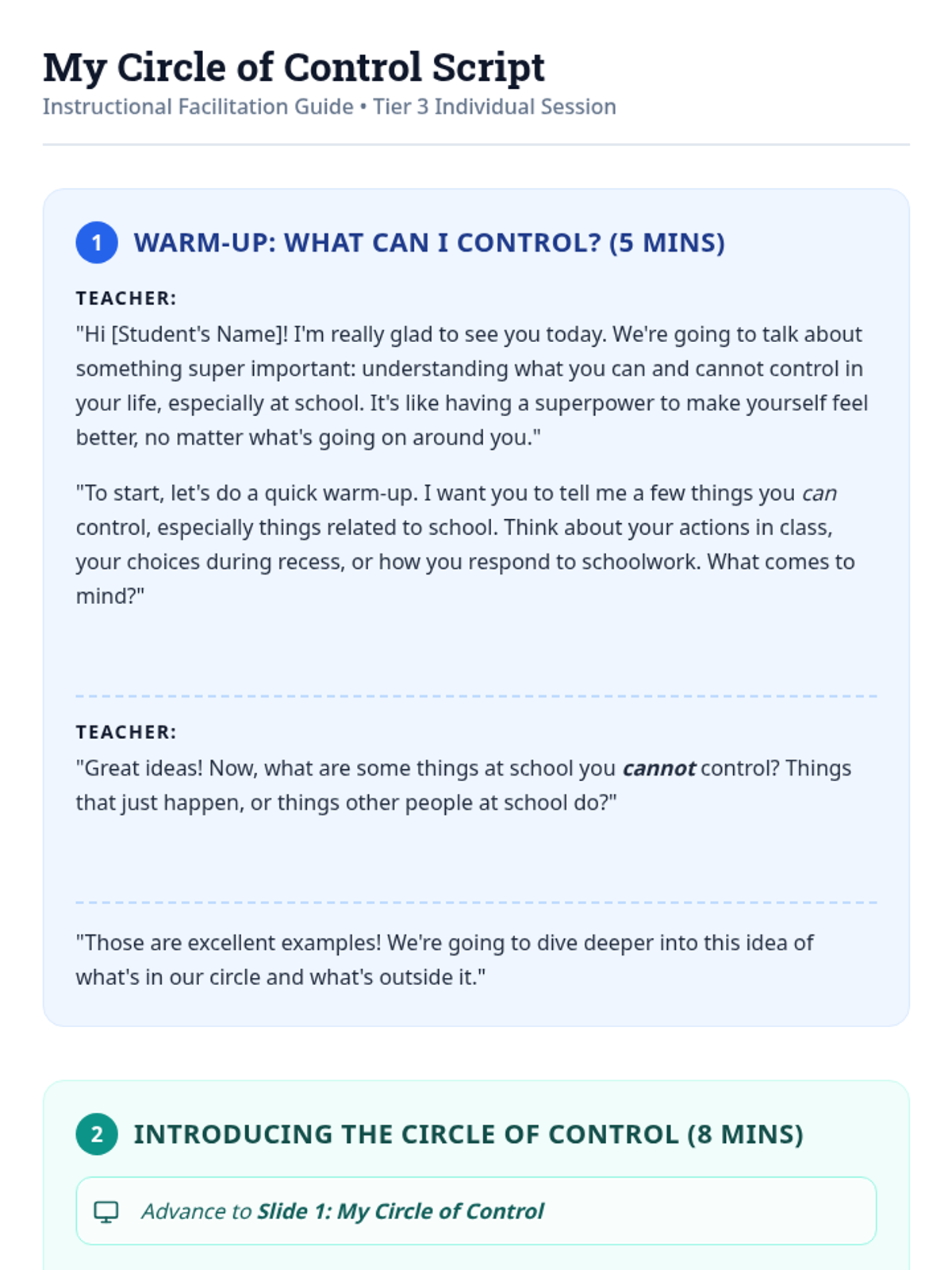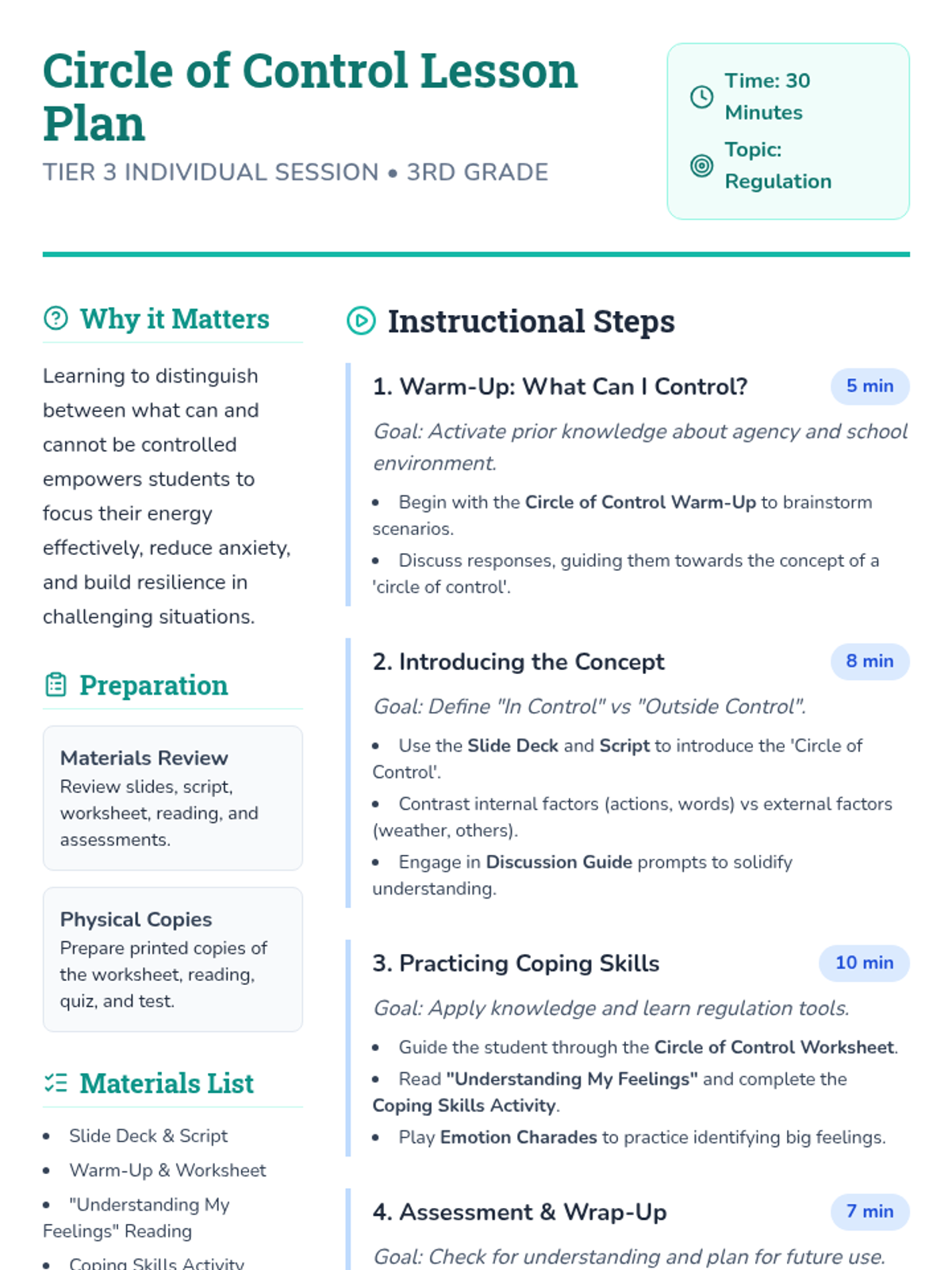 This individual Tier 3 lesson helps 3rd-grade students understand what they can and cannot control, developing acceptance and tolerance skills for emotional regulation. Through interactive discussion and practice, students learn to focus their energy on things they can change and use coping skills for things they cannot.