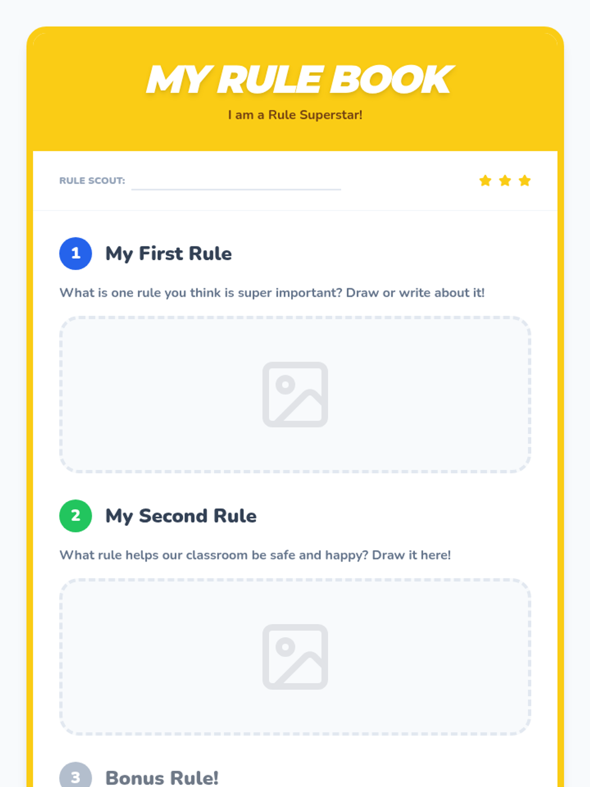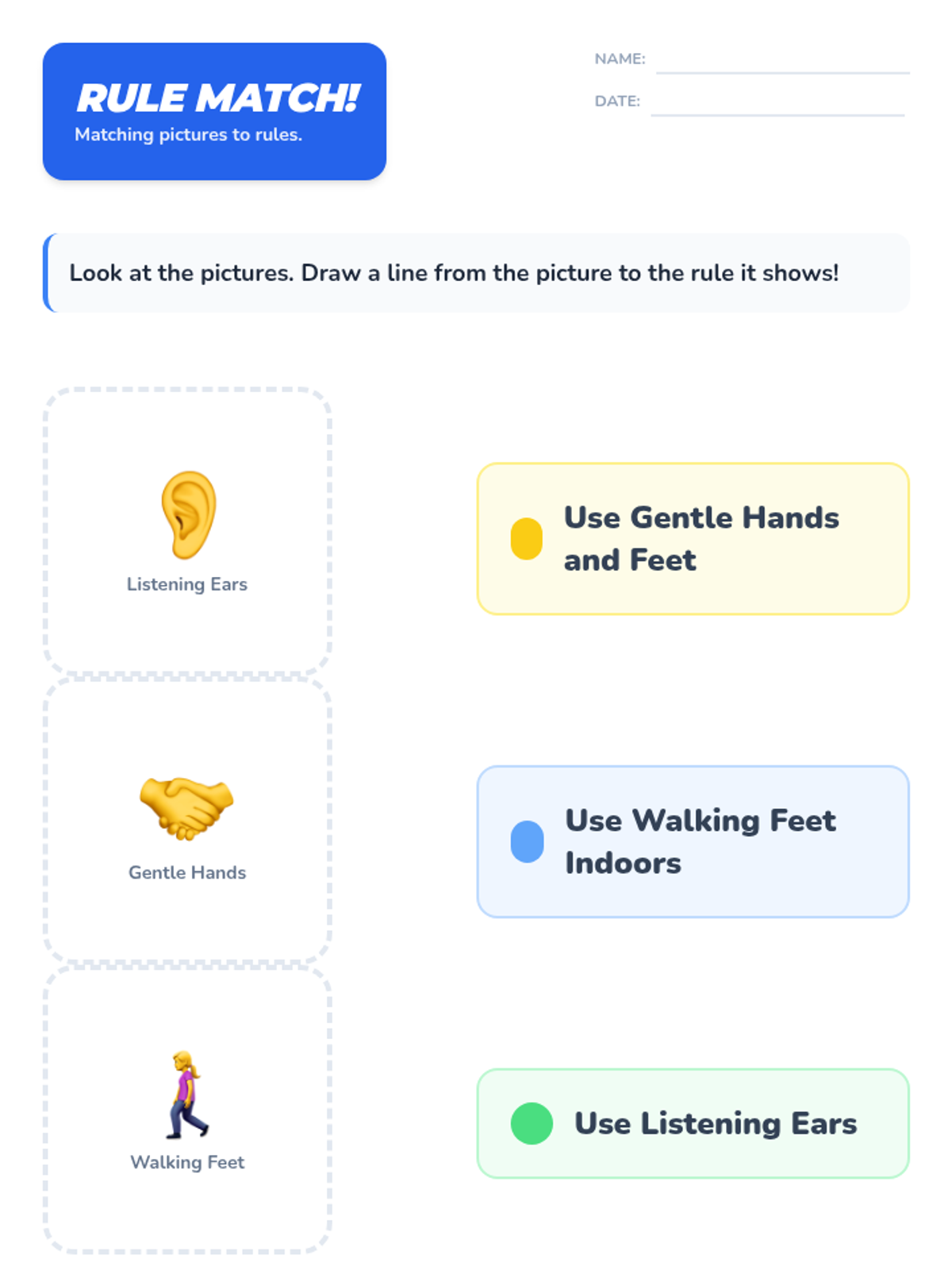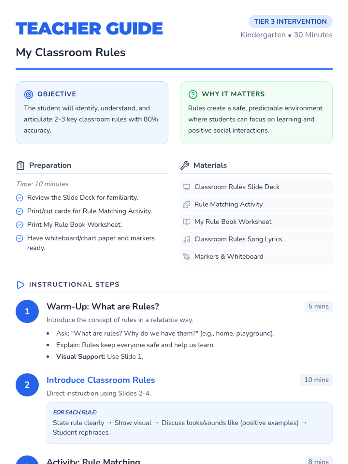 A 30-minute, one-on-one Tier 3 lesson for Kindergarten students to identify and understand key classroom rules through visual aids, interactive matching, and creative expression.