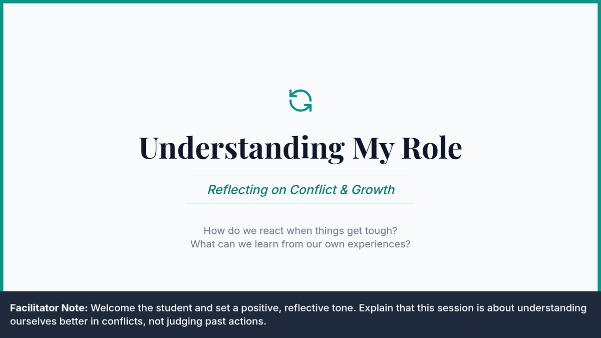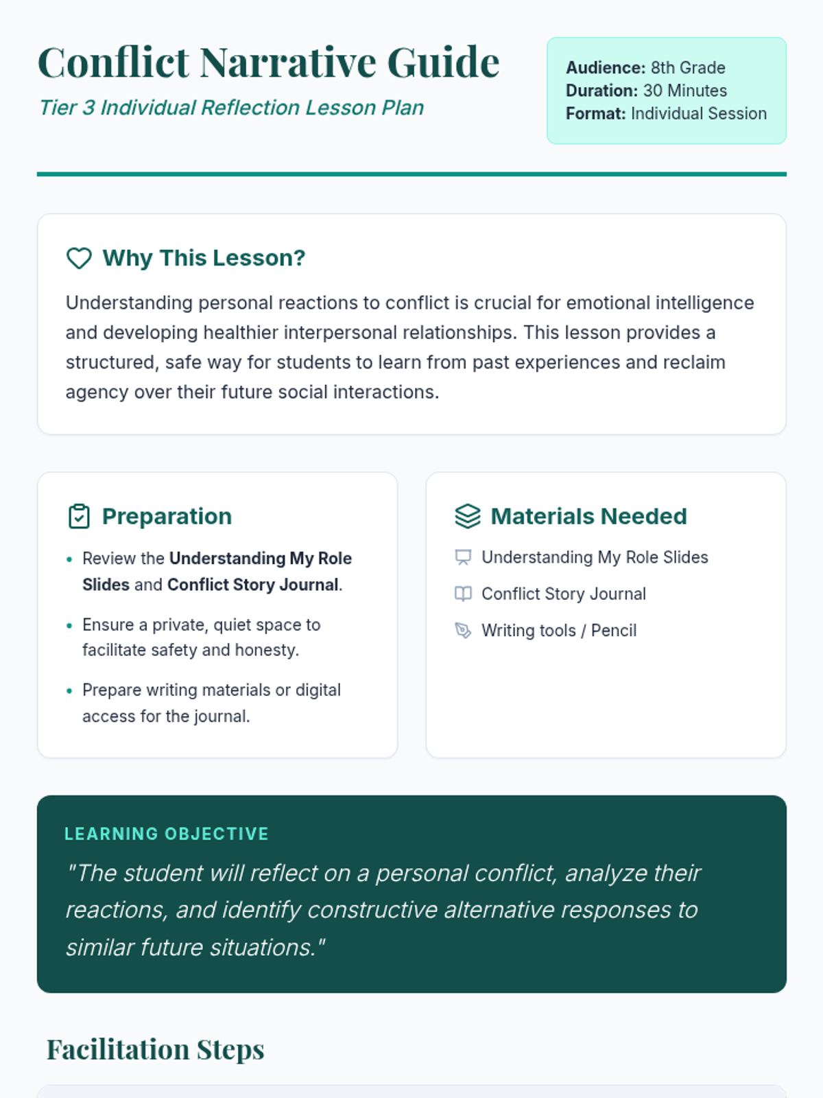 A Tier 3 individual lesson designed for 8th-grade students to reflect on personal conflict, analyze their reactions, and develop constructive future strategies. This session fosters emotional intelligence and self-awareness through guided narrative reflection.