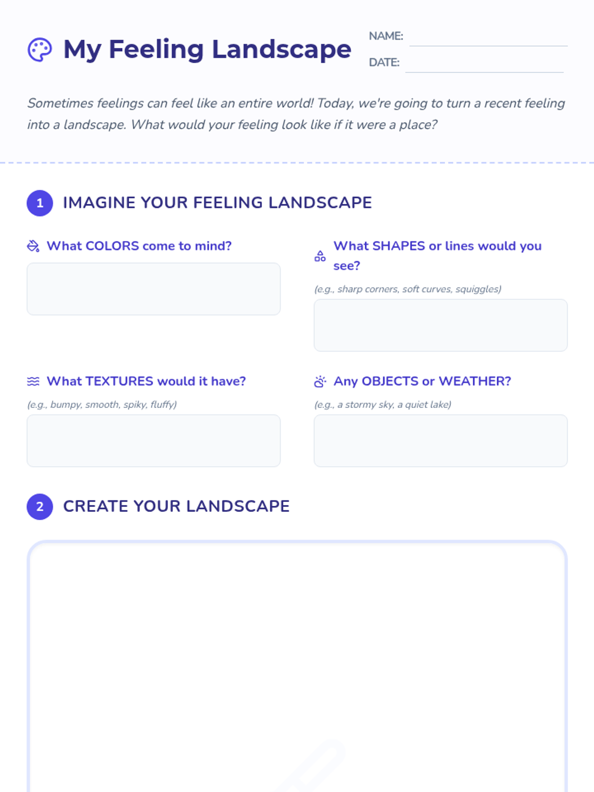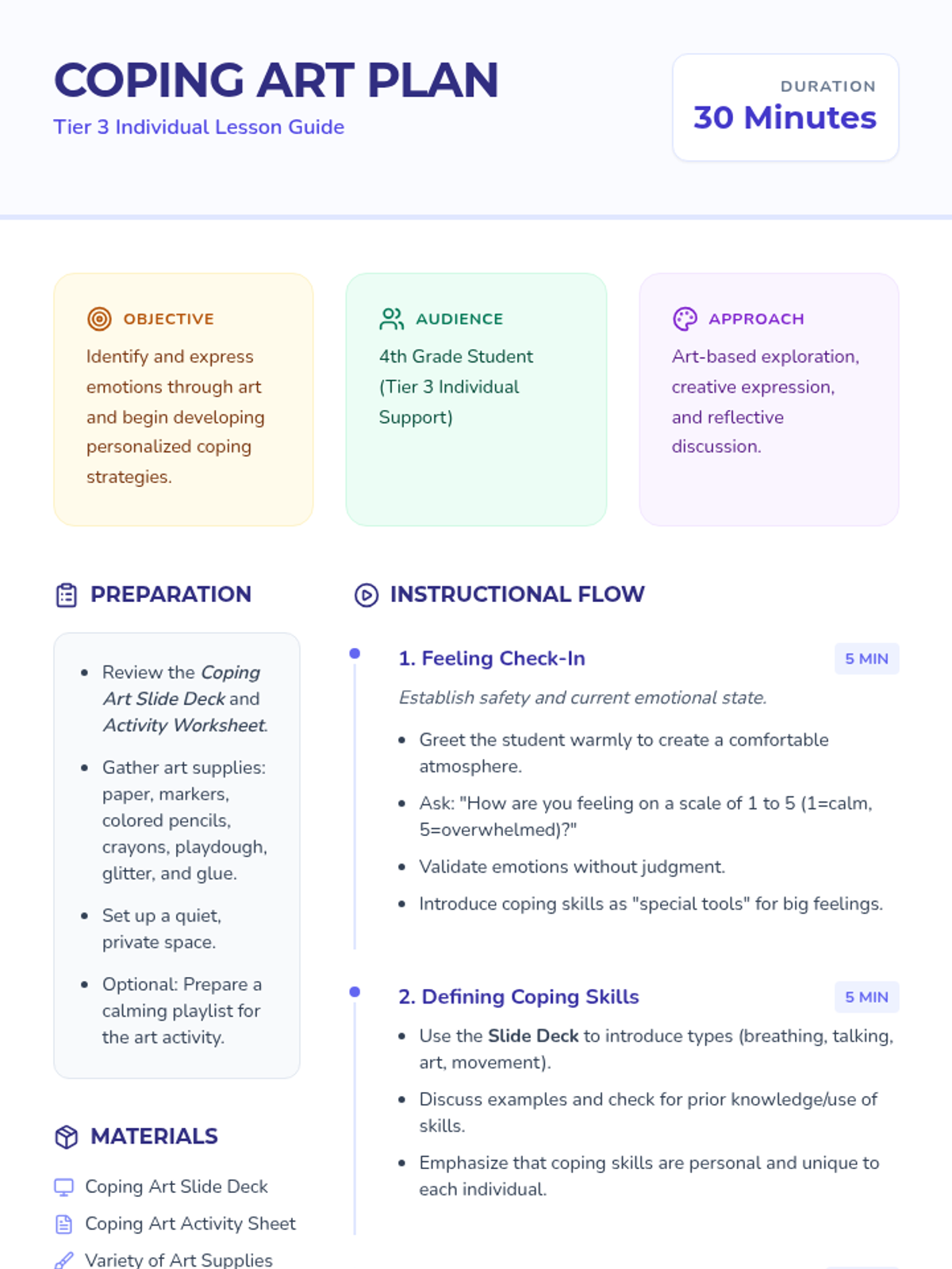A 30-minute individual Tier 3 lesson for 4th-grade students to explore emotions and develop coping strategies through creative art-making. Students create a 'Feeling Landscape' to visualize their emotions and identify personal tools for self-regulation.