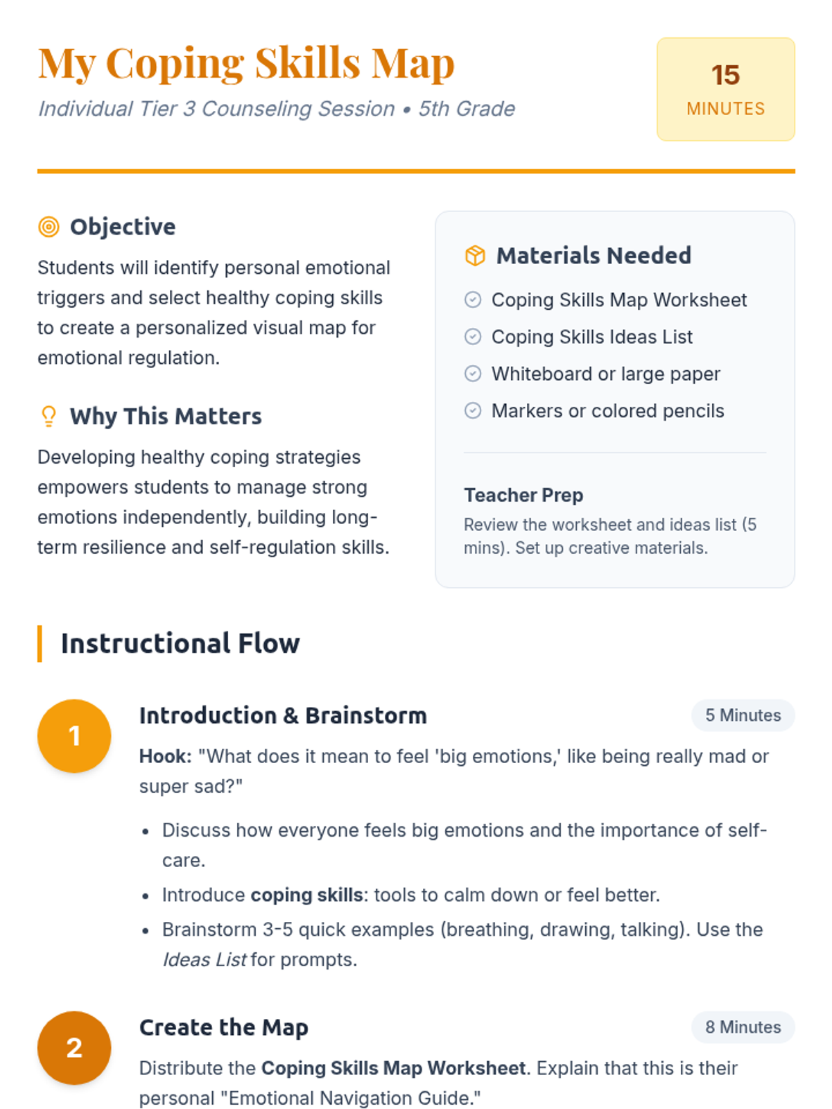 A personalized Tier 3 lesson for 5th graders to identify emotional triggers and develop a visual map of healthy coping strategies. This 15-minute individual session focuses on emotional regulation and resilience.