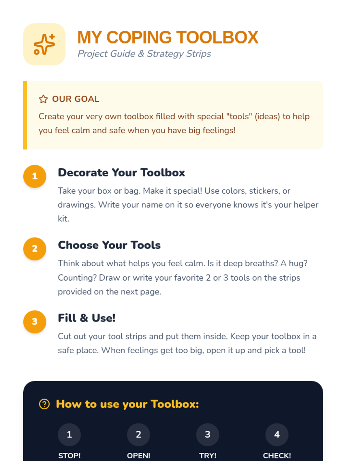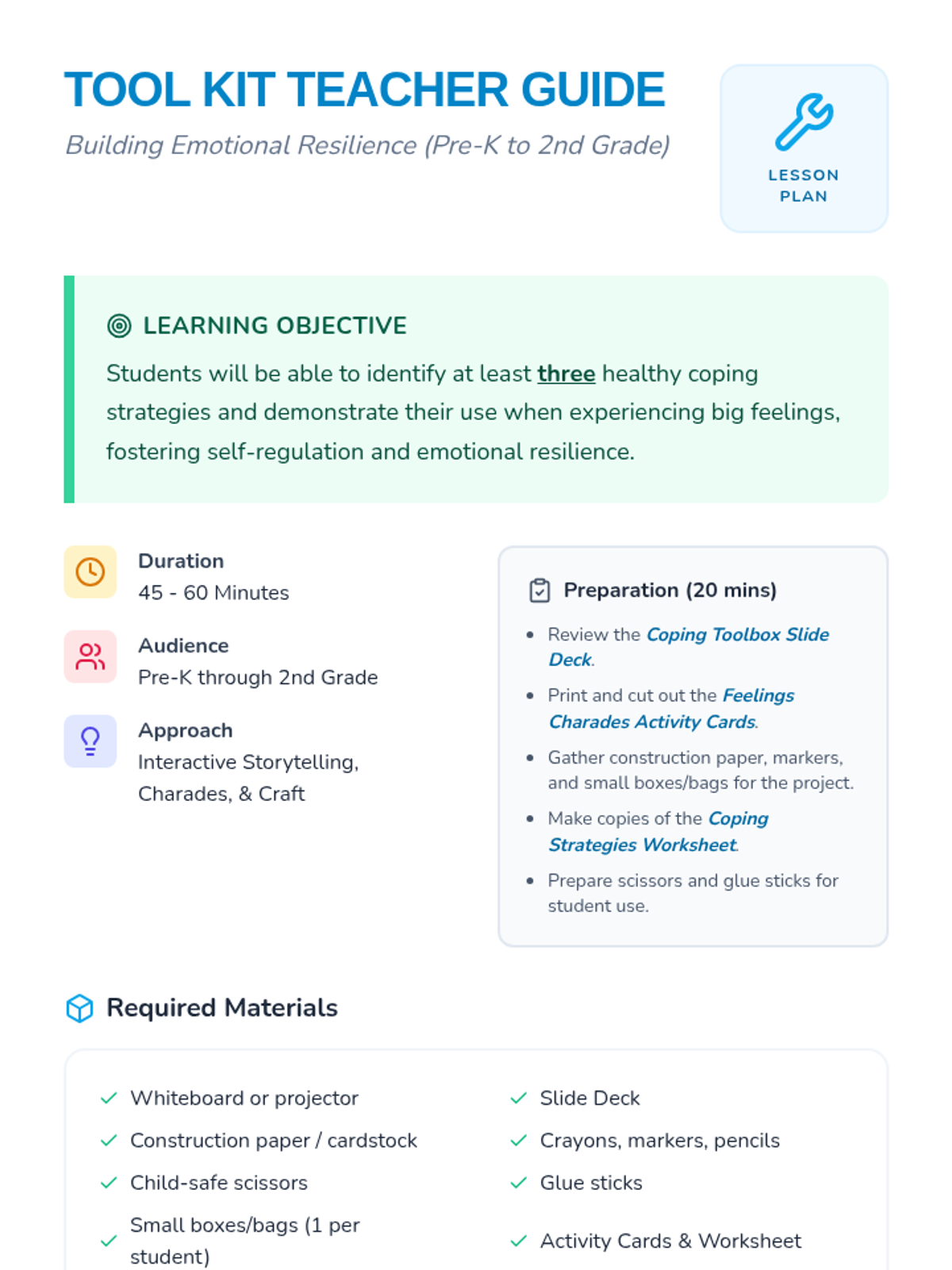 A social-emotional learning lesson for Pre-K to 2nd grade focused on identifying big feelings and building a personalized toolbox of self-regulation strategies. Students engage in storytelling, charades, and a hands-on craft to develop emotional resilience.